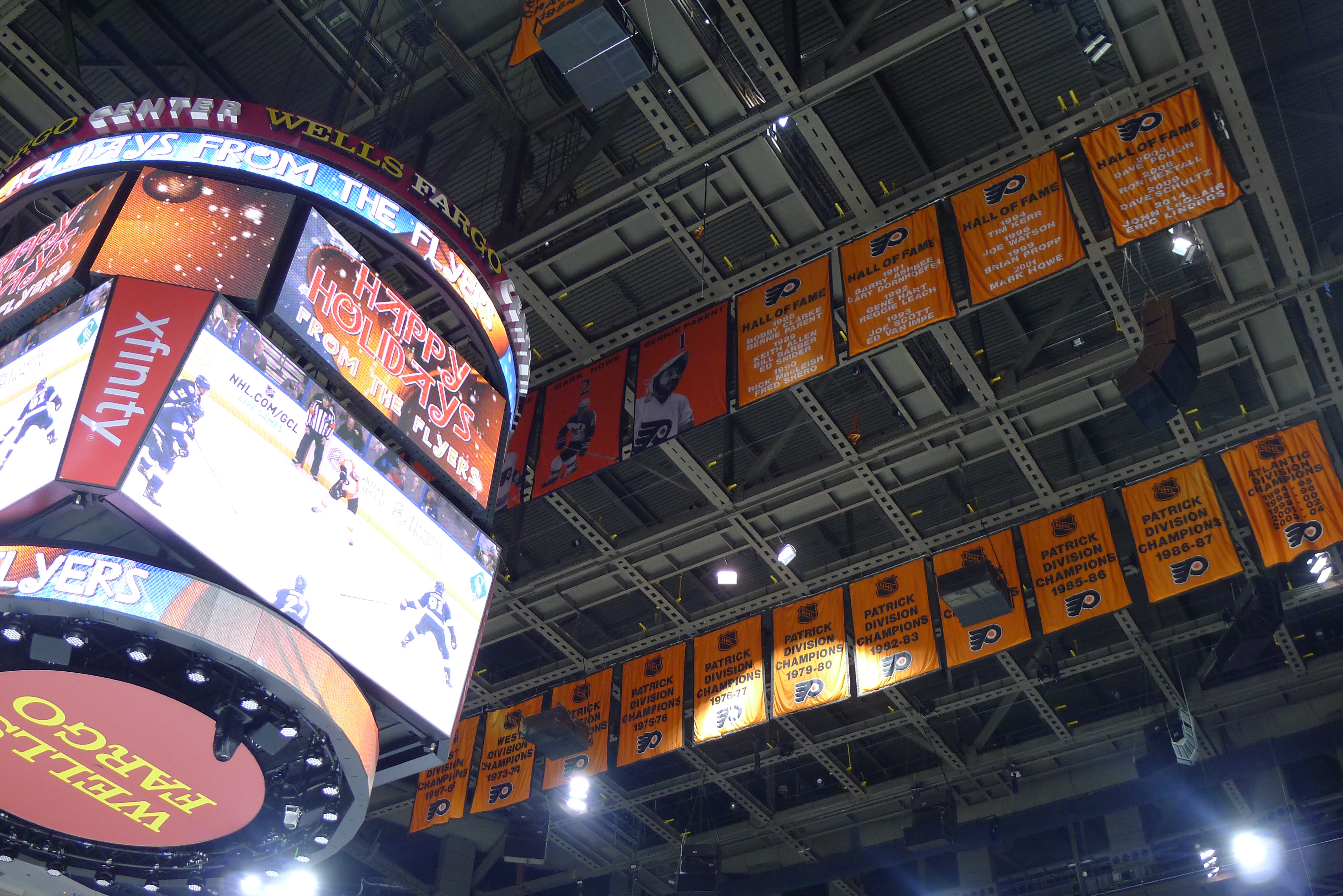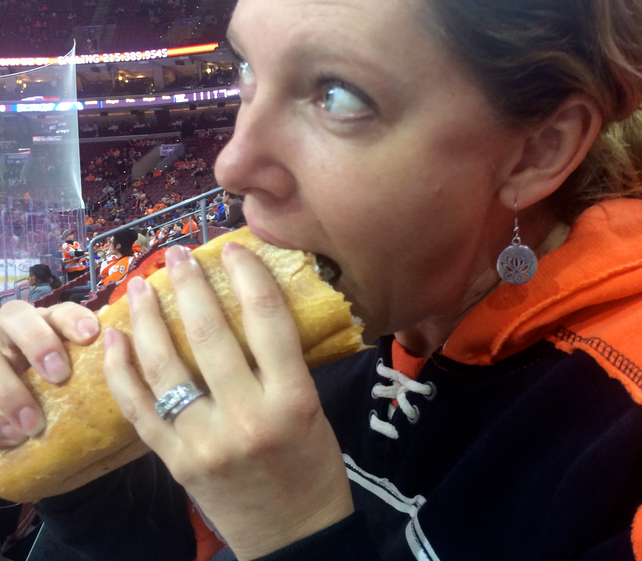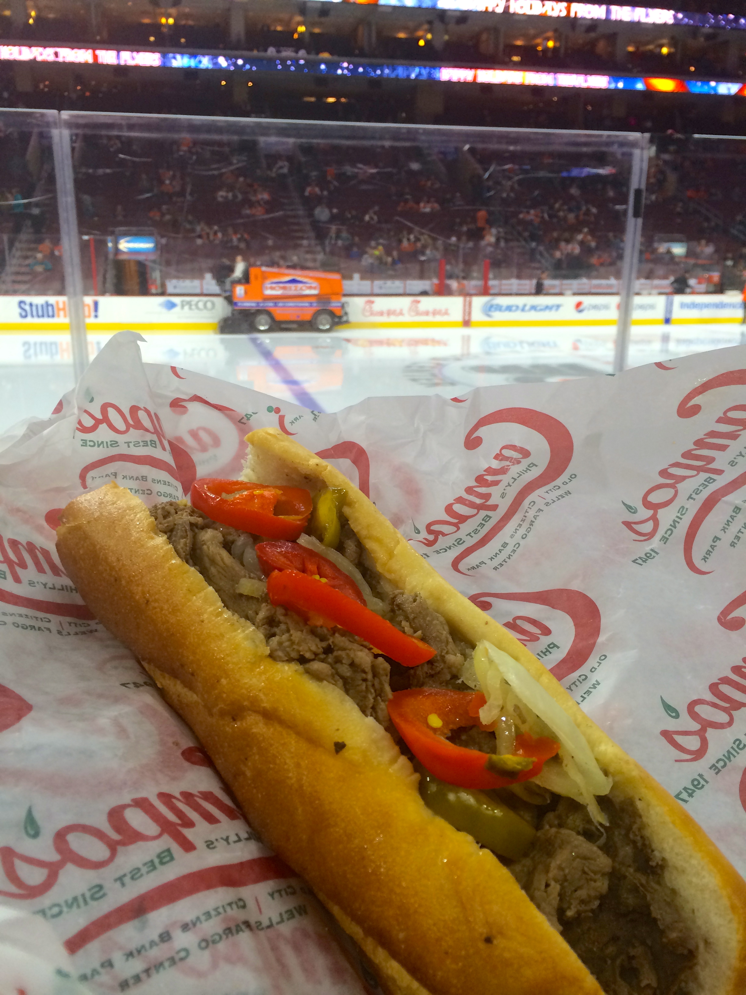 First things first: I figured that a hockey game would be the perfect place to get a good Philadelphia cheesesteak. We picked up a couple of sammies and found our (awesome) seats. I spied the Mark Howe banner above us and watched the Zamboni swirl around the ice.