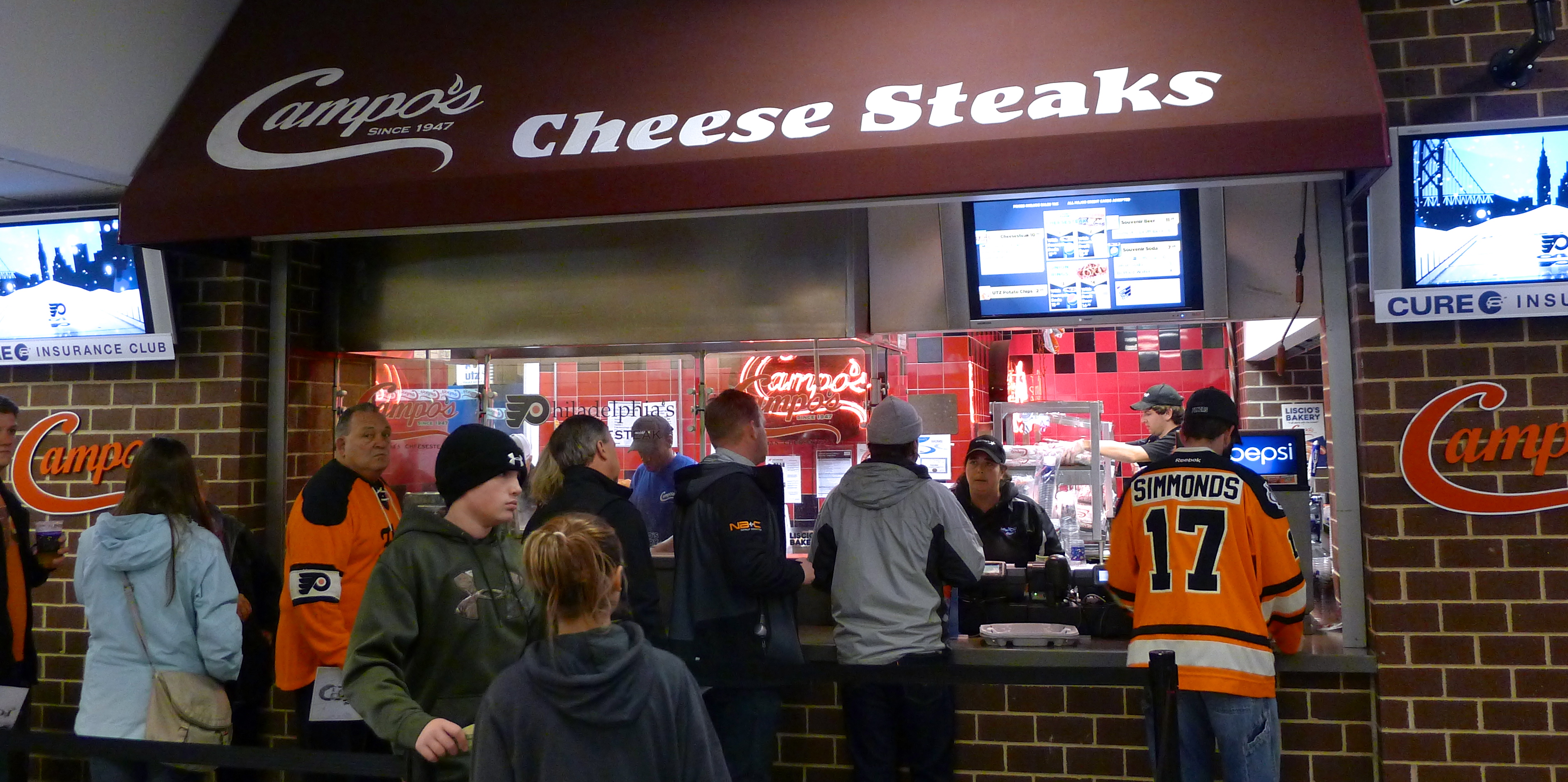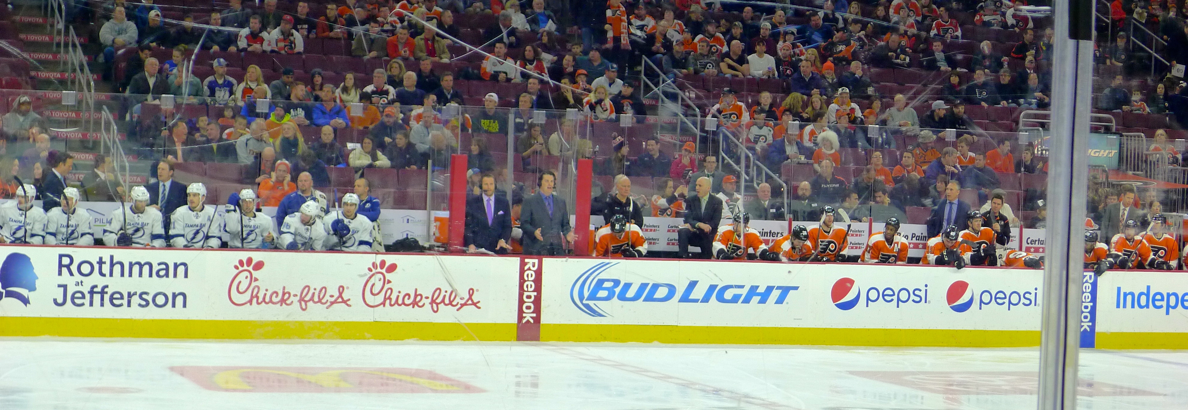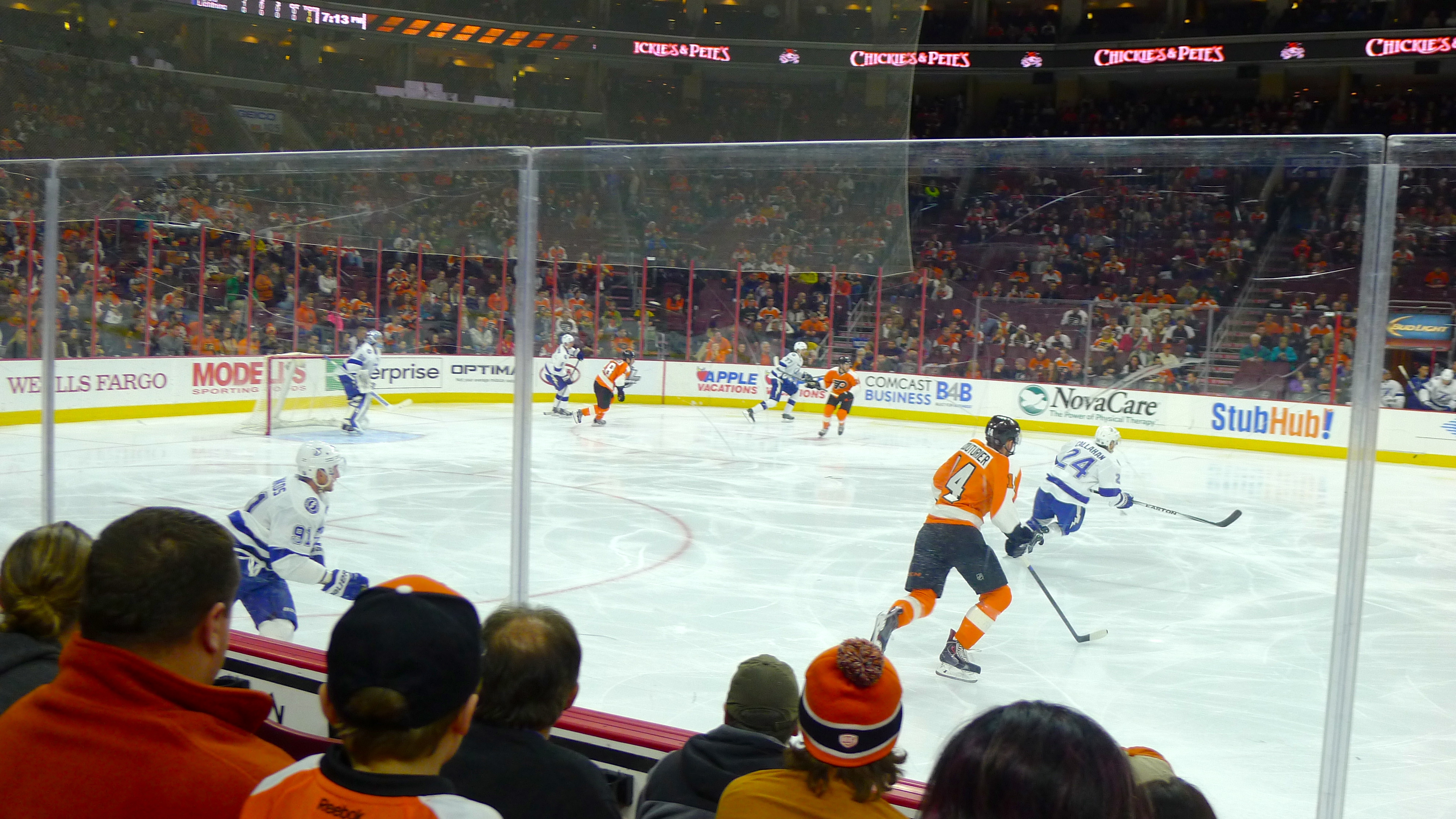 First things first: I figured that a hockey game would be the perfect place to get a good Philadelphia cheesesteak. We picked up a couple of sammies and found our (awesome) seats. I spied the Mark Howe banner above us and watched the Zamboni swirl around the ice.