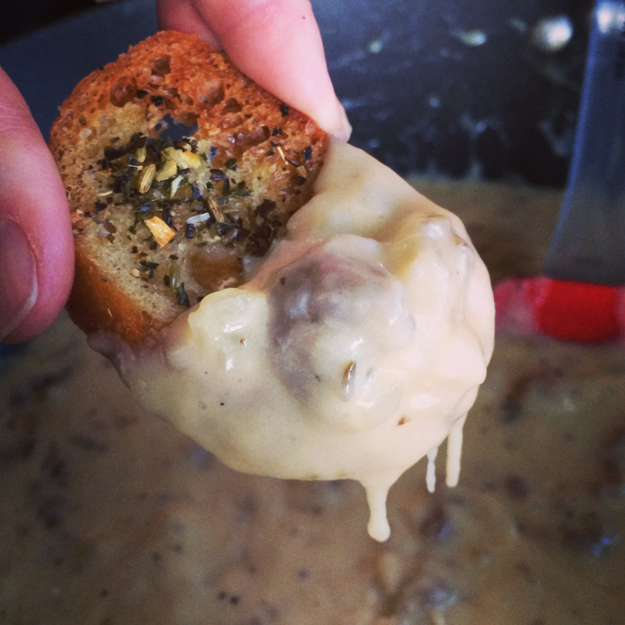 John and I made this fondue last year for our Super Bowl Date. My only complaint then was that the recipe wasn’t appropriate for just two people. The addition of sausage makes this fondue total football food. Set out a bowl with herbed baguettes for dipping. It would be delicious with tortilla chips, too!