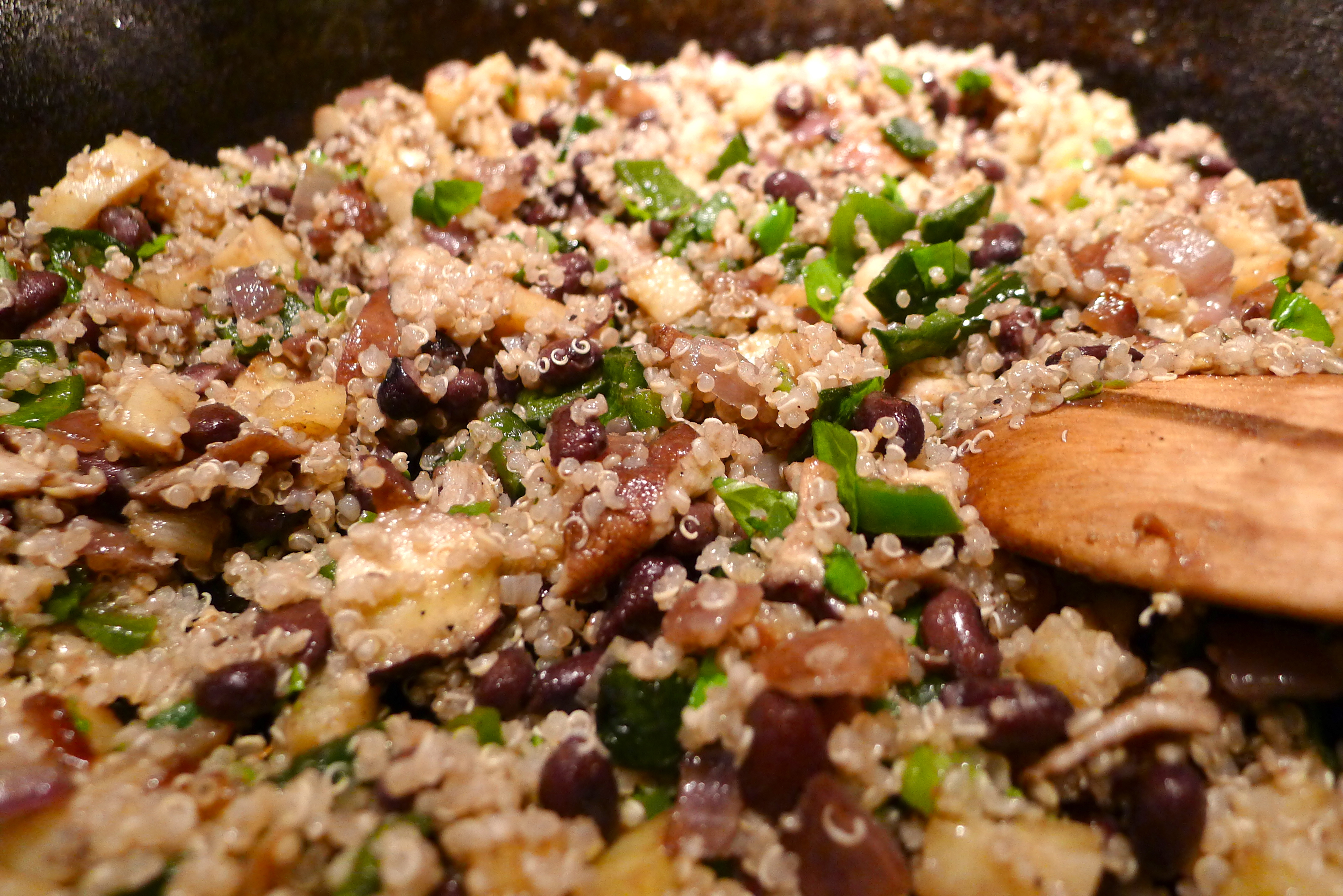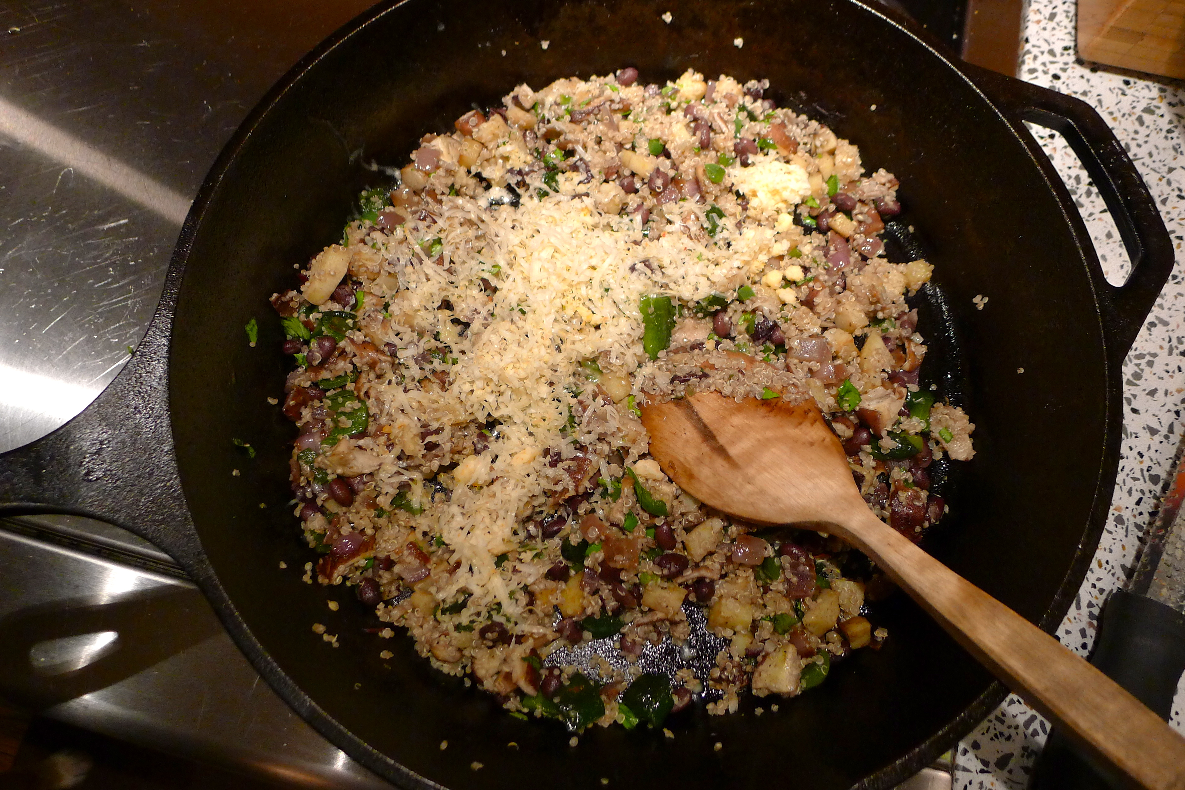Heat oven to 350 degrees. In a large skillet on medium heat, sauté the onions in a swirl of olive oil. After a few minutes, add the sweet potato. After a few minutes, add the poblano pepper and mushroom. Last, add the garlic and jalapeno. When the veggies are just starting to become tender, add the quinoa, black beans, and basil. Stir in a small handful of cheese and remove from the heat.