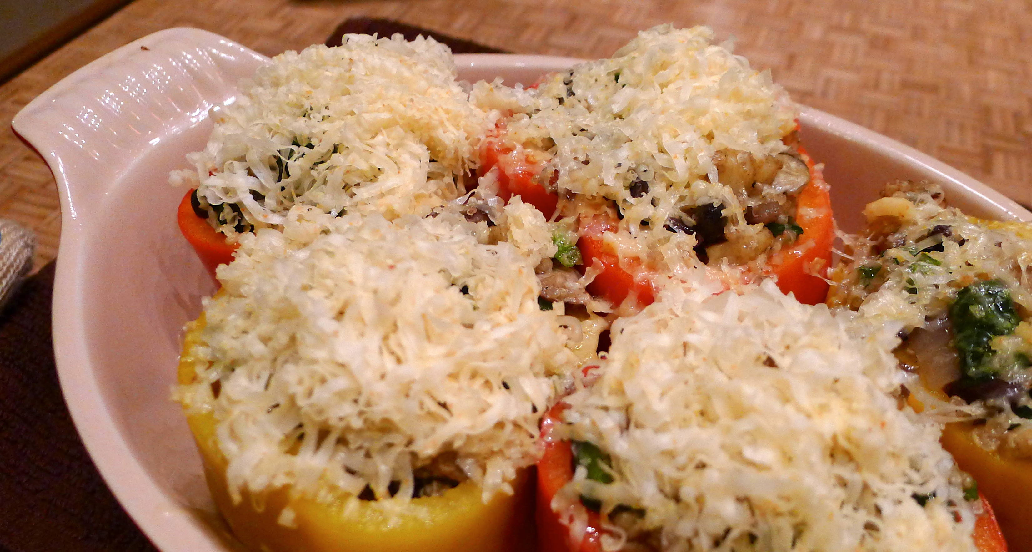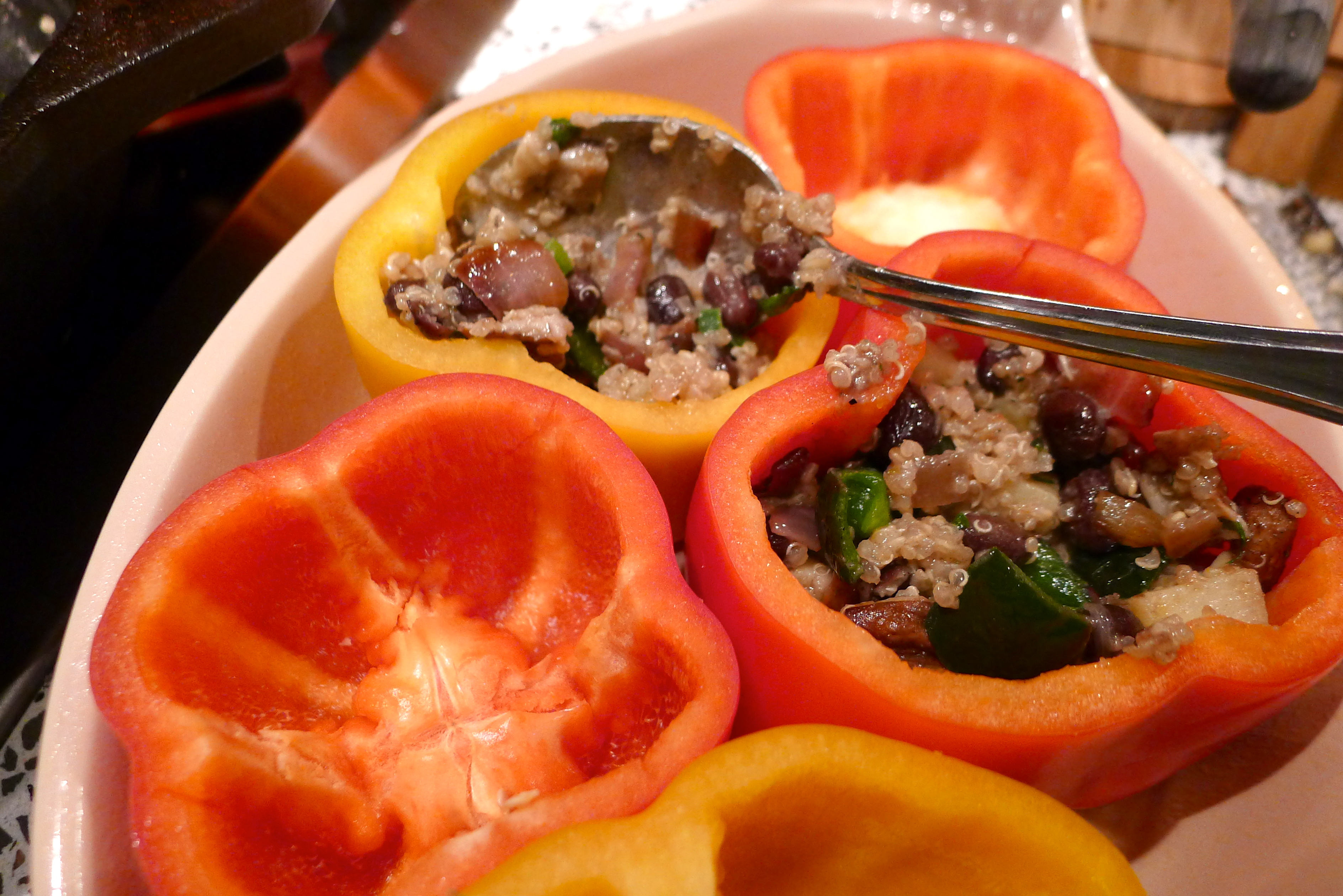 When the peppers were full of quinoa-veggie goodness, I sprinkled the tops with more cheese, covered the baking dish with foil, and popped them into the oven for a half an hour or so. Then I removed the foil and let the cheese get browned under the broiler.
