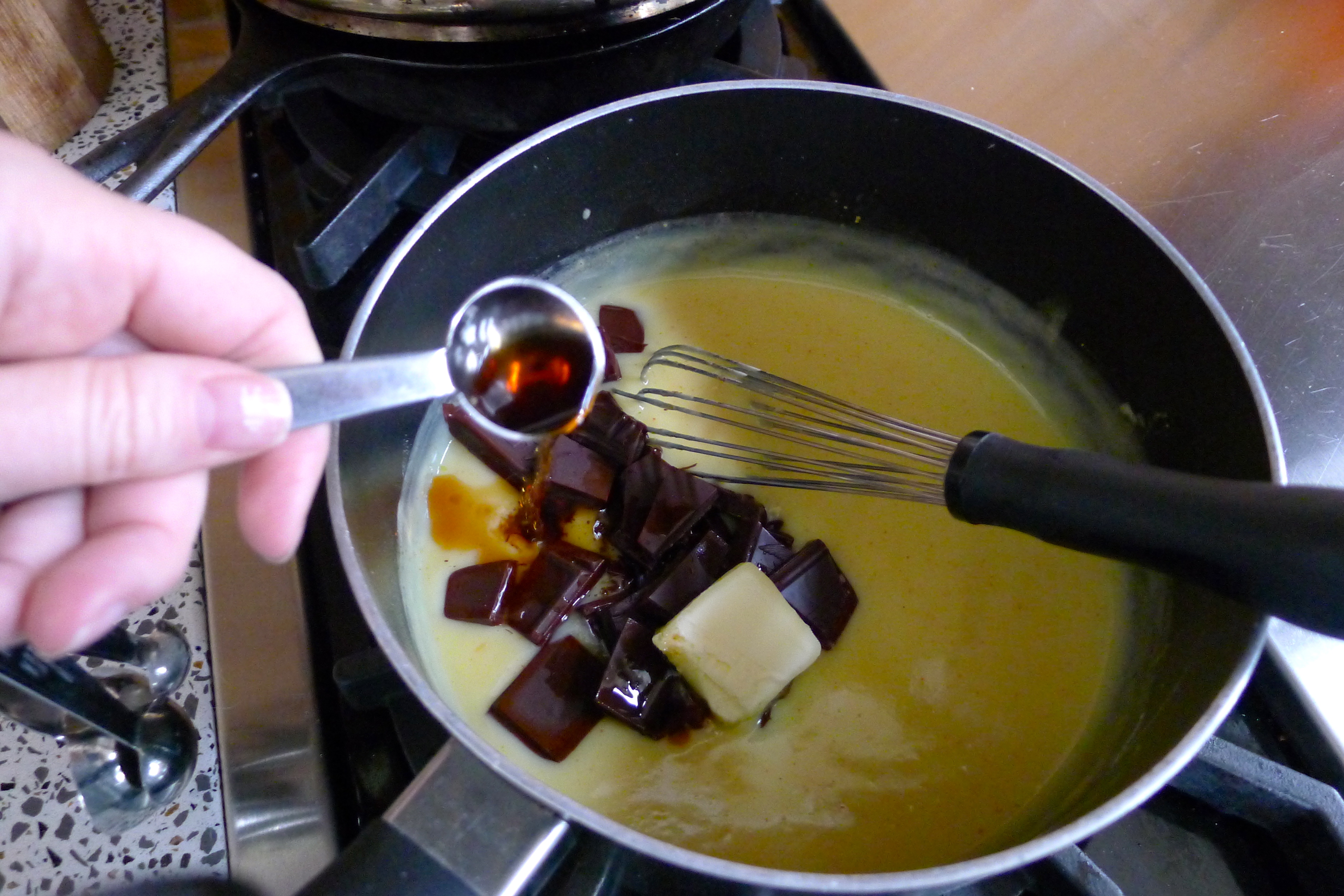 The last few ingredients went into the pan: vanilla, butter, and bittersweet chocolate. I whisked it until the chocolate and butter had melted and the pudding was thick and perfect. A quick taste brought a smile to my face. It’s sweet, but not milk-chocolatey sweet. The texture is creamy and smooth. And there’s a spicy kick to it that you don’t taste at first but is definitely there. YUM.