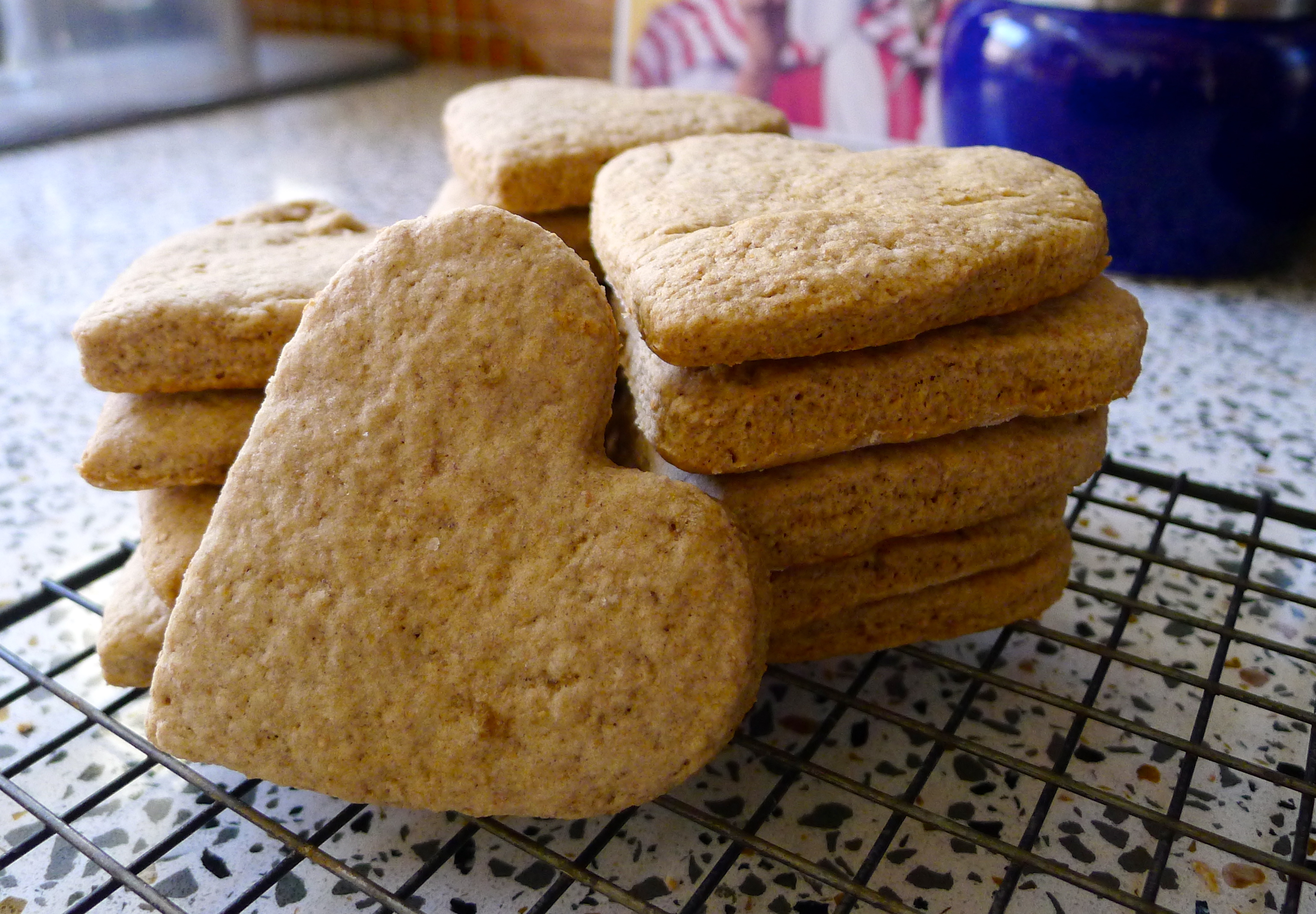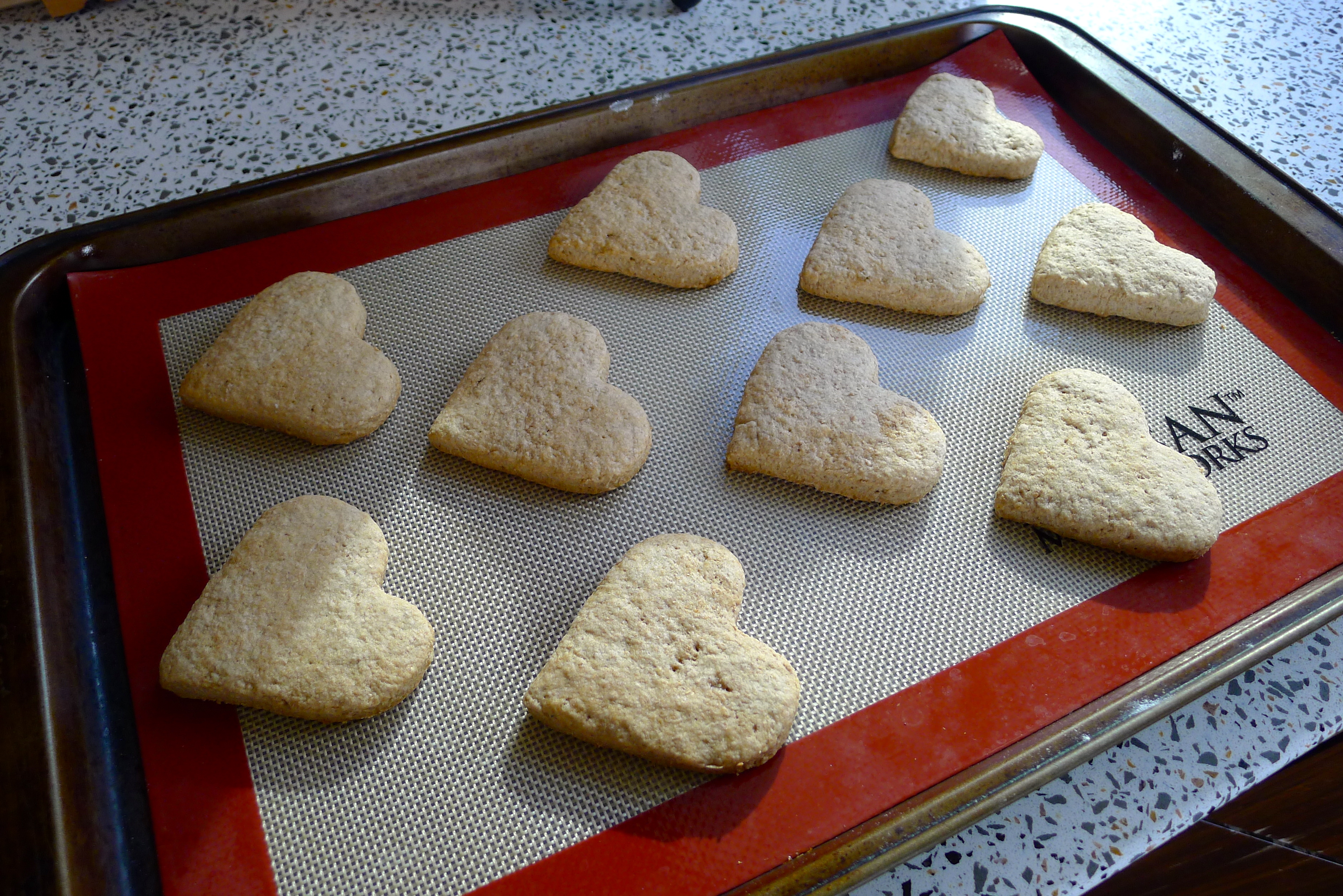 While John slept in, I made a batch of graham crackers. I used this recipe, which was quite simple since it lets the food processor do all of the work. I used a heart-shaped cookie cutter and ended up with a stack of festive (and yummy) cookies.
