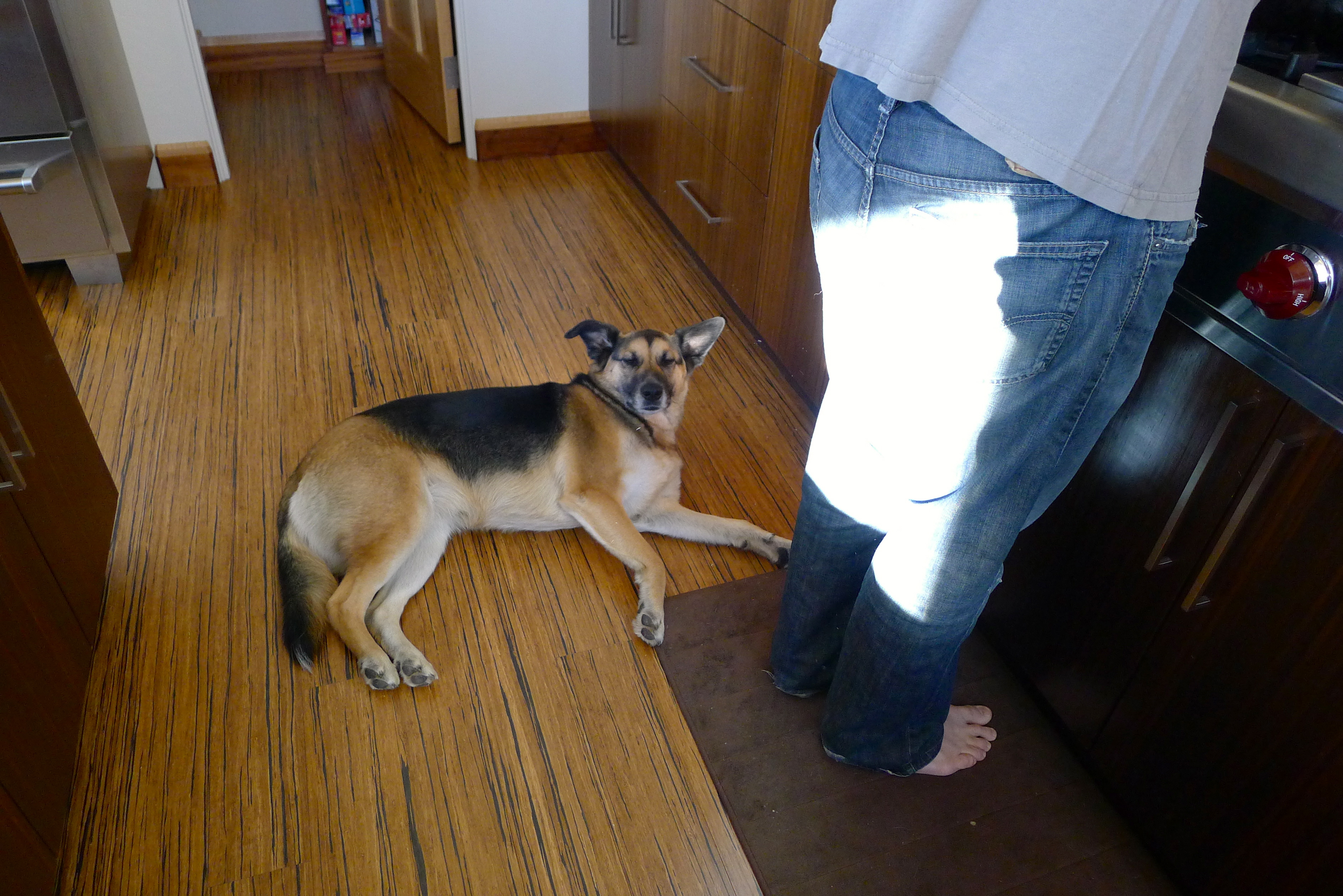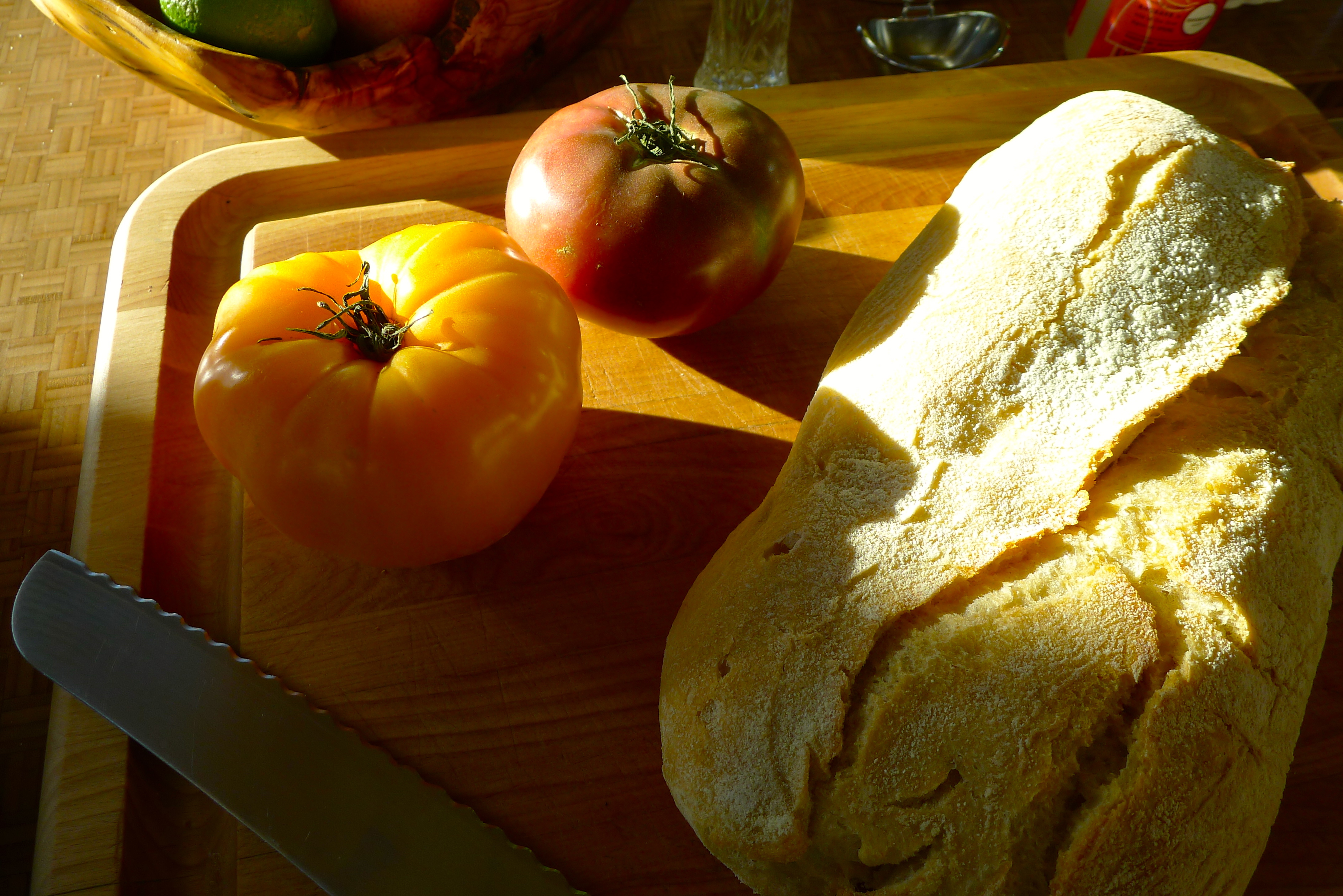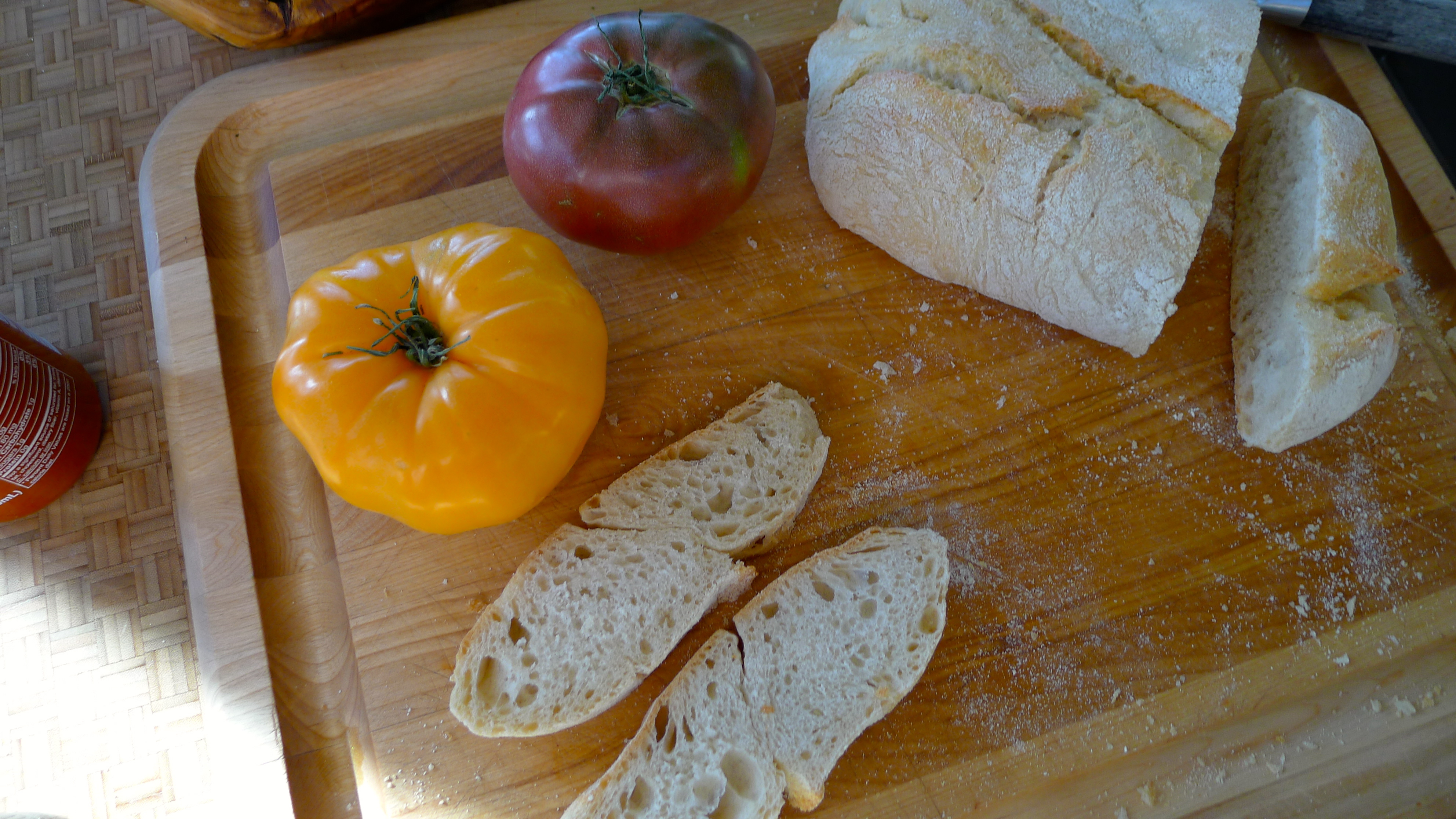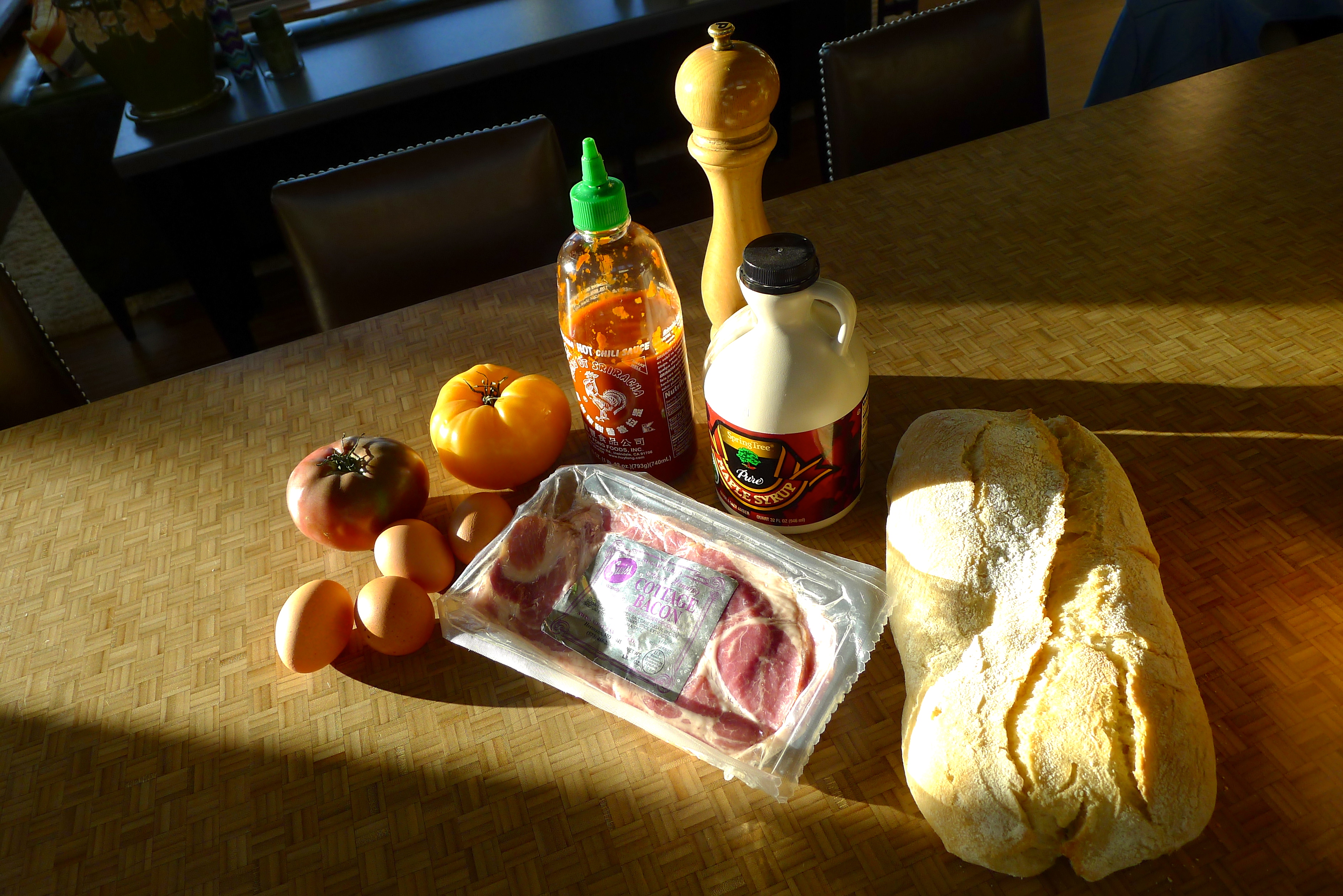 As soon as I started to cut the loaf of bread I’d intended to use, I realized that it was all wrong. No, for these BLTs, we’d go with standard toasted honey-wheat sandwich bread. My family had groggily meandered into the kitchen, drawn by the intoxicating aroma of bacon on Sunday morning. John fried the eggs to perfection while I prepped the sammie ingredients. (Cholula supervised.)