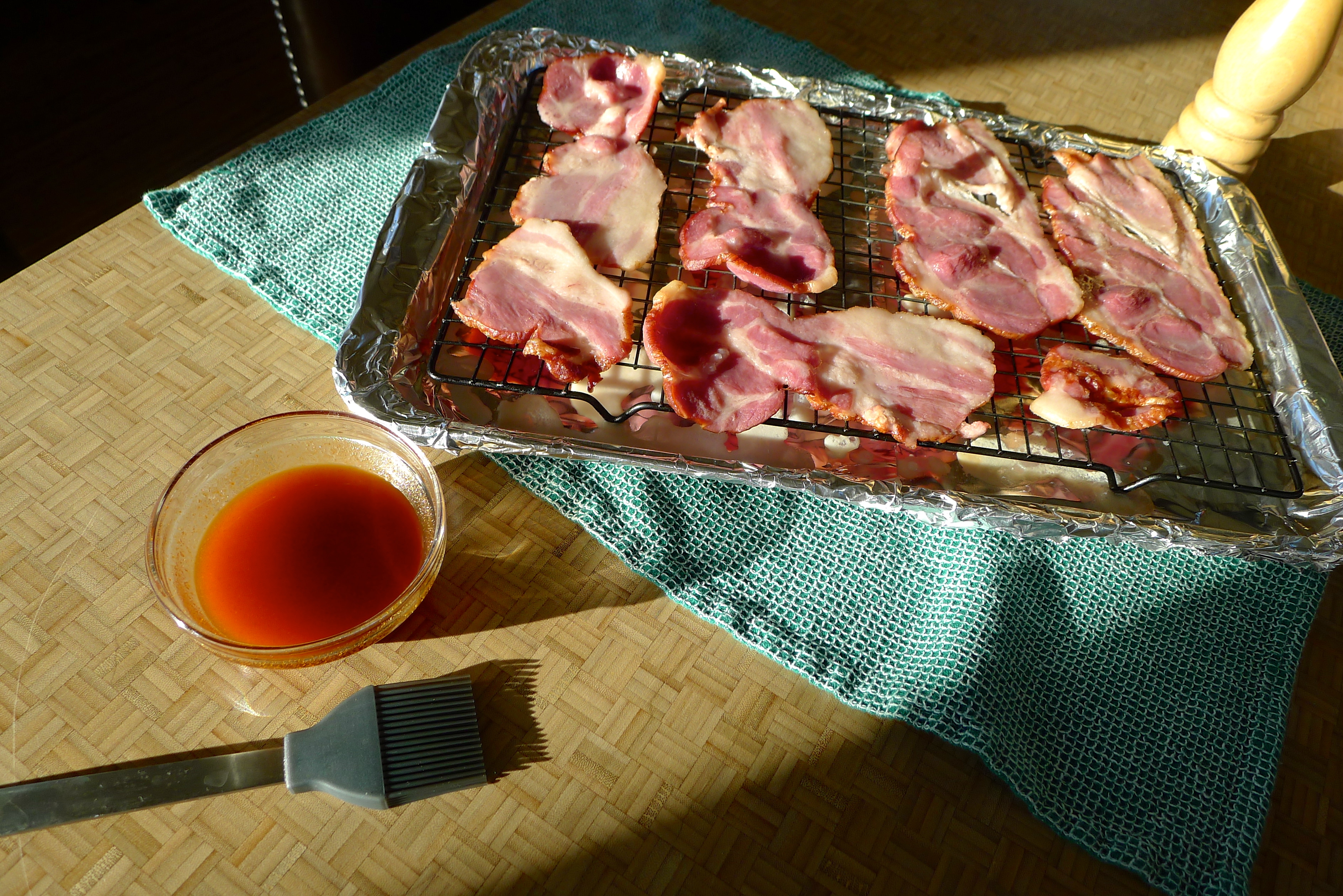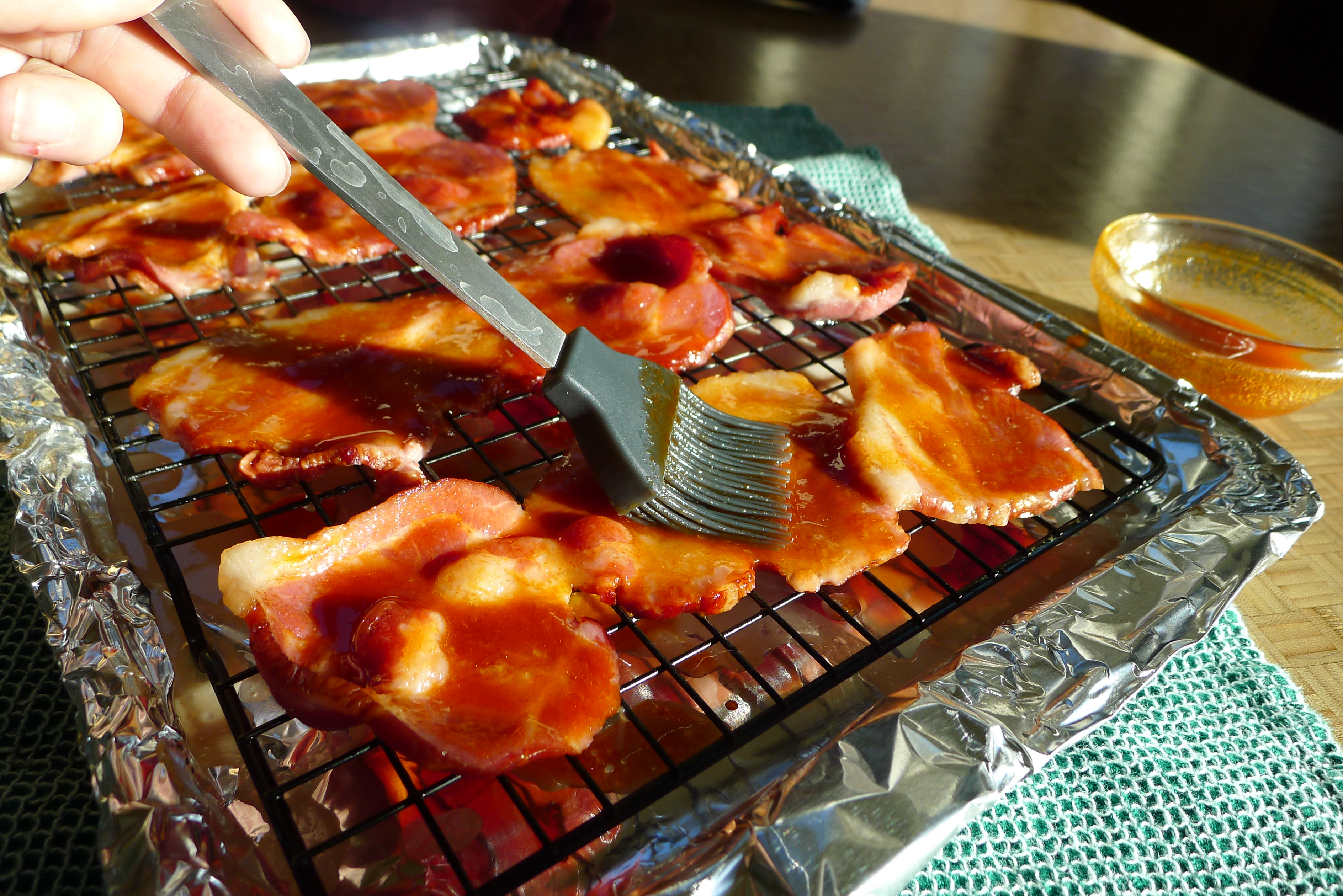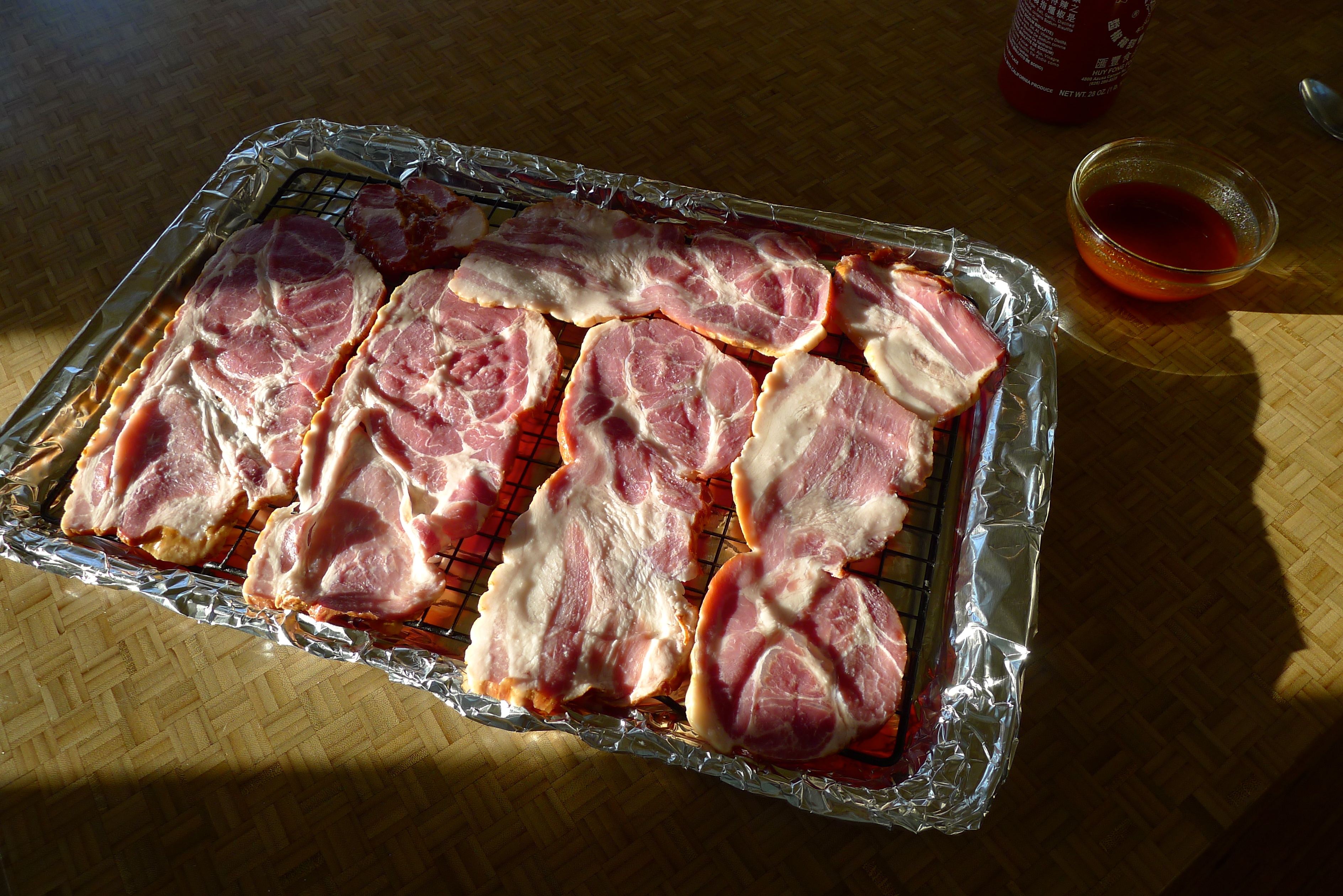 There’s never a shortage of hot sauce in this house; I keep backups of various sauces in the pantry so we never run out. (Our dog is named Cholula. Hello.) For the cottage bacon I’d discovered in the freezer, I combined equal parts Sriracha and maple syrup. The bacon would add a salty factor and I’d add cracked pepper at the end. YUM.