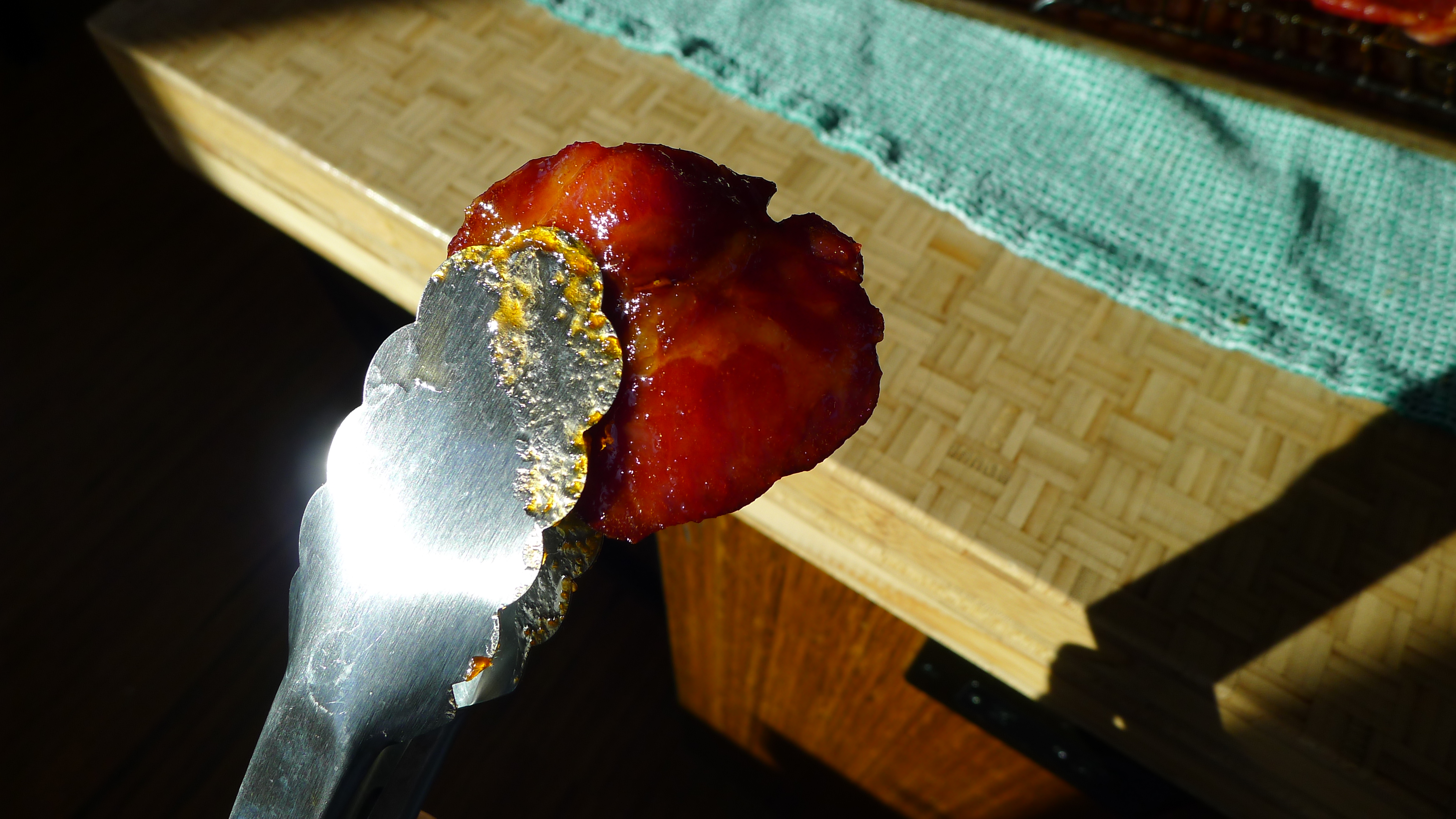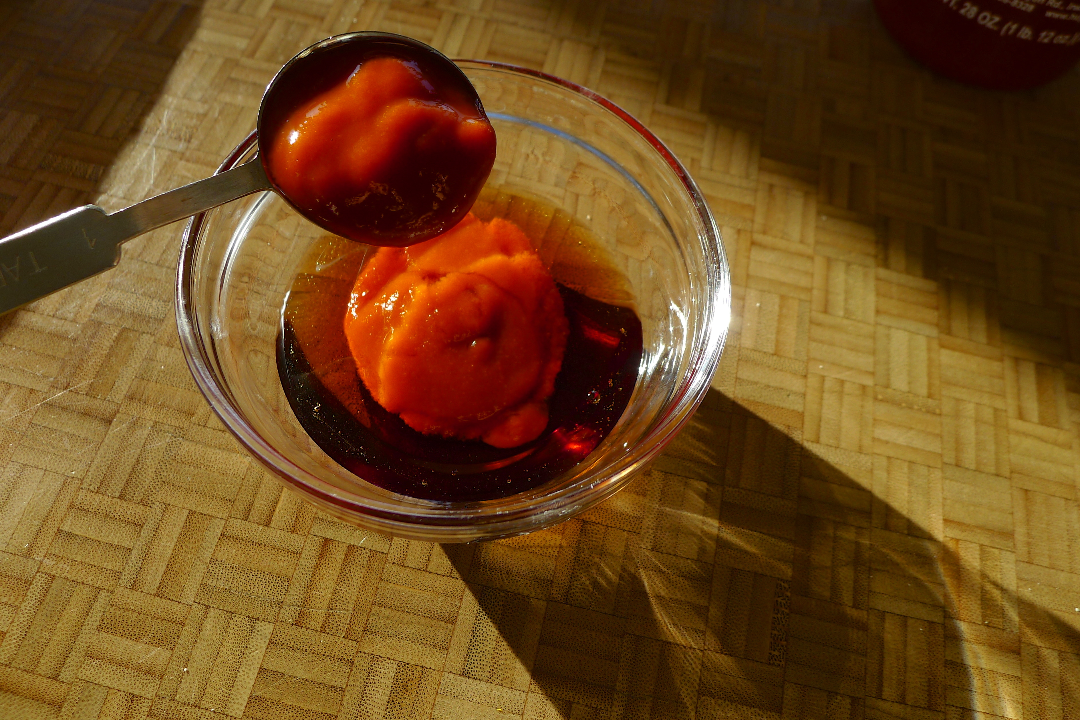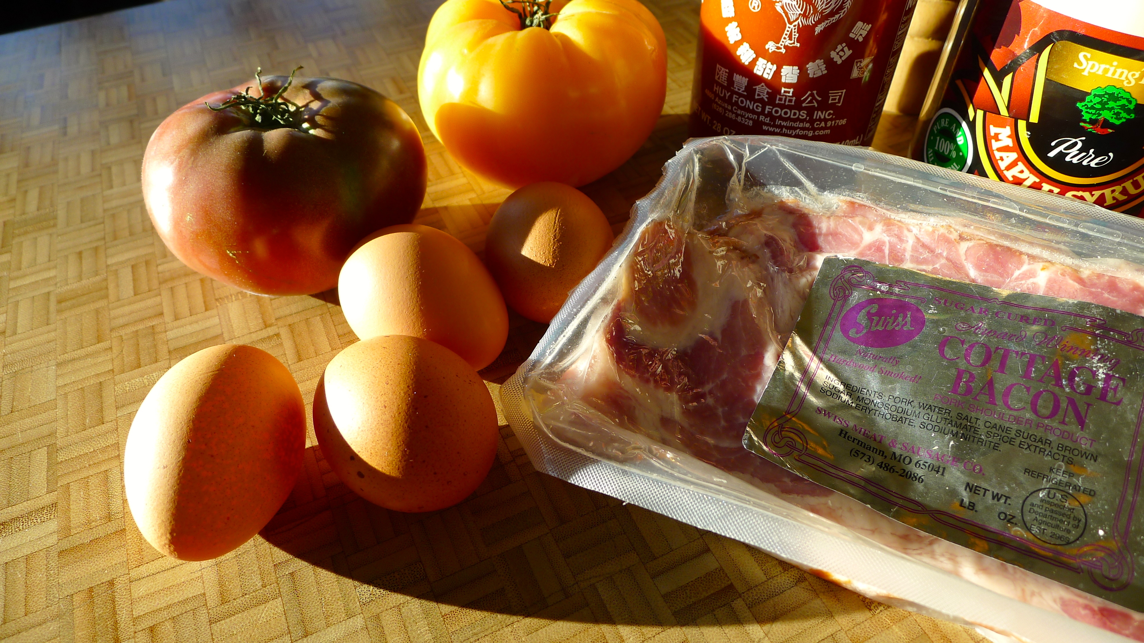 There’s never a shortage of hot sauce in this house; I keep backups of various sauces in the pantry so we never run out. (Our dog is named Cholula. Hello.) For the cottage bacon I’d discovered in the freezer, I combined equal parts Sriracha and maple syrup. The bacon would add a salty factor and I’d add cracked pepper at the end. YUM.