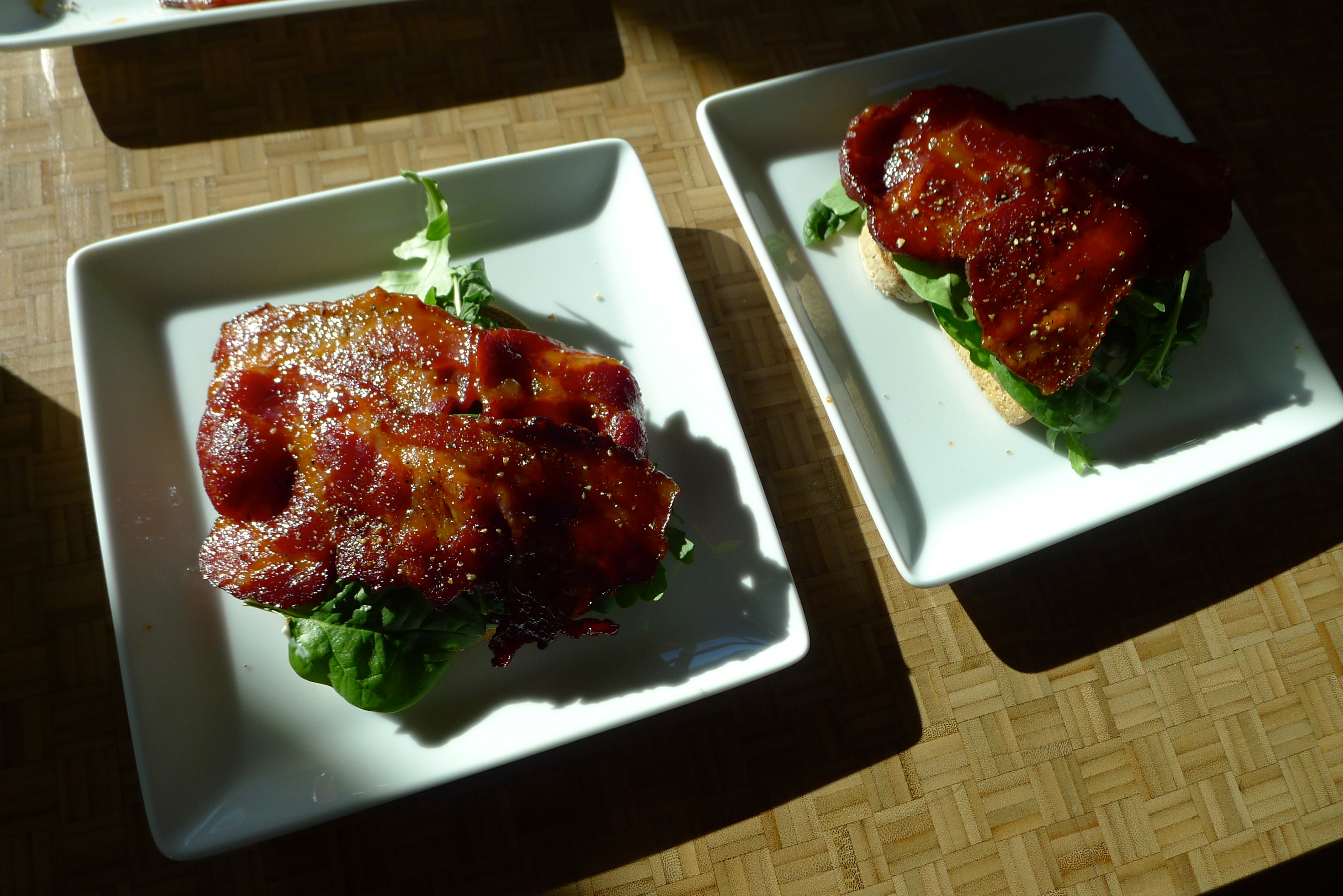 I’d had a breakfast BLT in mind for a while, wanting to jazz up the classic with fancy bacon and an egg. After doing a little research, I saw many different versions of candied bacon, using brown sugar or cayenne pepper or dry mustard or rice vinegar. I thought about what flavors I wanted- sweet and spicy– and kept it simple. Its simplicity is what makes a BLT so fabulous. And, after all, my morning brain was still foggy.