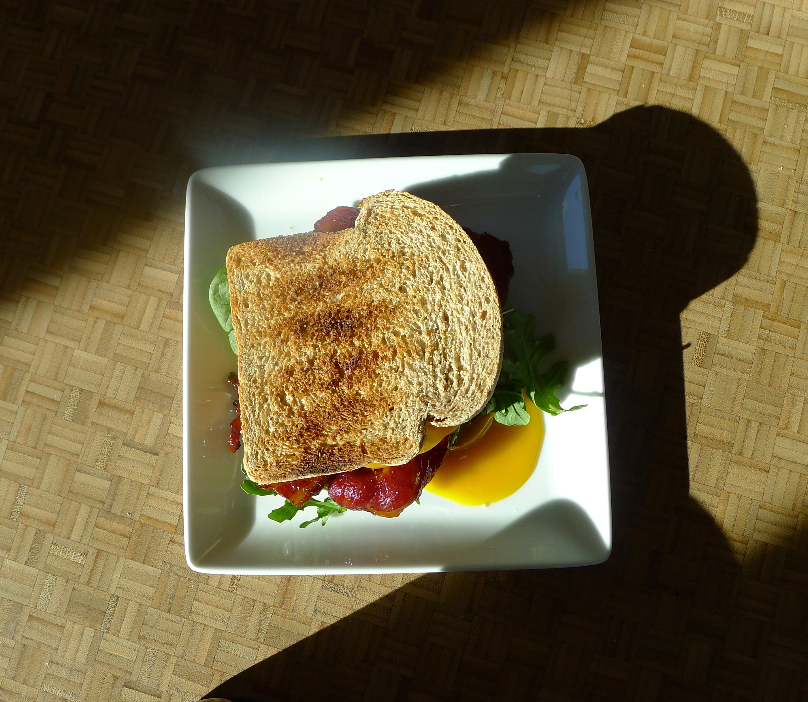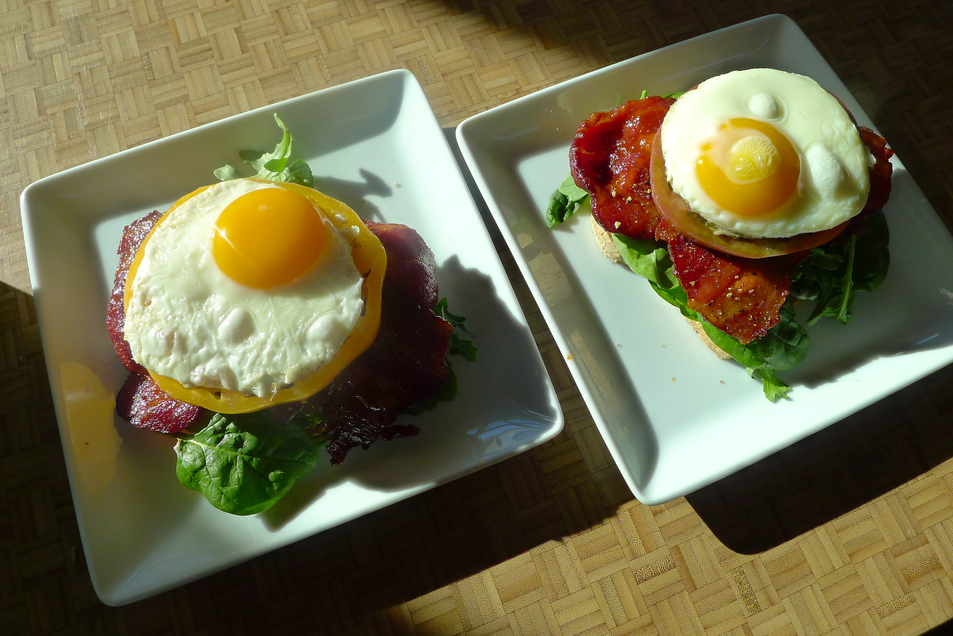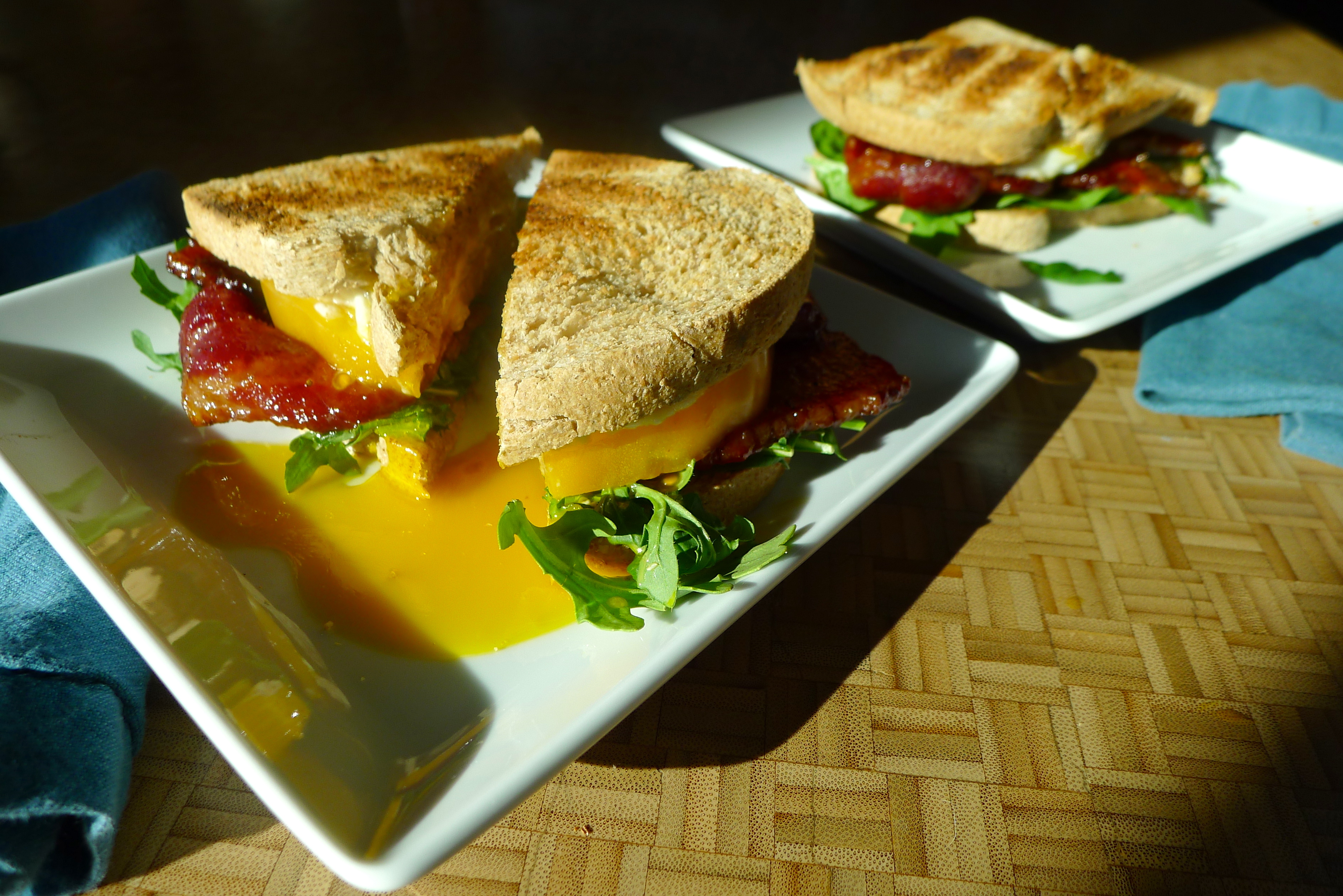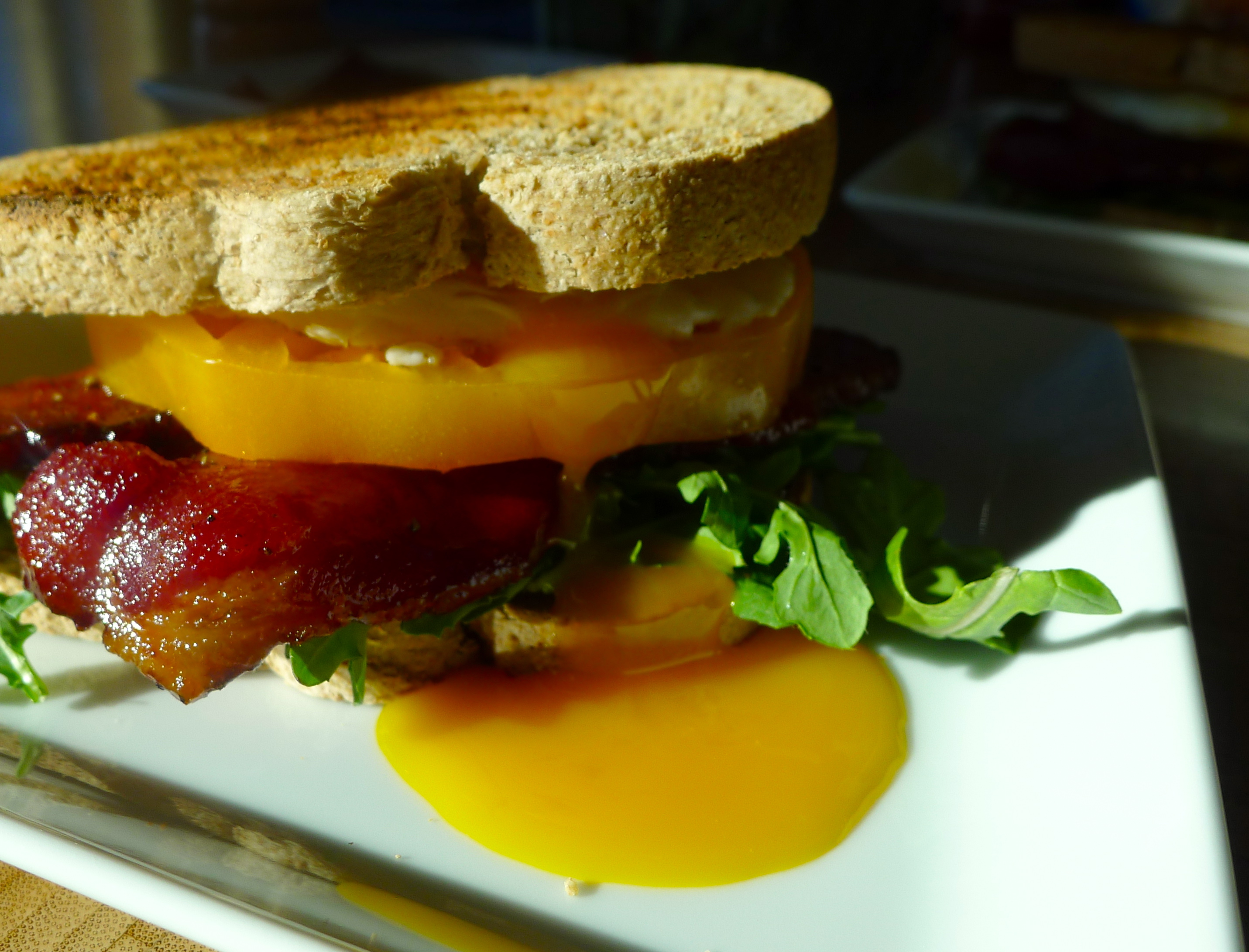 Spread some mayo on a slice of toast. Add some greens, then a few slices of bacon, then a tomato slice or two. Place a fried egg on top before adding another piece of toast. Enjoy in the morning sun and reserve time for a nap afterward. YUM.
