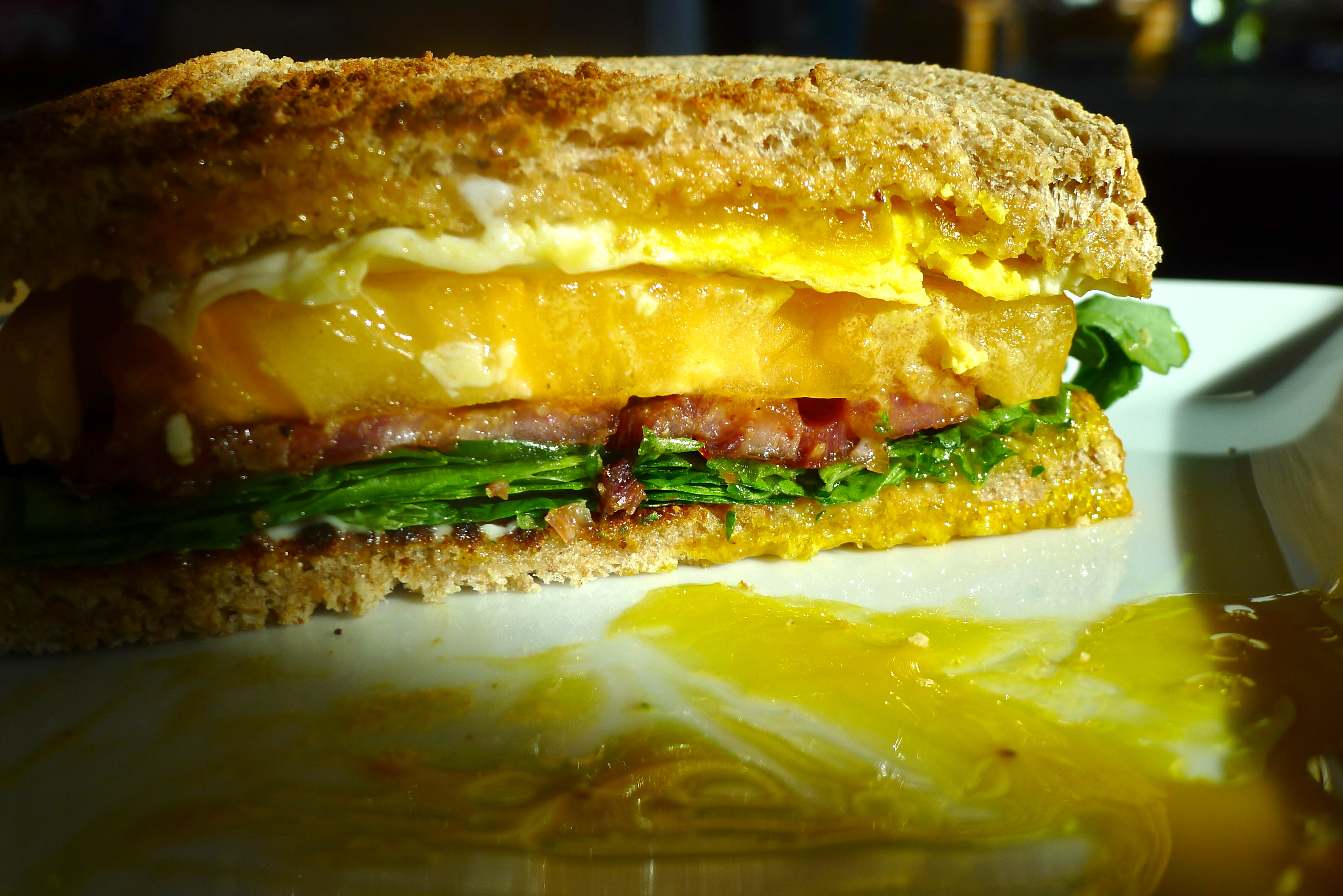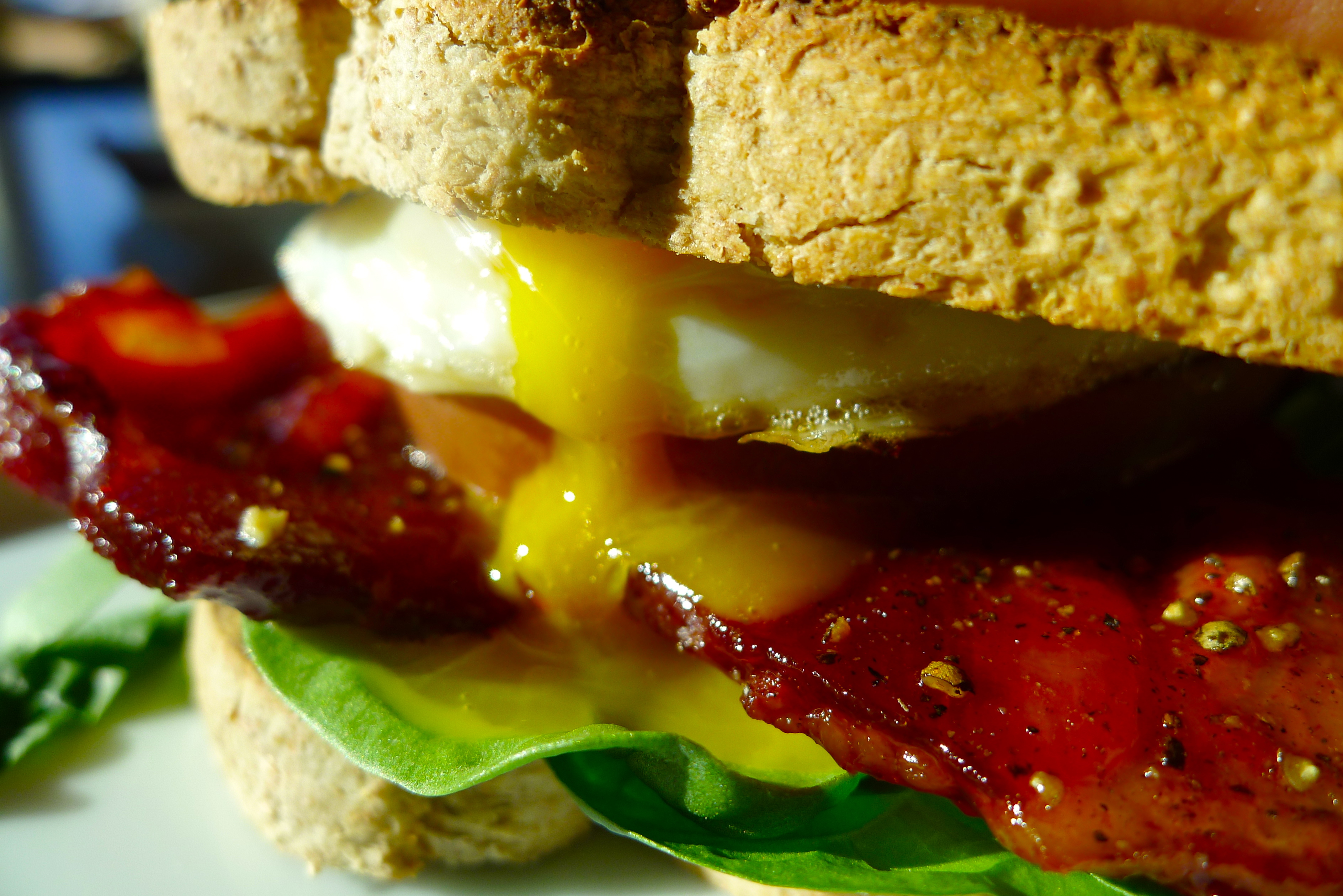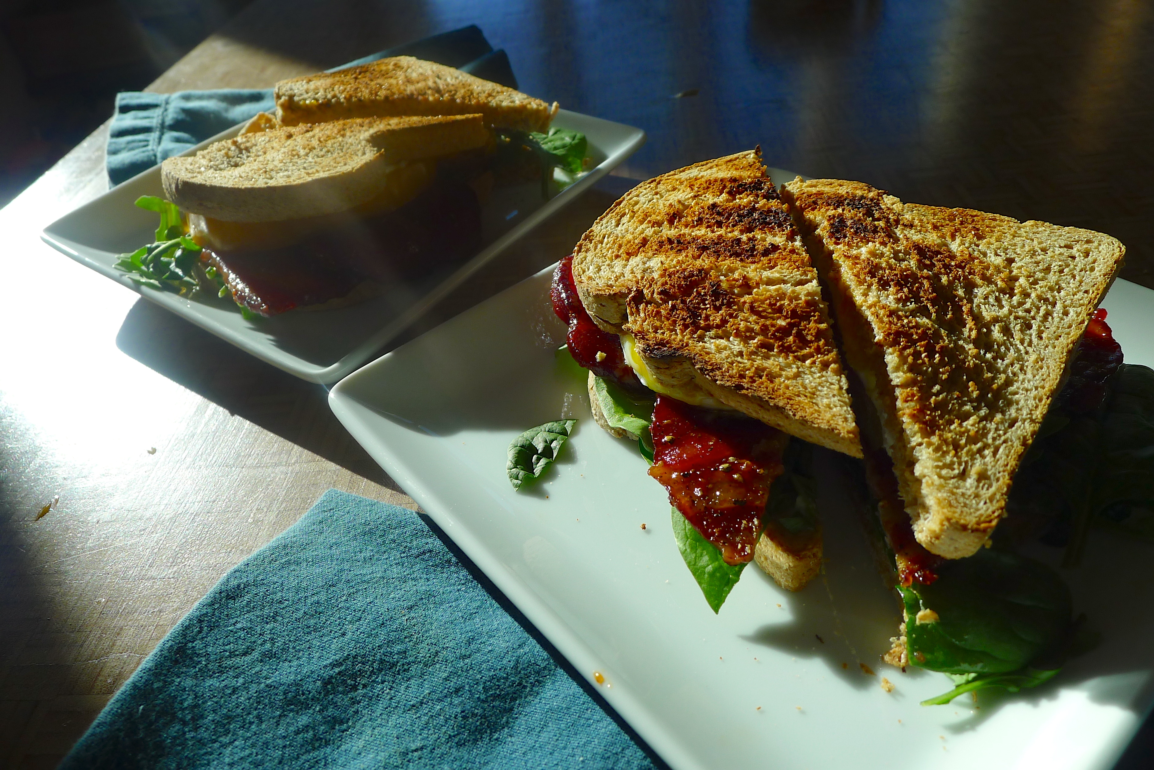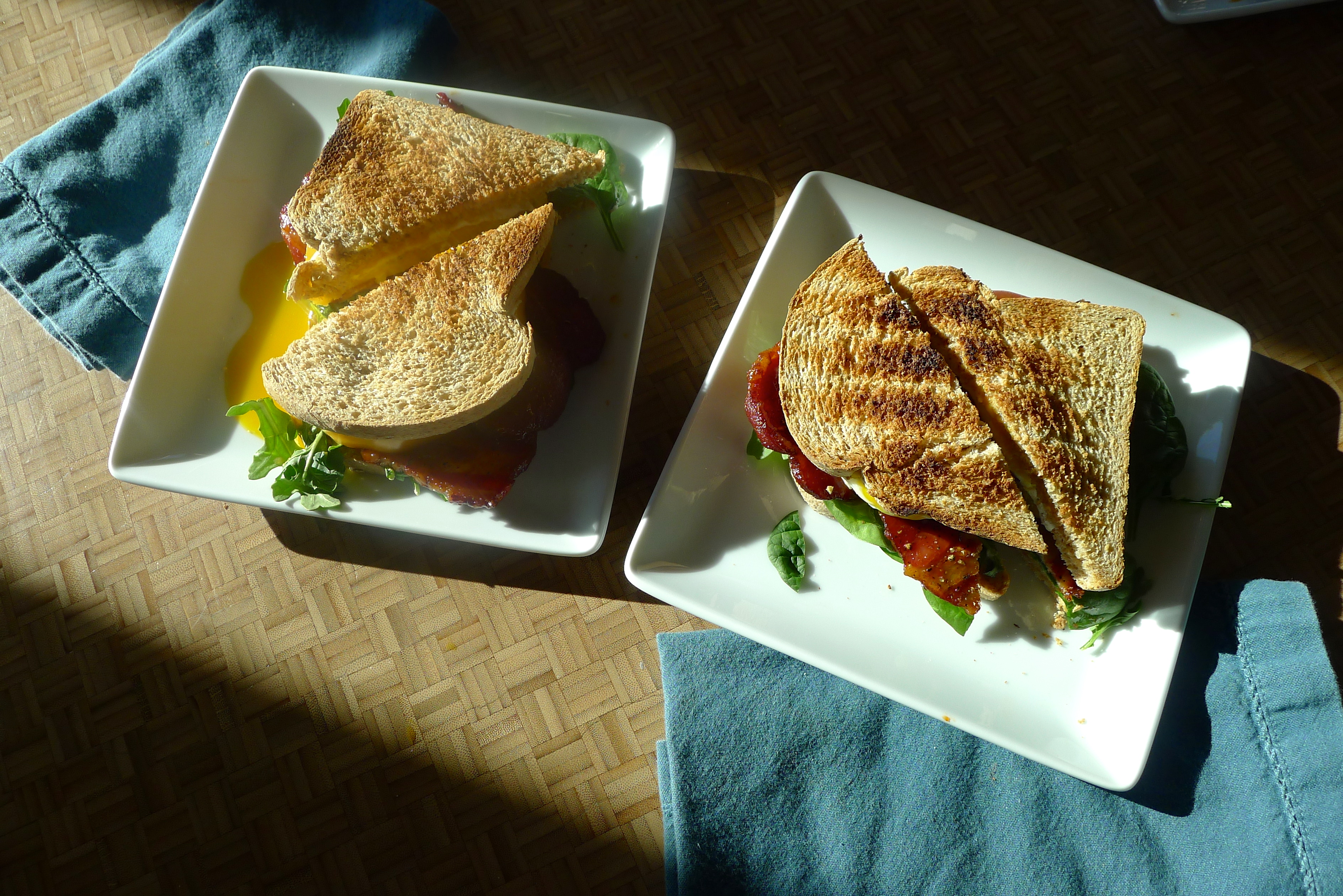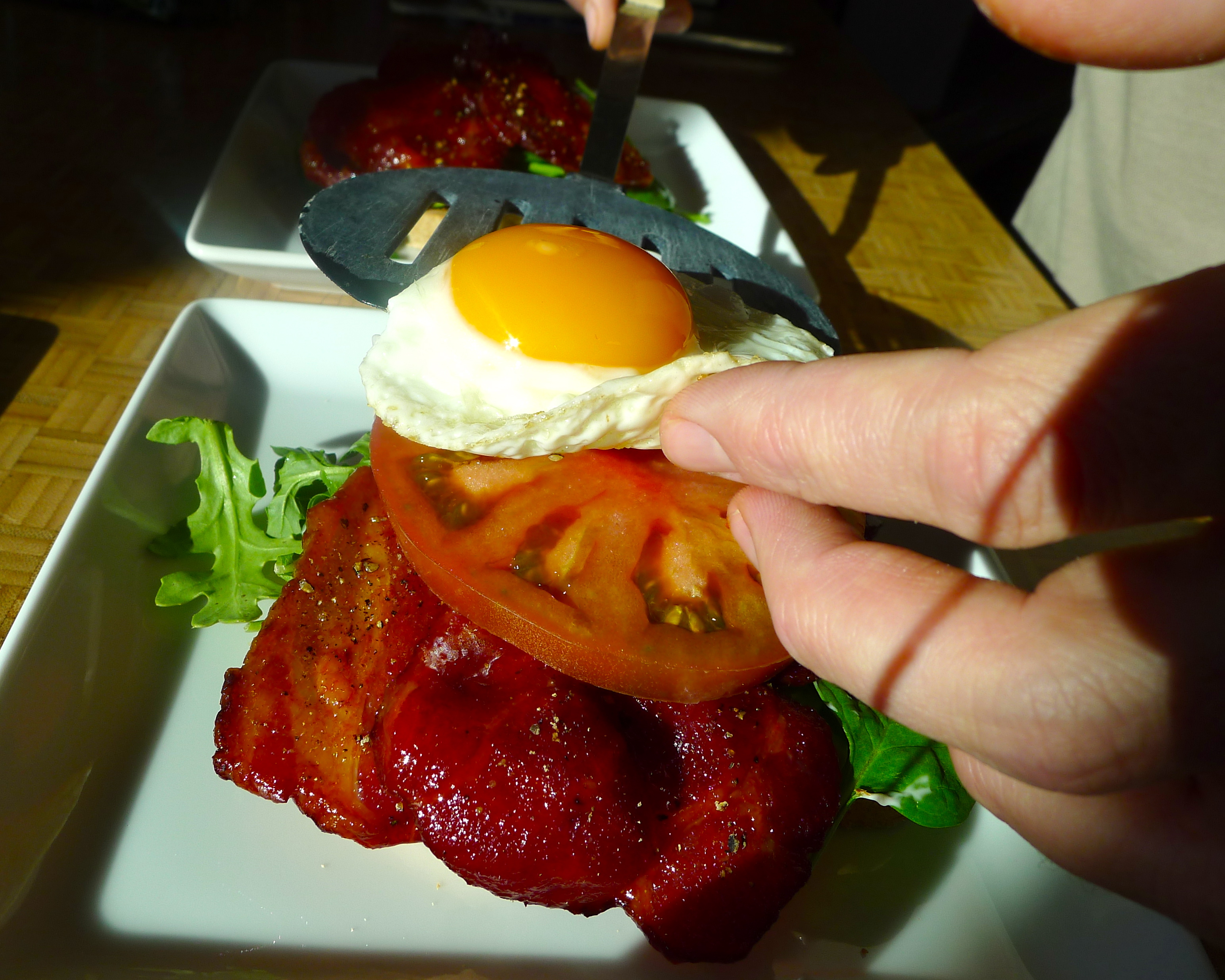 Spread some mayo on a slice of toast. Add some greens, then a few slices of bacon, then a tomato slice or two. Place a fried egg on top before adding another piece of toast. Enjoy in the morning sun and reserve time for a nap afterward. YUM.