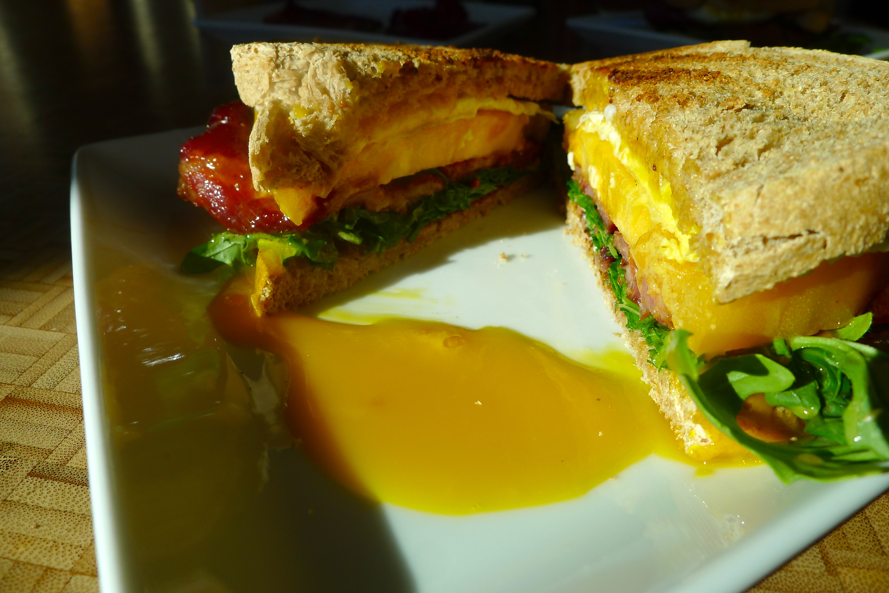 We pressed the other slice of toast on top, letting the yolk drip into the sandwich before diving in. My first thought was: Now that’s a breakfast sandwich. My second thought was: YUM. The cottage bacon was at once sweet and spicy and salty, and the arugula was a good choice to bring out the pepper flavor. The tomatoes were juicy and the sandwich bread was the classic way to go. It was everything you love about a really good BLT, plus a beautiful fried egg. Decadent.