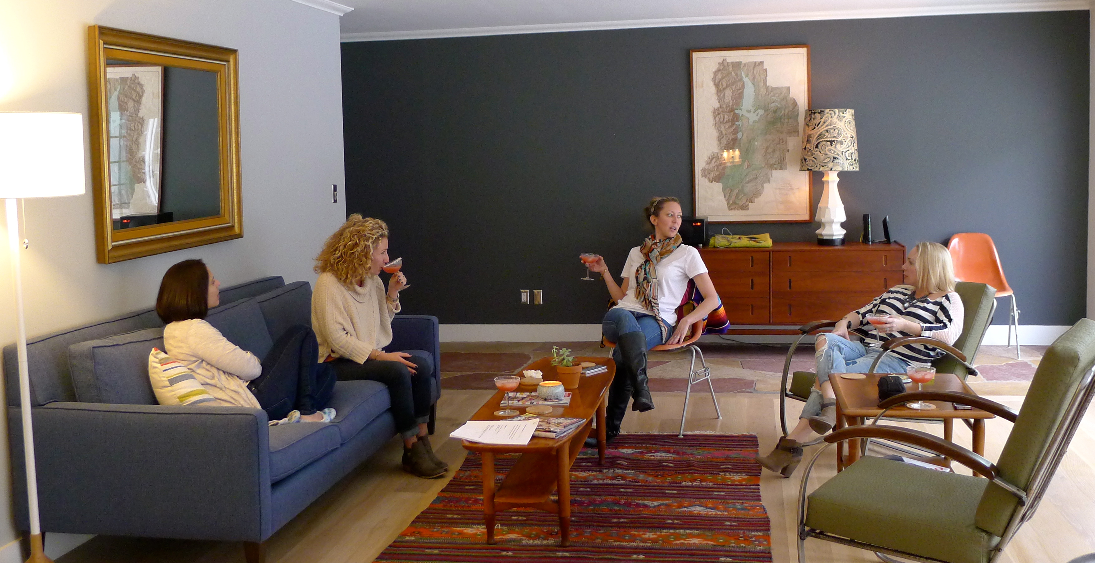 The car must have sounded like a hen house on the drive up to Ojai, five old friends chitter-chattering the whole way. We settled into our hip digs (complete with a 1971 jukebox) and cracked open a bottle of wine. Another gift was distributed, this time a beautiful bracelet from Stacey.