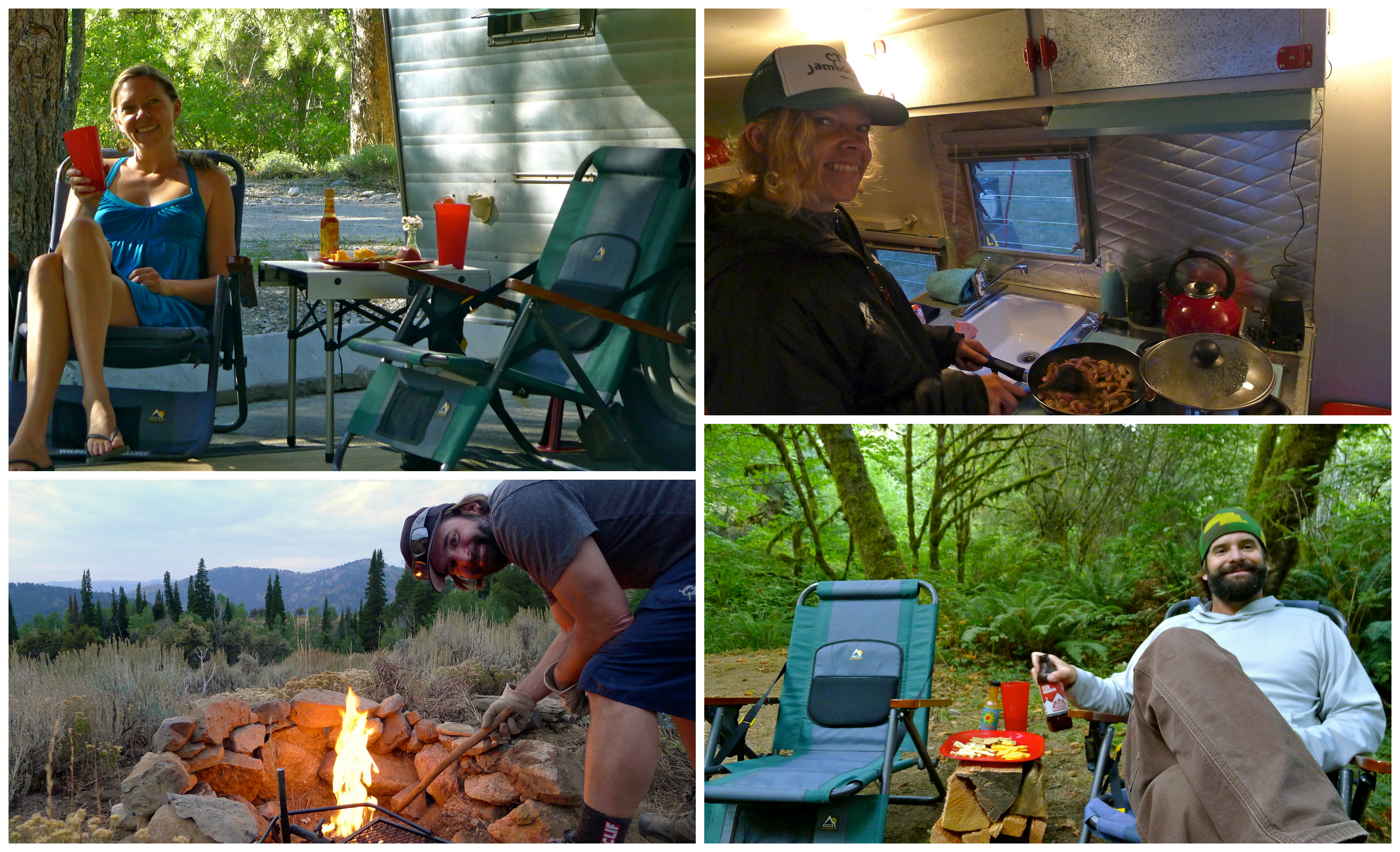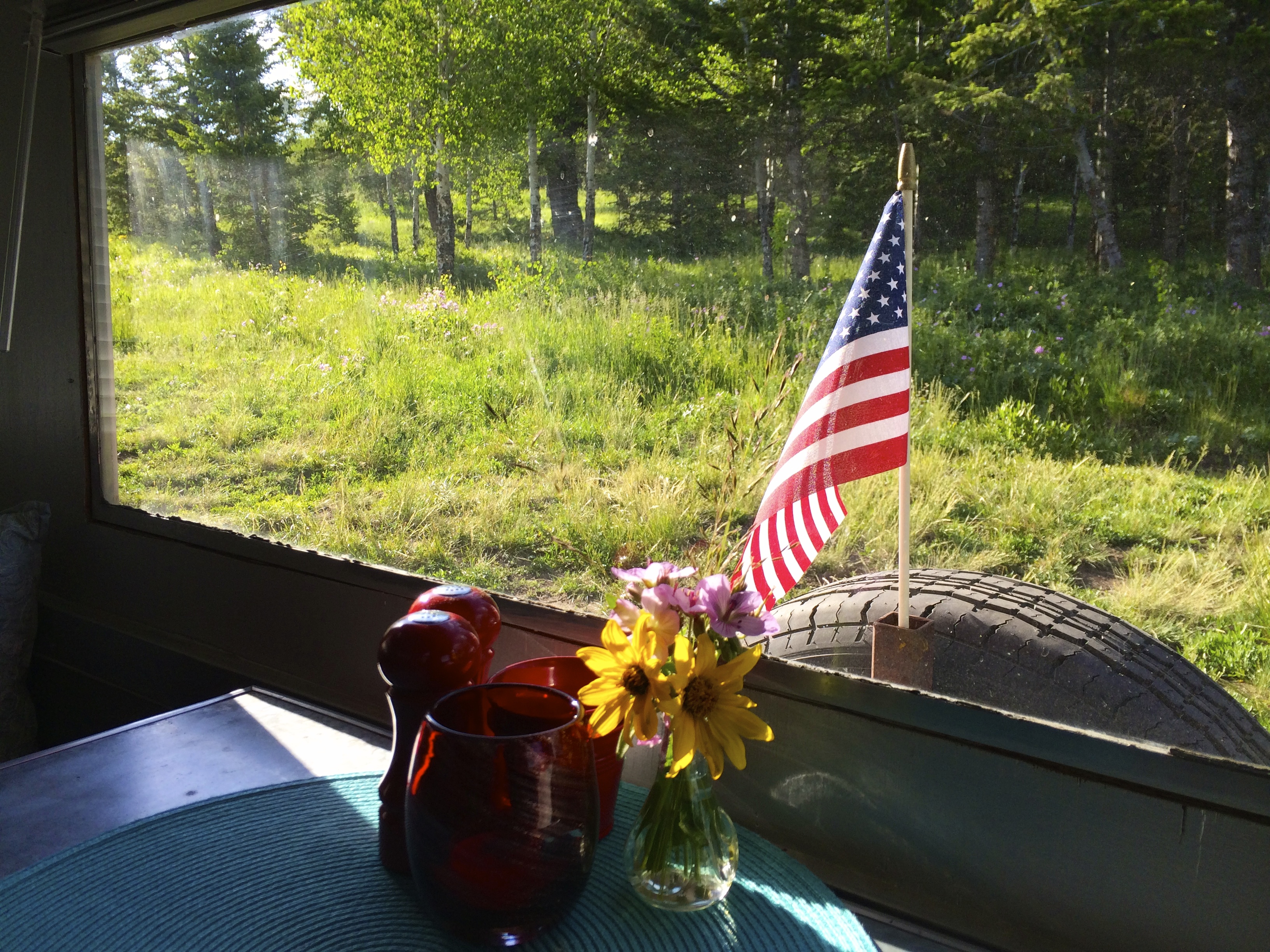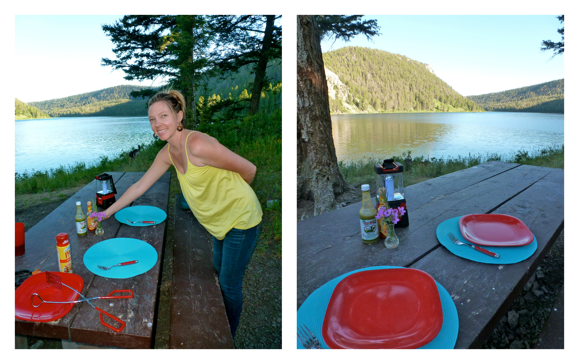 Betty is outfitted with some basic cooking utensils, a frying pan, a sauce pan, a veggie grill basket, and a small soup pot. We have placemats, melamine bowls and plates, real silverware, and cloth napkins to reduce waste (plus it feels nicer). We light candles, play music, drink good wine (out of Betty’s plastic glasses), and often pick a few wildflowers from camp to put in a vase. I like our little cottage-on-wheels to have touches of home, and mealtime is no different.