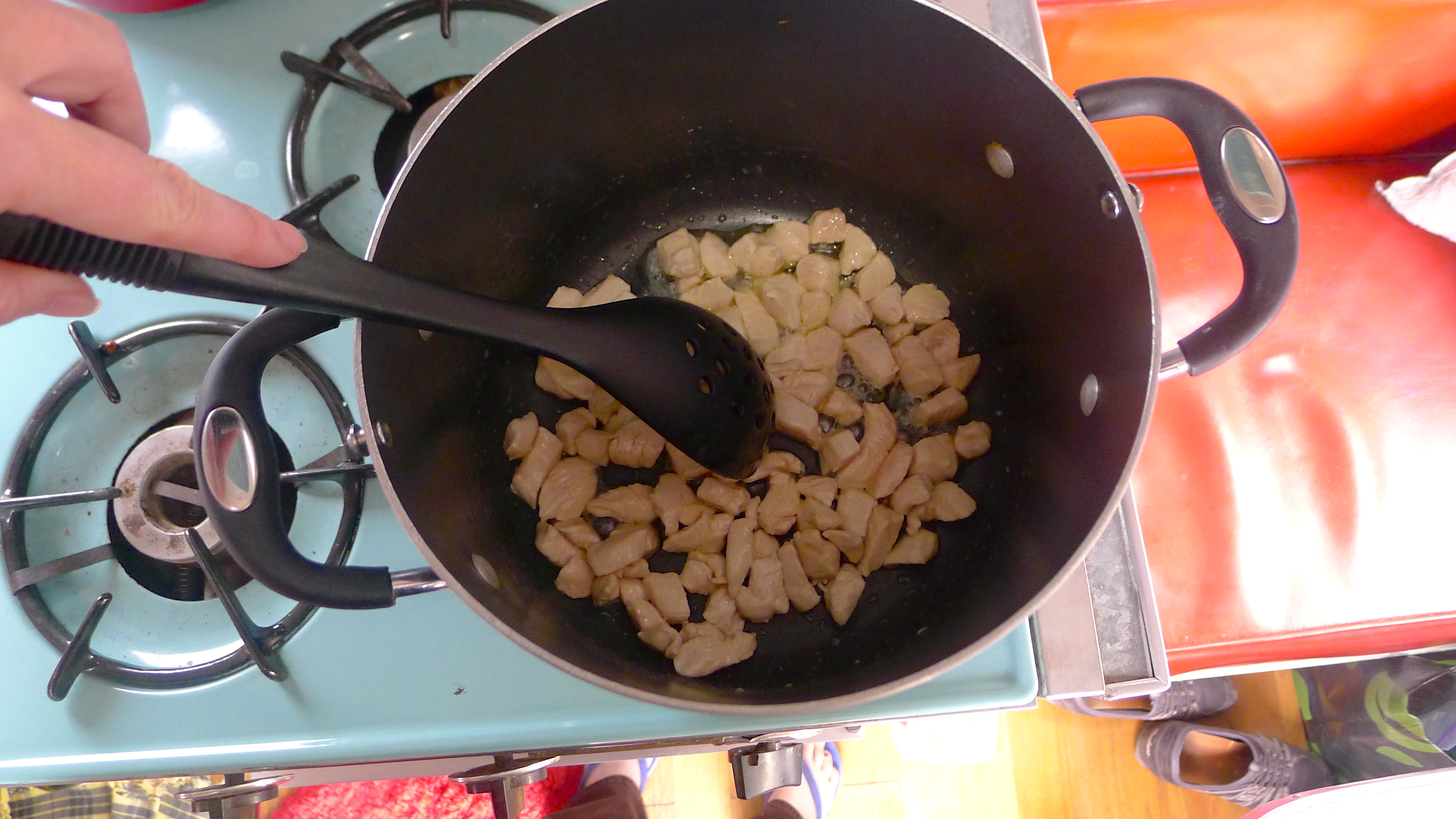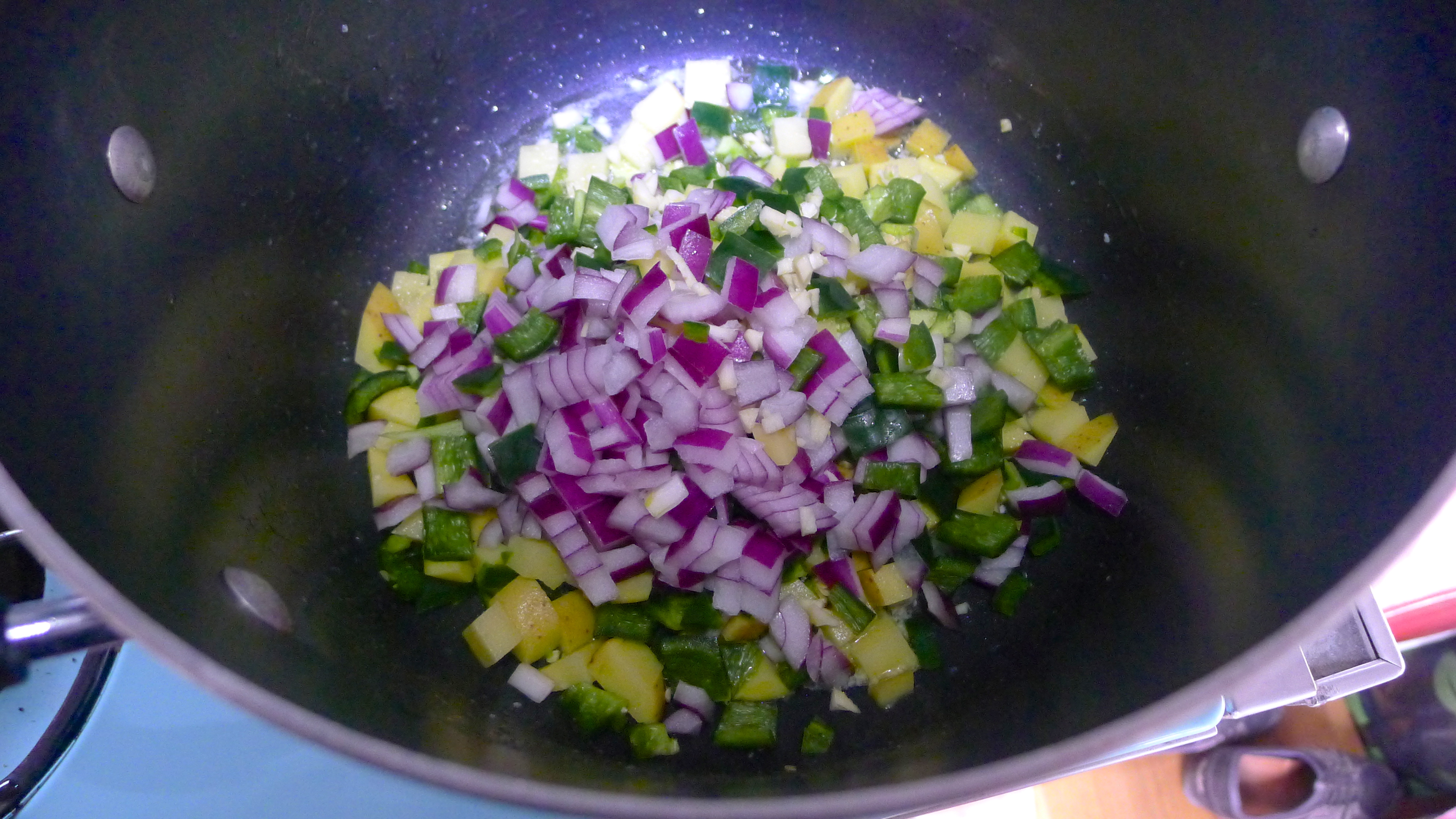 In my little soup pot, I cooked the chicken in a little bit of olive oil. I removed it, set it aside, and dumped all of the fresh veggies into the pot. I tossed in a small handful of cumin and a few shakes of garlic salt.