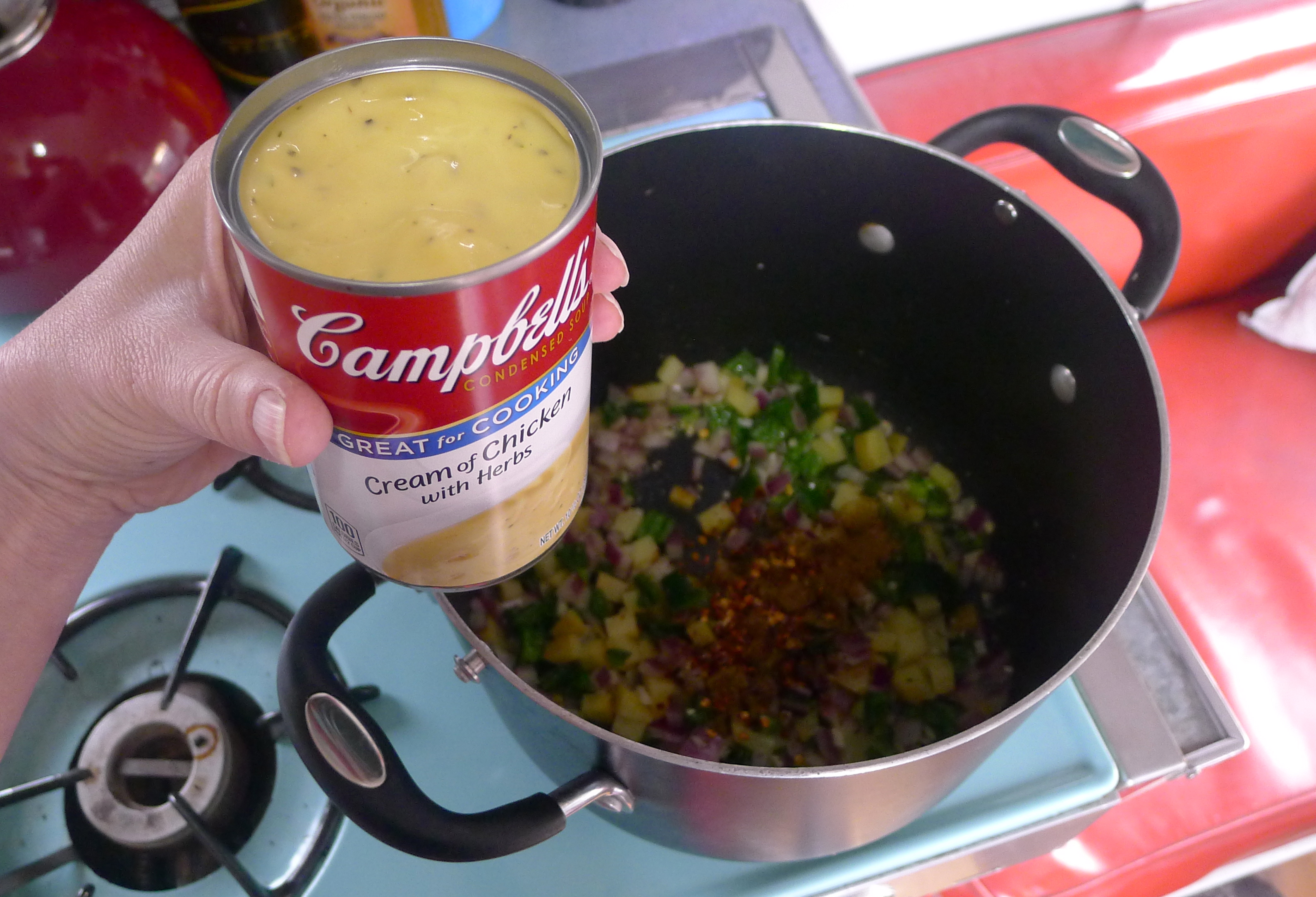 When the veggies started to get tender, I added a can of cream of chicken soup and the green chiles. Into that mixture, I poured a little milk and a cup of chicken broth. I gave it a good mix and added the chicken back in, then let it simmer away while I freaked out about the incredible sunset.