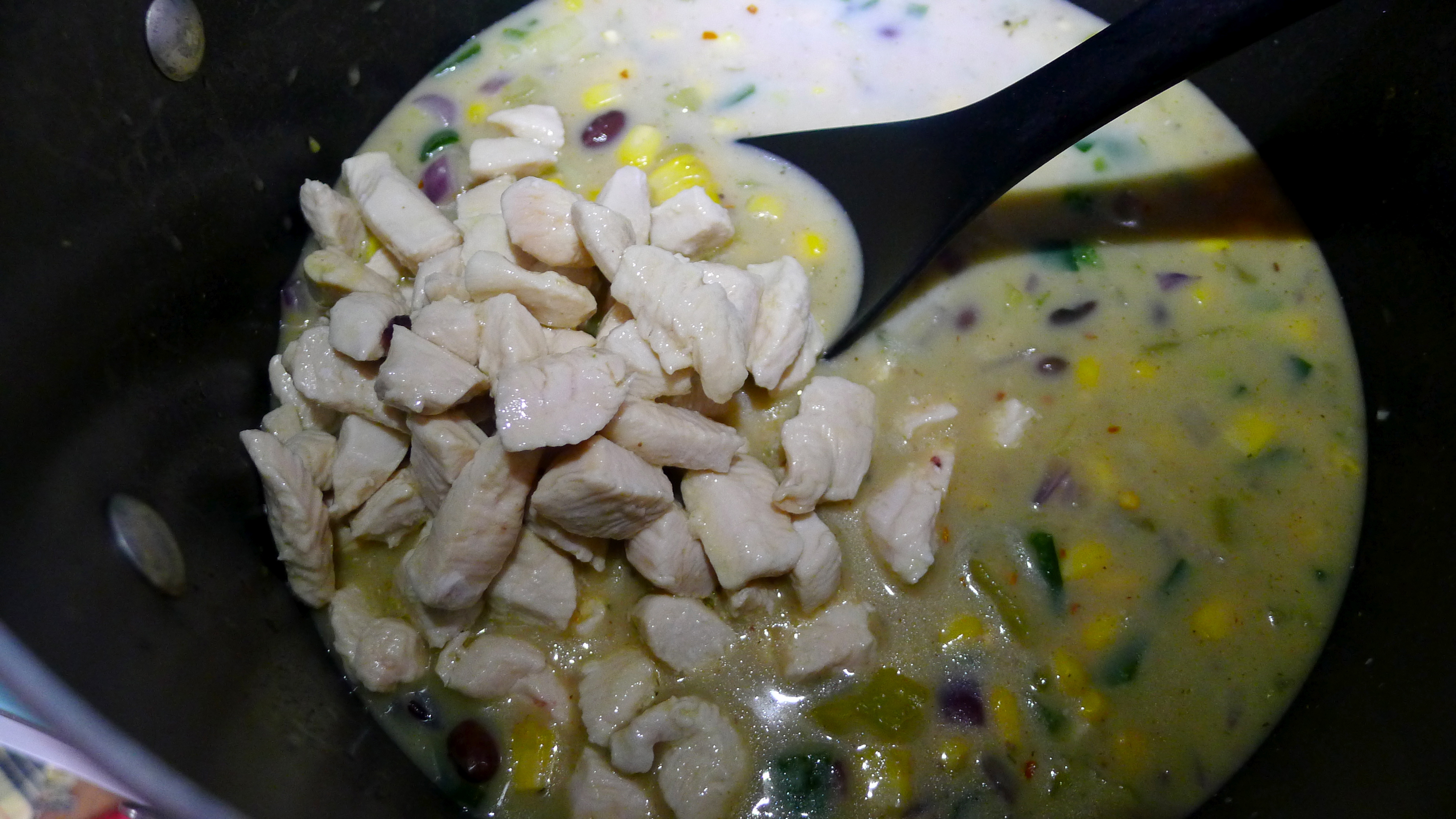 Last weekend, I tried a new recipe: green chile chicken enchilada soup. It basically takes all of the flavors from spicy enchiladas and turns it into a creamy soup. There are quite a few canned items, which makes it easy (as long as you don’t forget the can-opener). It also uses plenty of fresh ingredients, which balances out the flavors. I started by prepping everything: cutting a chicken breast into bite-sized pieces and chopping veggies (onion, a poblano pepper, a potato, garlic, and jalapeño). I got the canned goods opened and ready to use: black beans and corn (both drained) and plenty of fire-roasted green chiles.