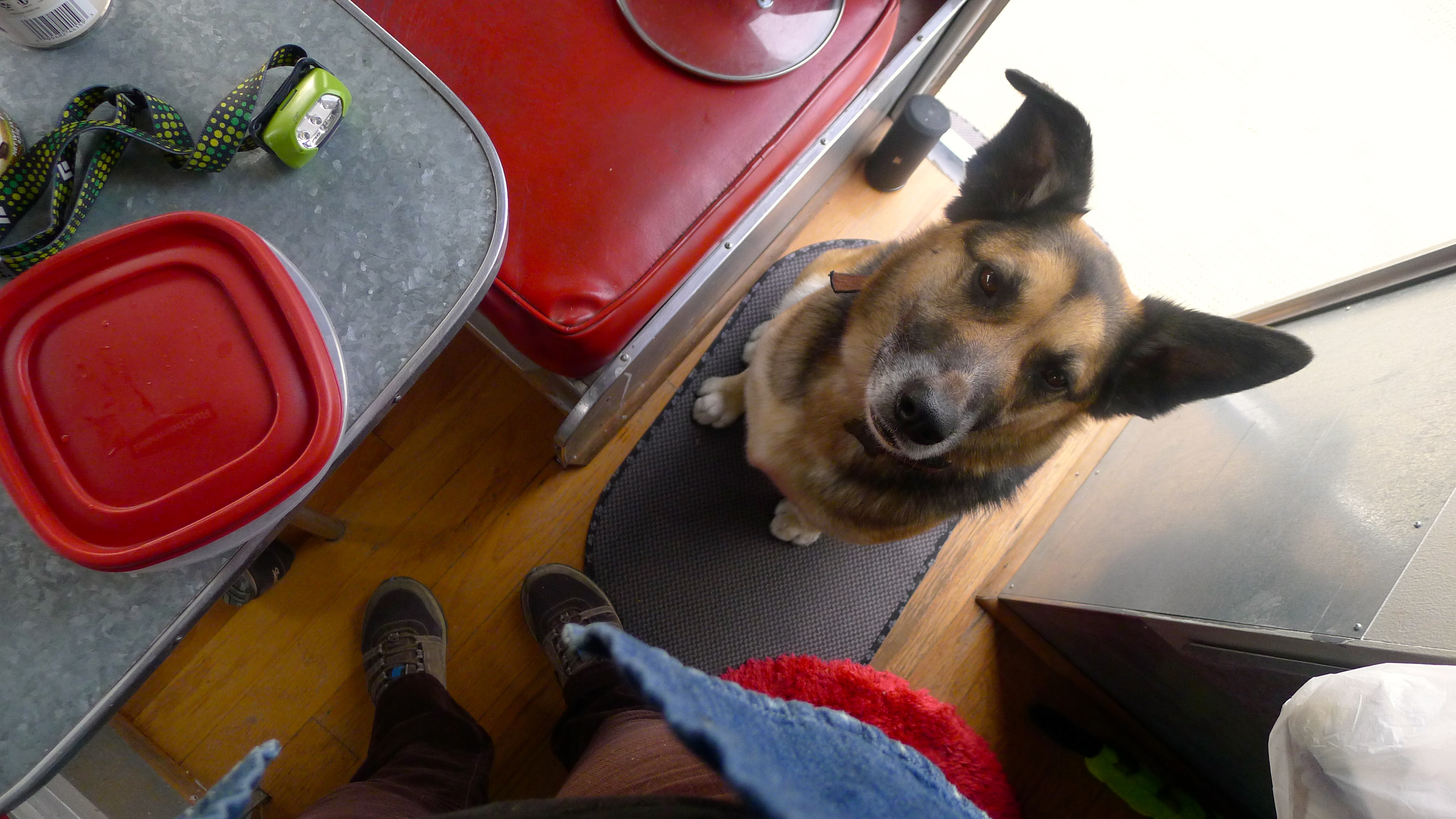 The key to a happy life in old Betty (with two adults and a largish dog) is organization. Clutter doesn’t work in our tin box. Everything has its place, and when we’re done using something, it goes right back to its home. Betty has a little sink but we don’t use the water pump; we fill smaller containers with water from a huge jug in the truck. Washing and putting away all of the dishes after every meal means more space in the trailer and keeps things tidy.