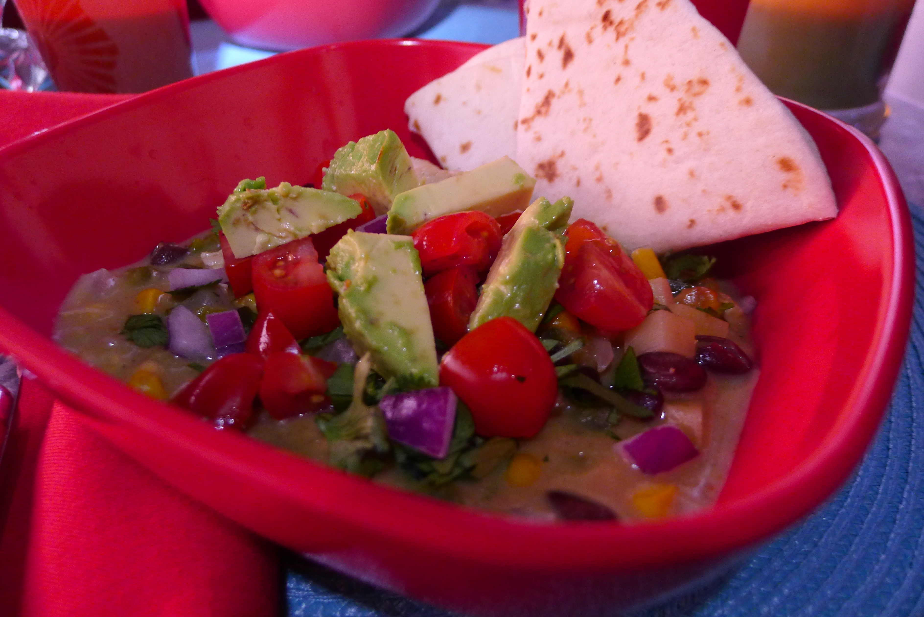 After a half hour or so (stirring the soup occasionally), I added the rest of our cheddar cheese, which was a heaping cup or so. When the cheese melted, I tasted it and adjusted the seasoning. To add freshness, I prepared some toppings: chopped grape tomatoes, fresh avocado, some red onion bits, and cilantro. John warmed up some tortillas in a little foil on the grill. Chow time!