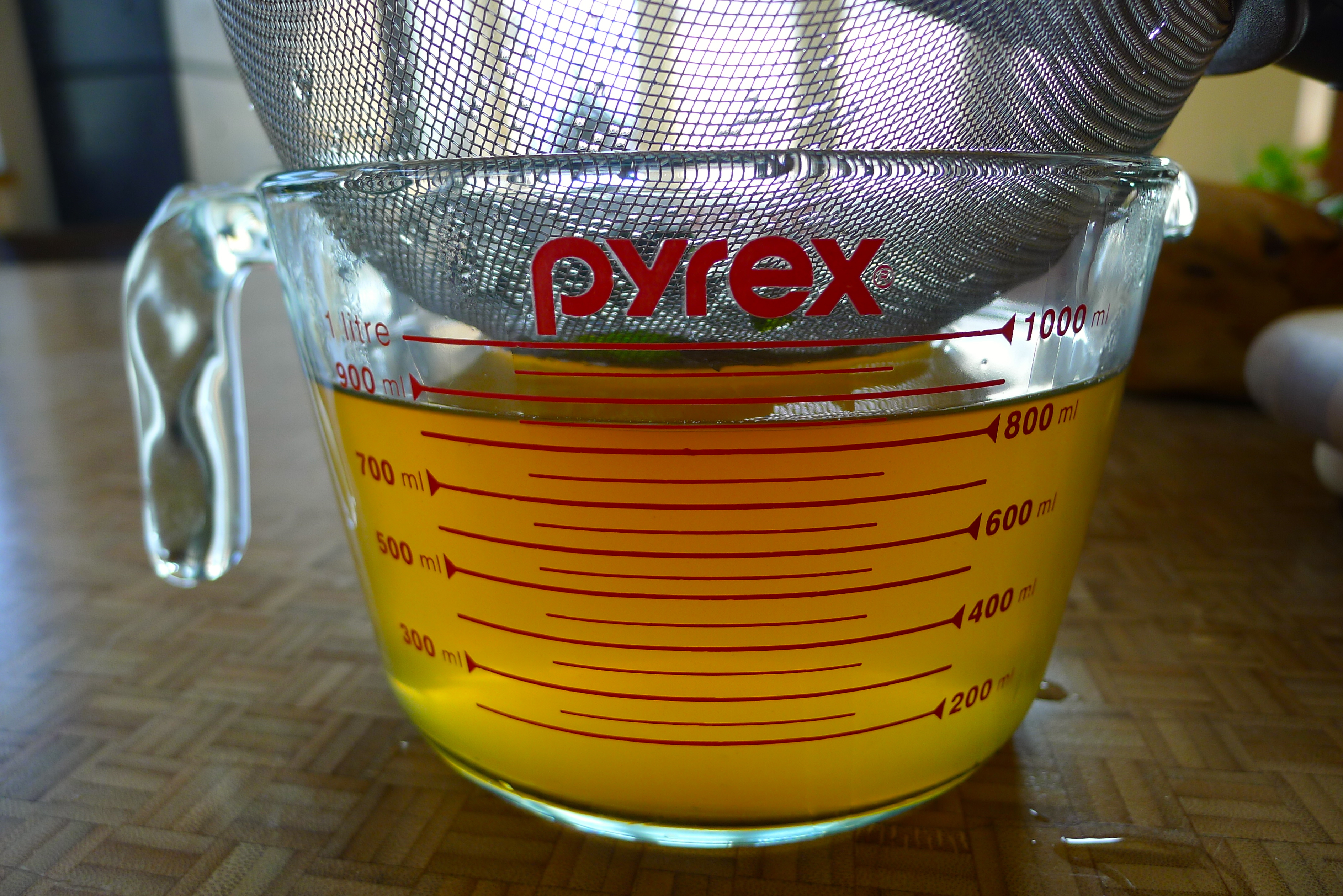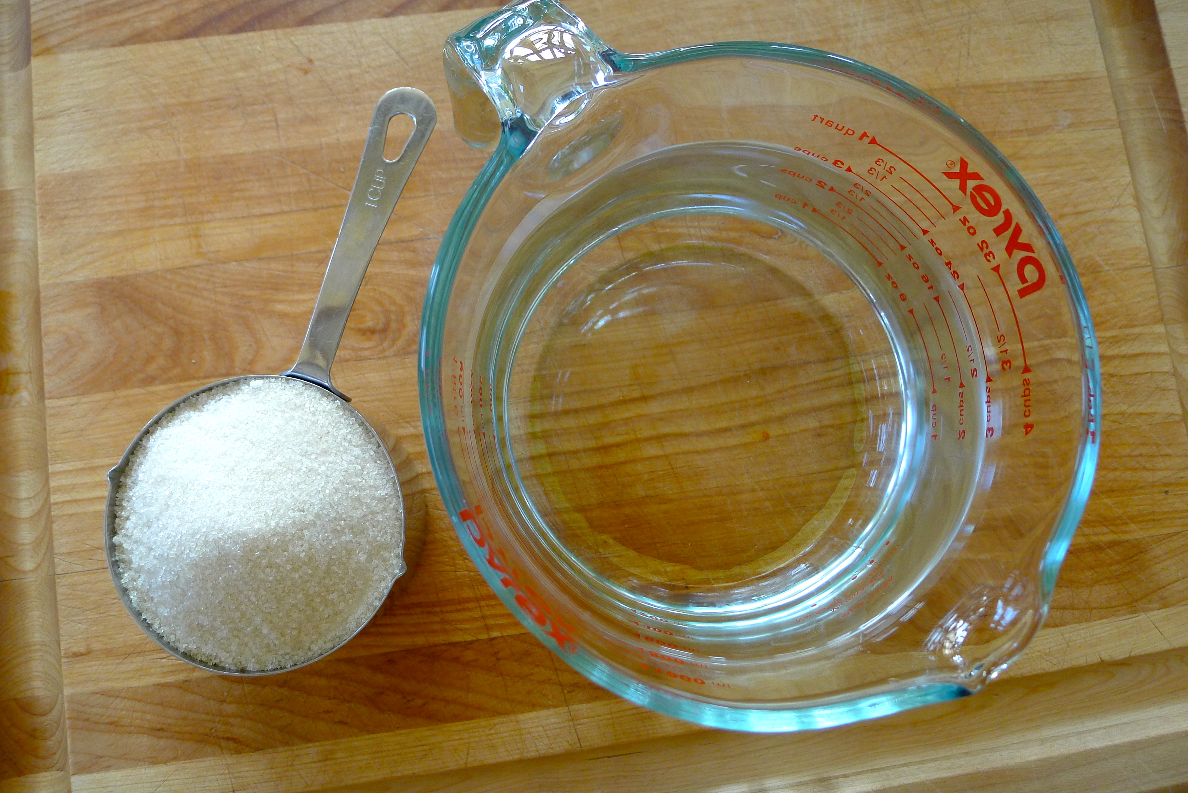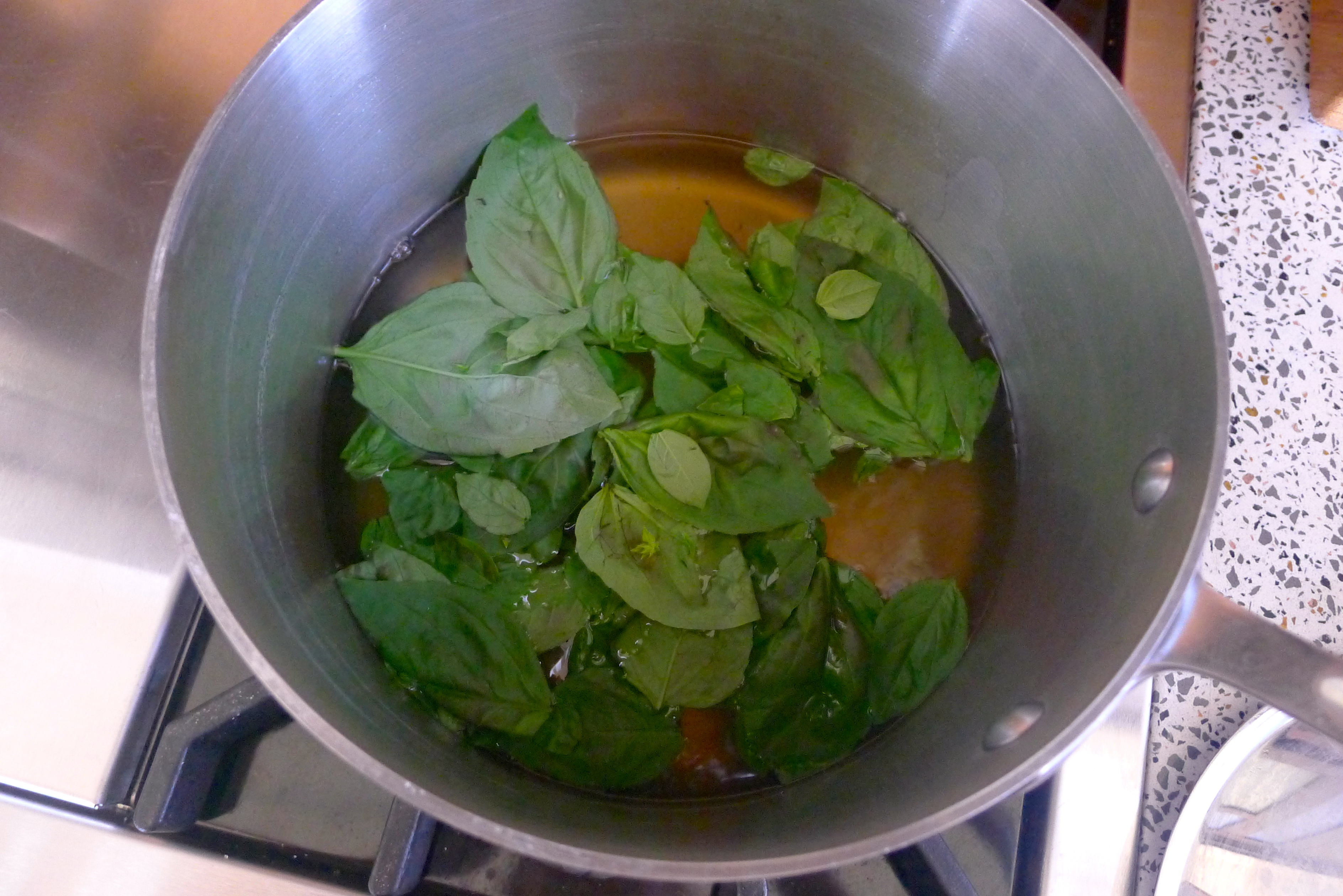 I started by making a simple basil syrup by boiling a heaping cup of sugar and some water on the stove. When the sugar had dissolved, I added a big handful of fresh basil leaves, removed the pan from the heat, and put a lid on it.