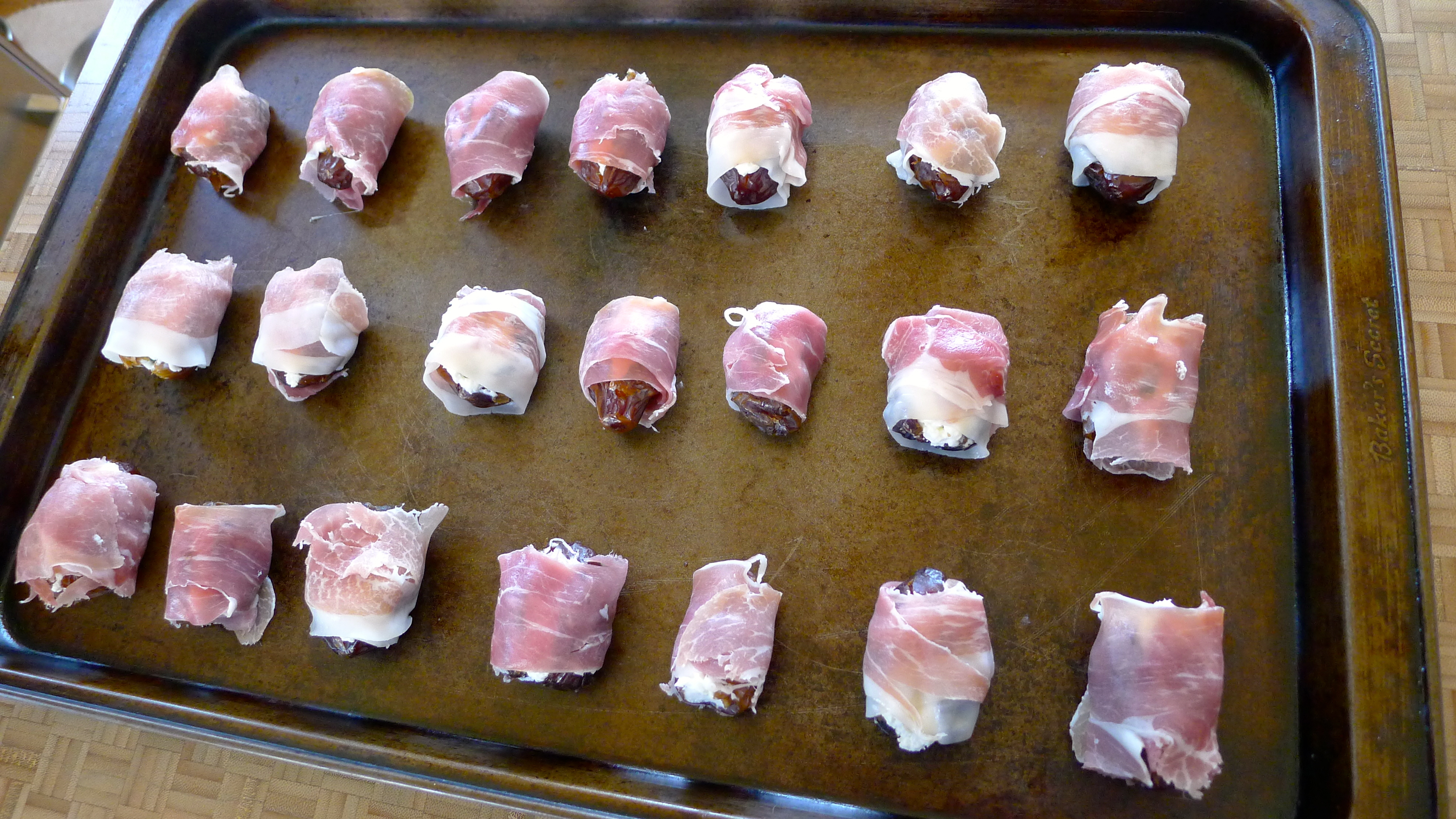 Here’s how I made the spicy stuffed dates. After slicing the date to remove the seed, I spooned a bit of soft cream cheese into it. I tucked a jalapeño slice into the cheese and wrapped the whole thing with prosciutto.