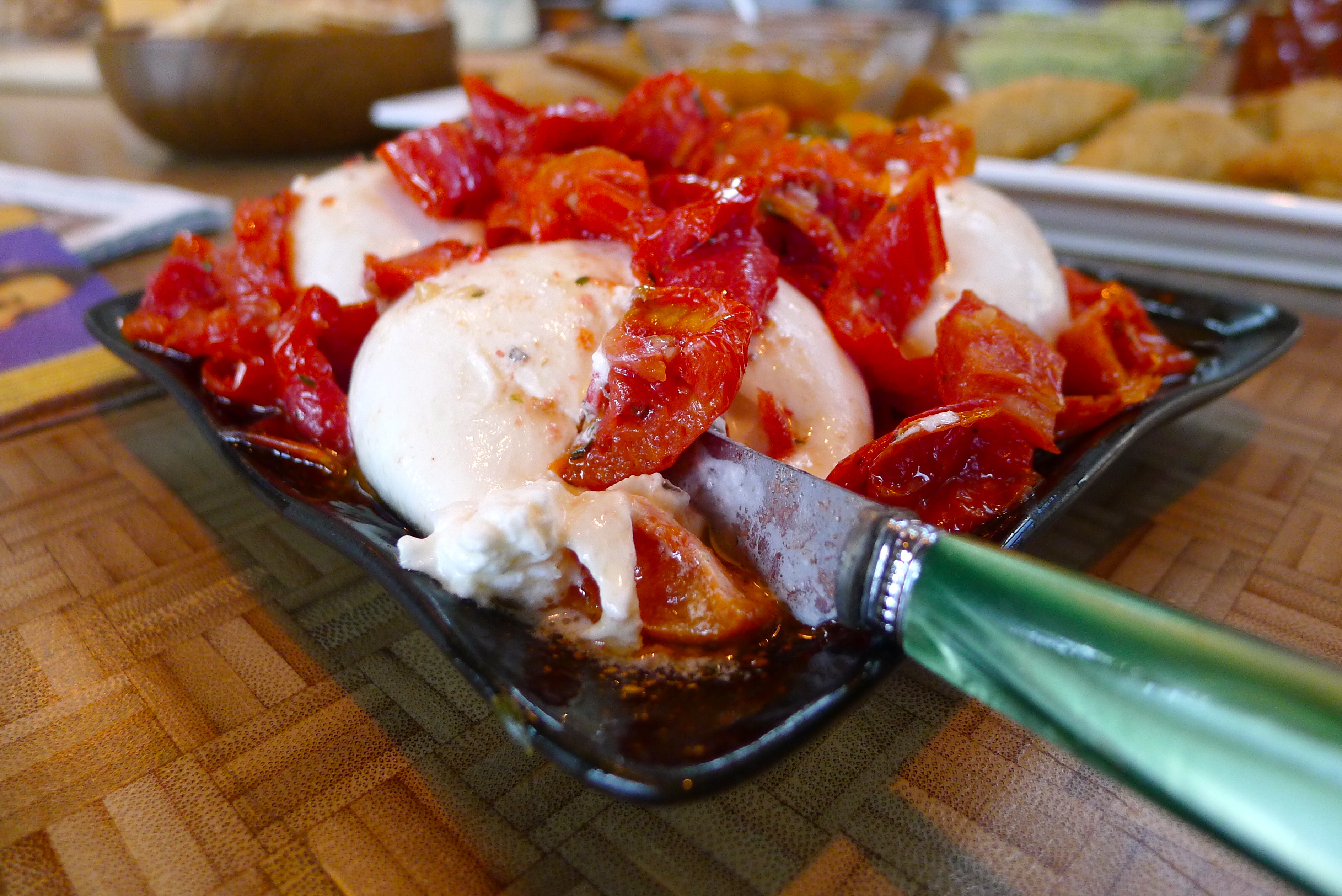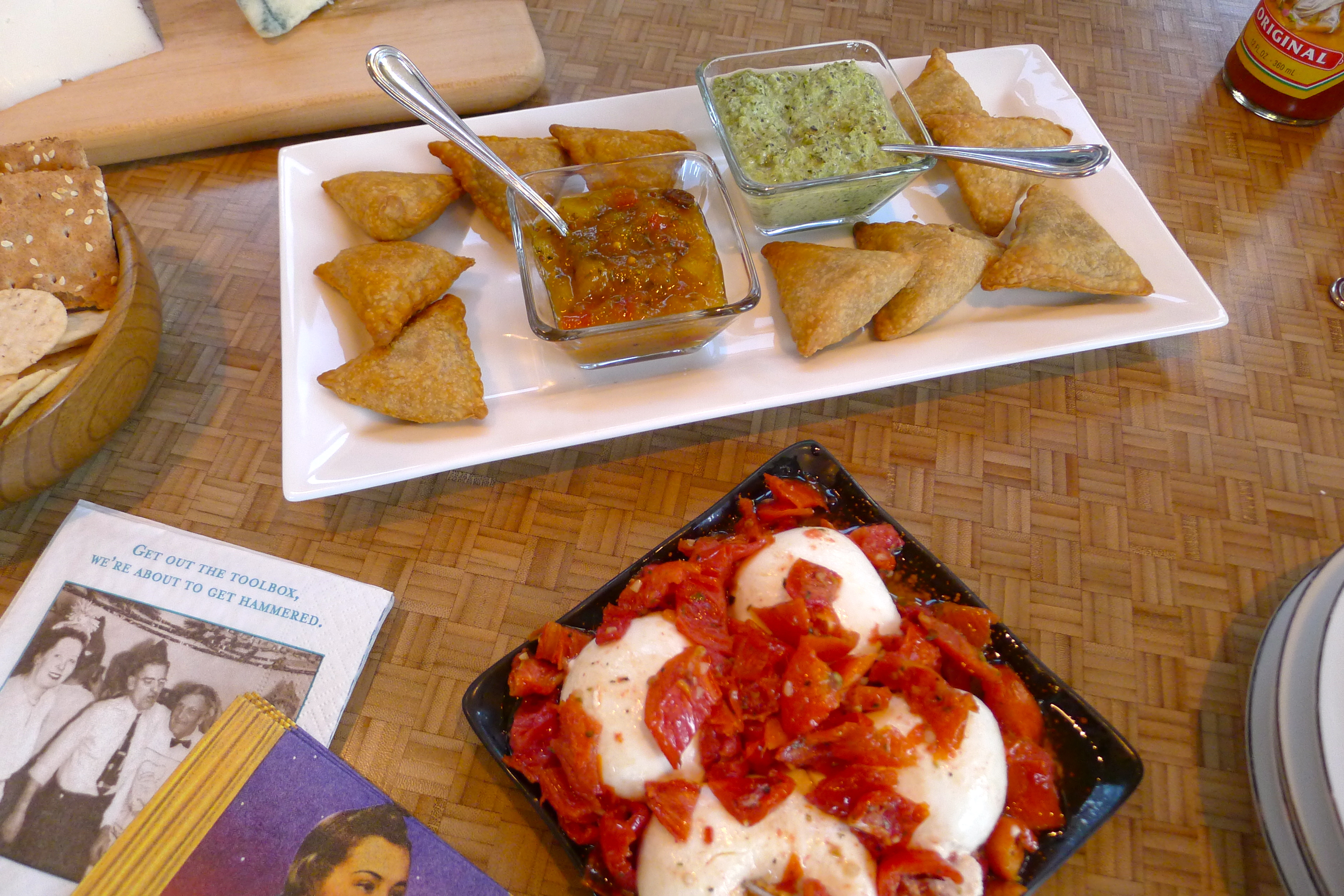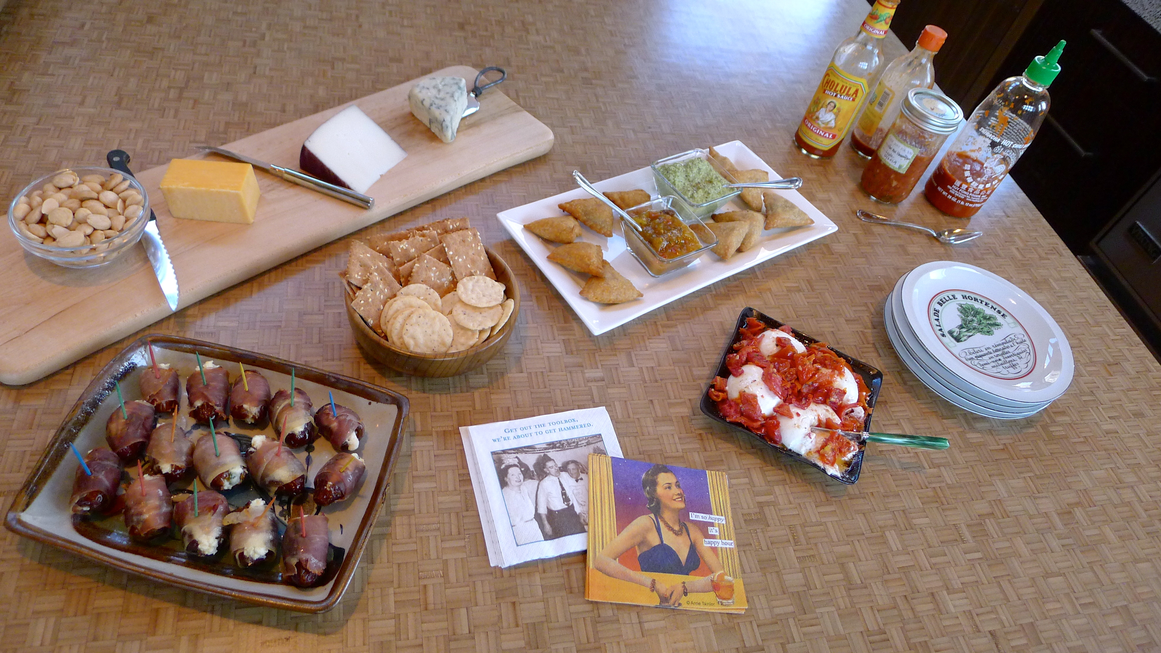 I try to keep a few things in mind before a get-together: make things ahead of time, keep it simple, and don’t be afraid to try something new. We recently had a few friends over for dinner, which gave me the opportunity to come up with something fun to snack on: prosciutto wrapped dates stuffed with cream cheese and jalapeño. These tasty little bites were part of a larger happy hour. To make it easier on myself, I jazzed up some store-bought snacks to accompany the homemade ones. I poured roasted tomatoes from the olive bar over creamy burrata: done. I toasted frozen samosas and served them with two sauces, a jarred chutney and leftover poblano sauce: done. I picked up some buttery Marcona almonds and a few good cheeses: done!