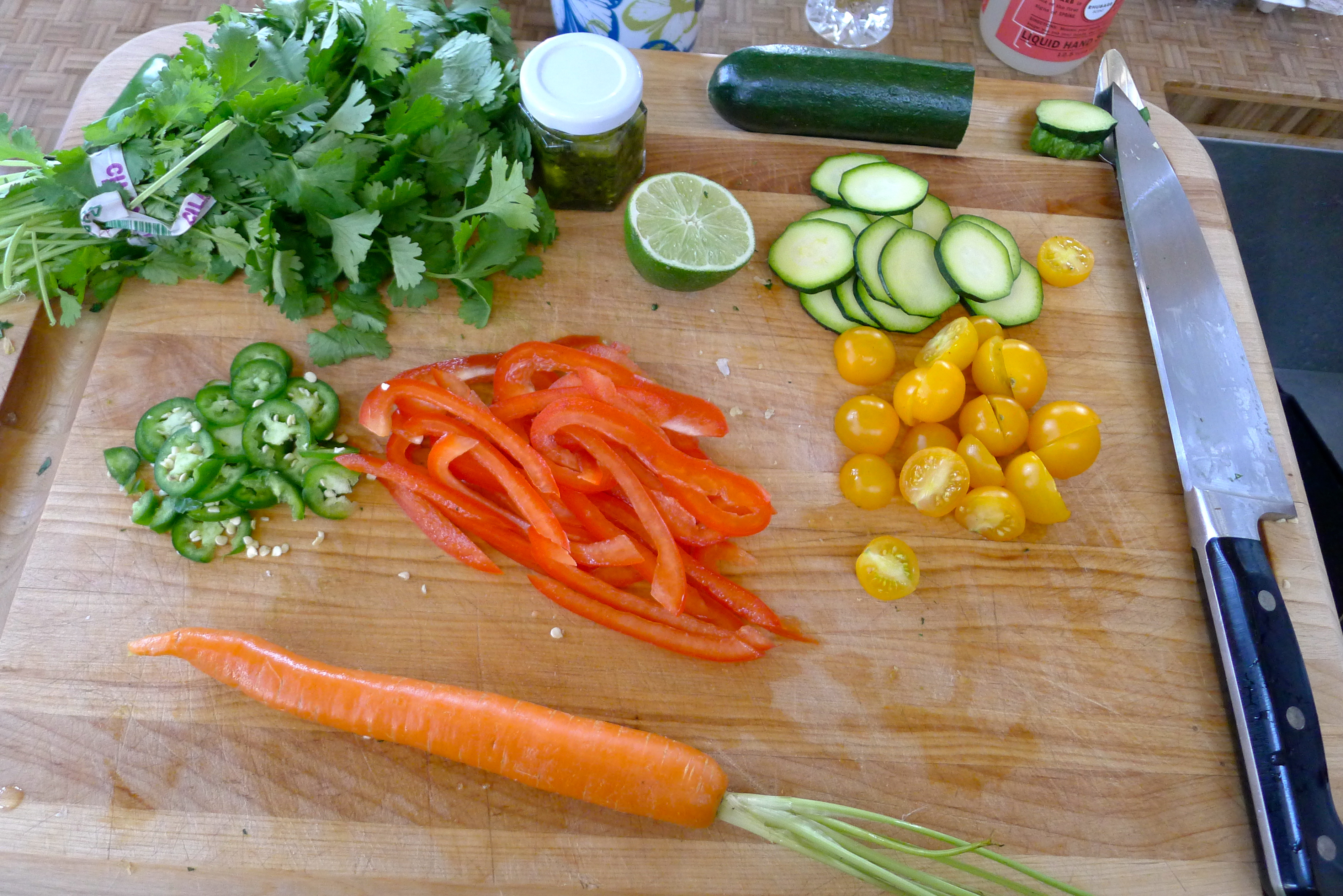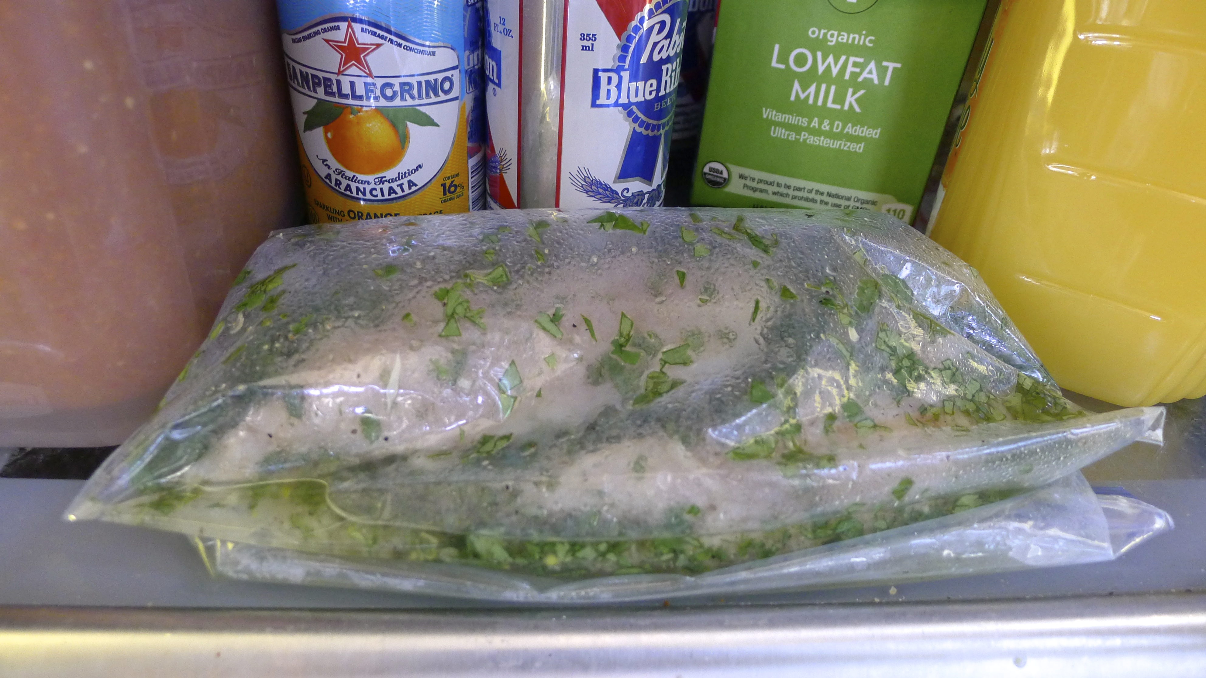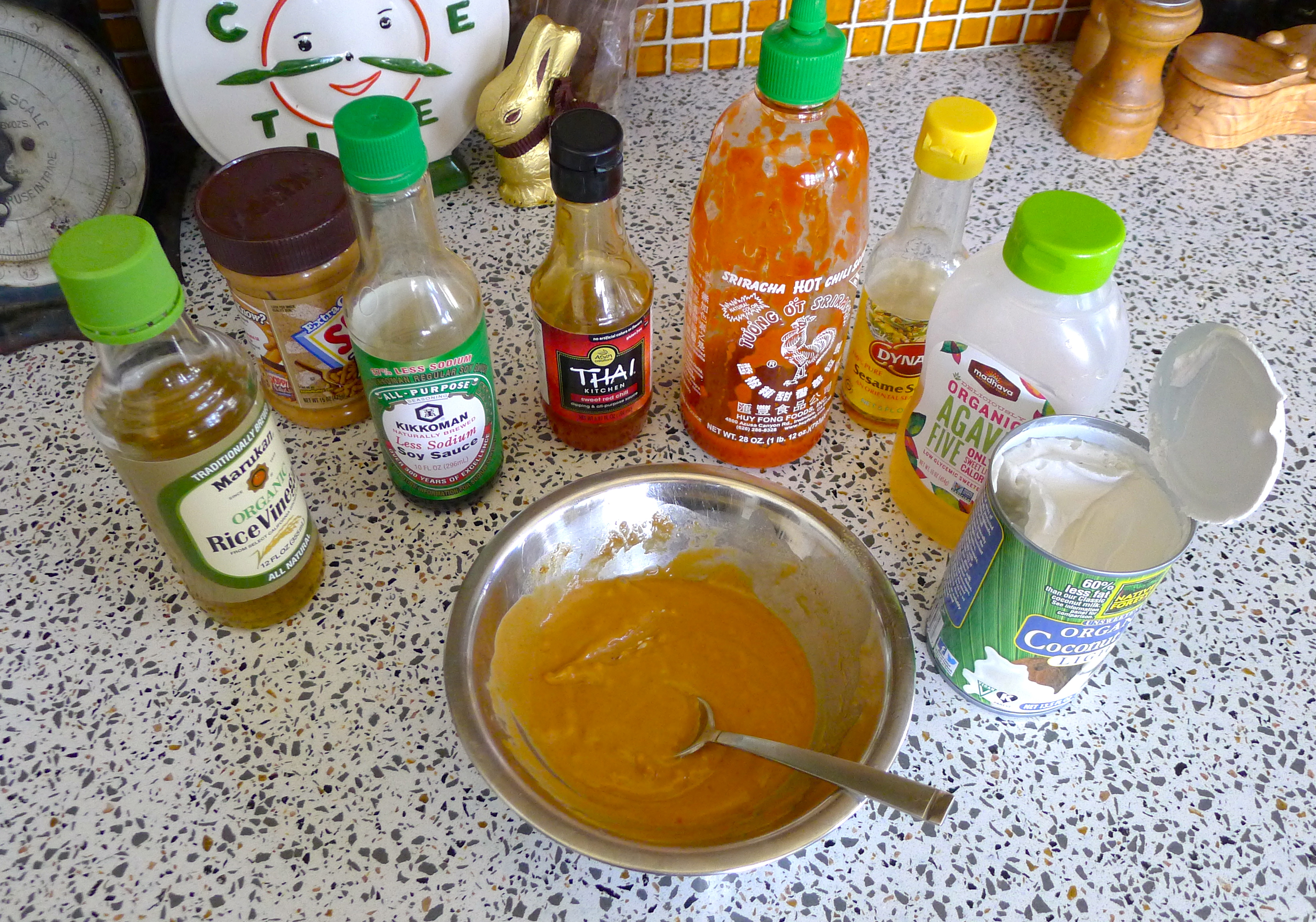 My thought was to use the spicy peanut sauce that we drizzled over our tacos as the “sauce” for the pizza. The taco toppings would become pizza toppings. Brilliant! We make pizza at home often, so that process was familiar. I’d made the main components of the Thai tacos a few times, so that was easy, too. I started by marinating the chicken in the tasty combo of Asian flavors I’d used before, like rice vinegar, cilantro, mint, and lime. The chicken swam in the marinade for a couple of hours and John used it to baste the bird as it grilled.