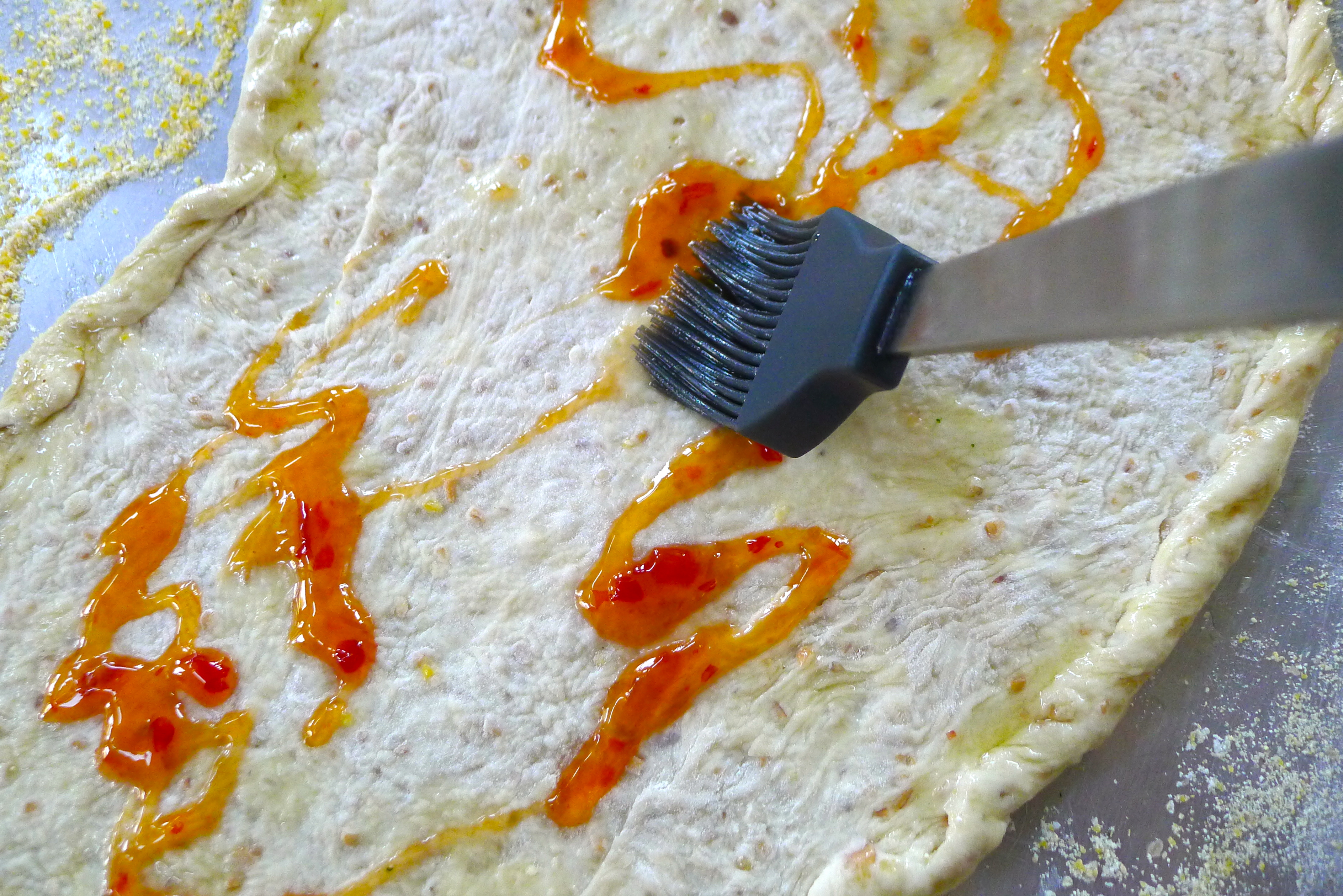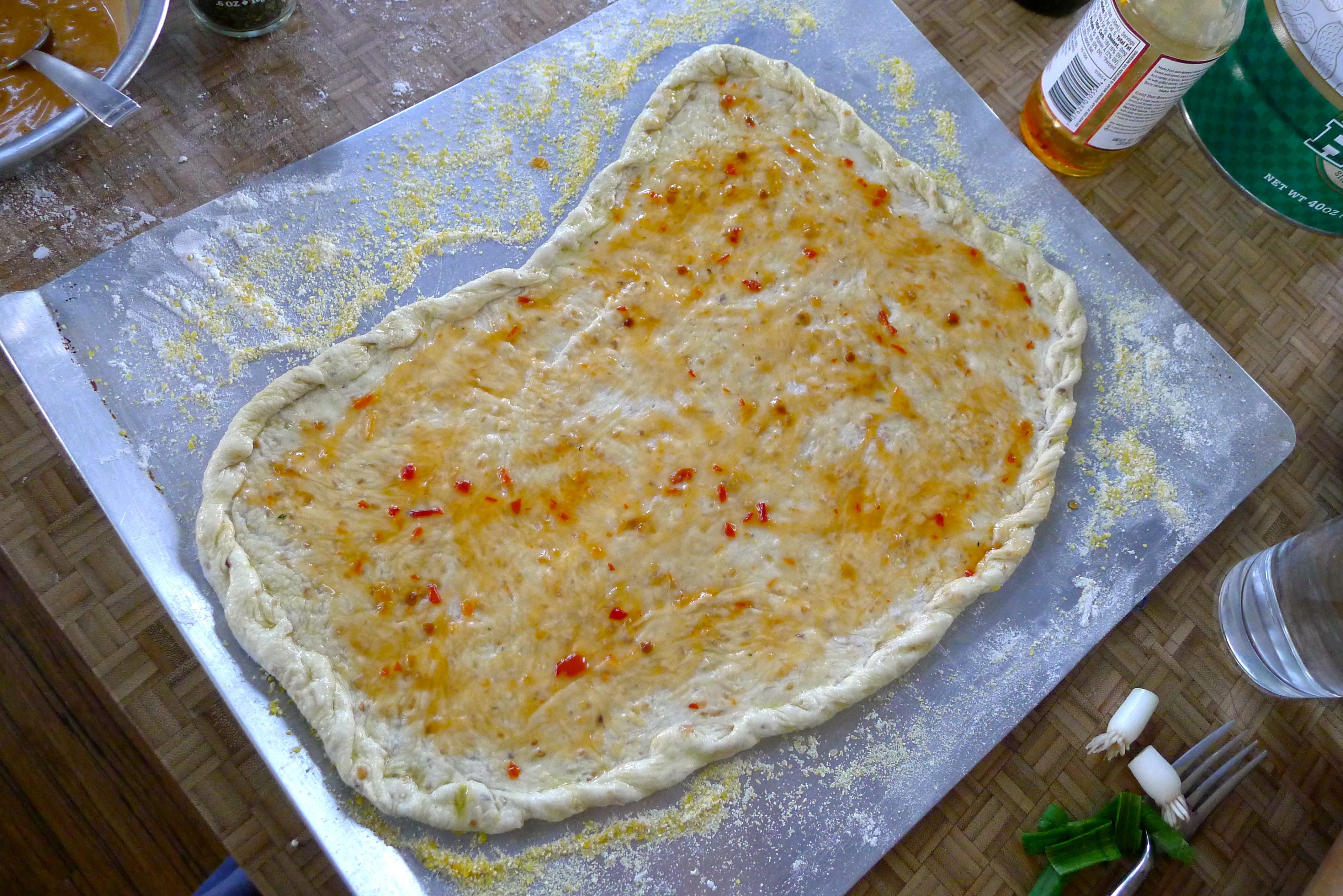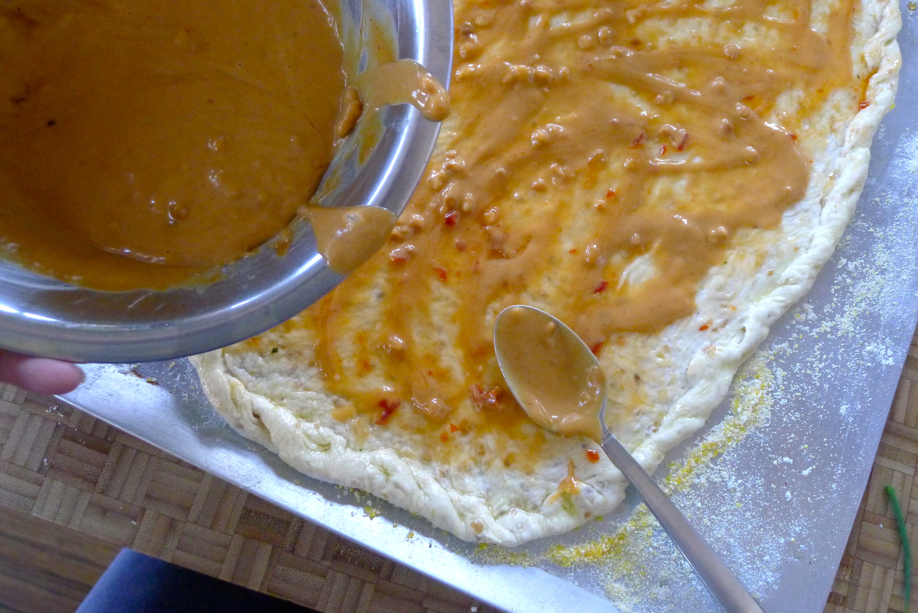 The peanut sauce would sub in for traditional marinara sauce. I whisked together the peanut butter, soy sauce, rice vinegar, Sriracha, lime, and a little coconut milk, using the same recipe as I did last summer. On our trusty wheat dough (courtesy of Whole Foods), I oiled the edges and spread some sweet Thai chili sauce over the crust, followed by the peanut sauce. Let’s build the pizza!