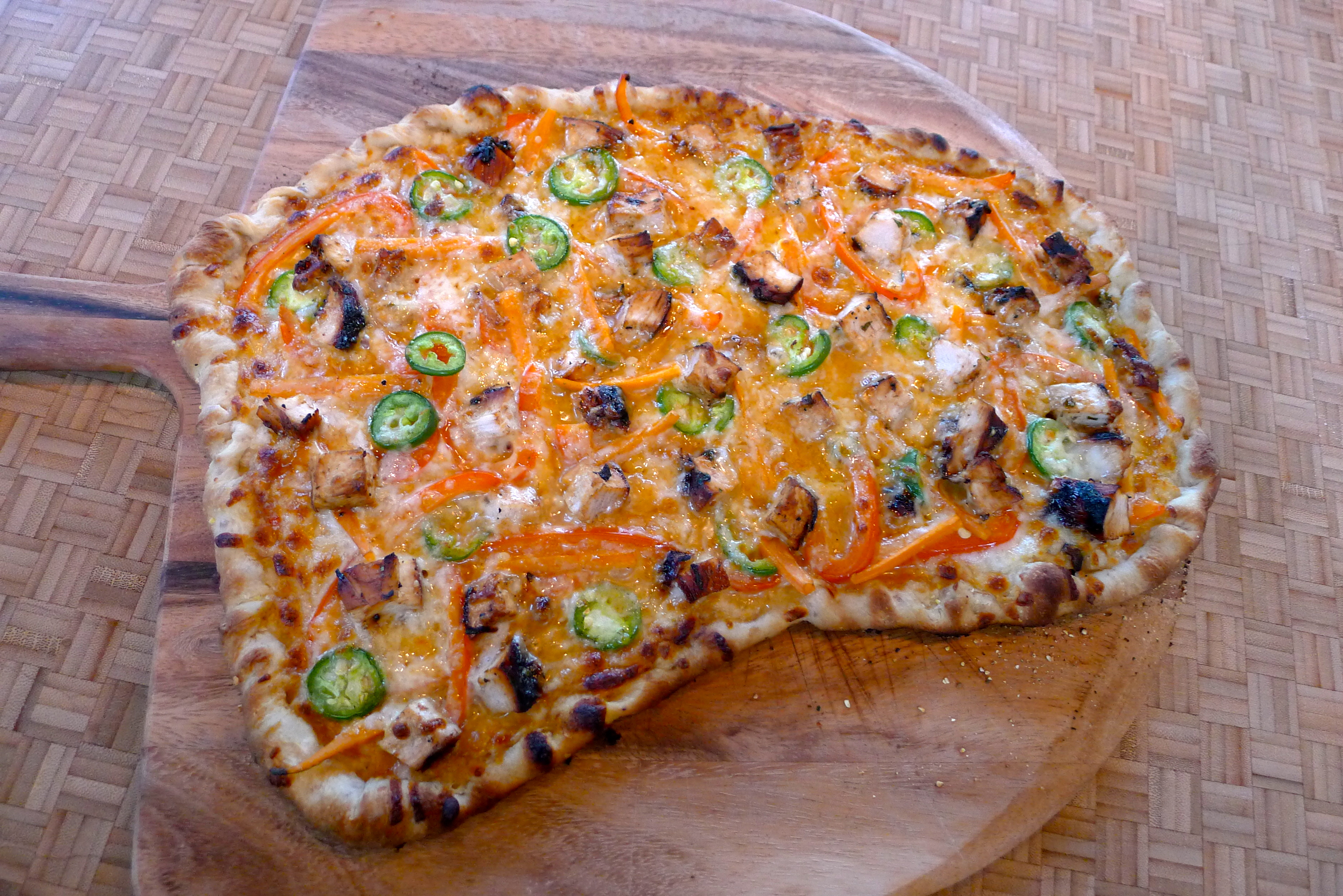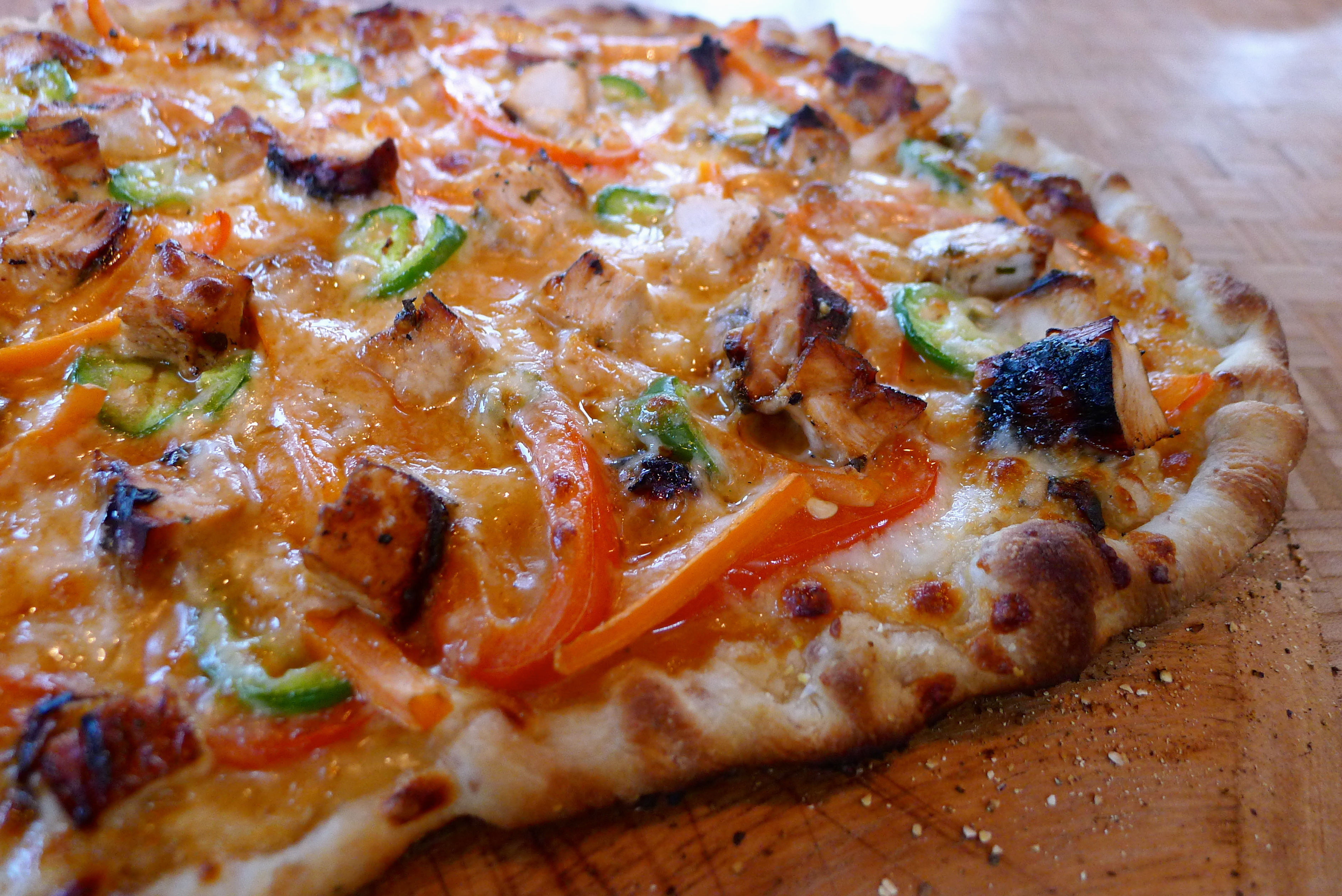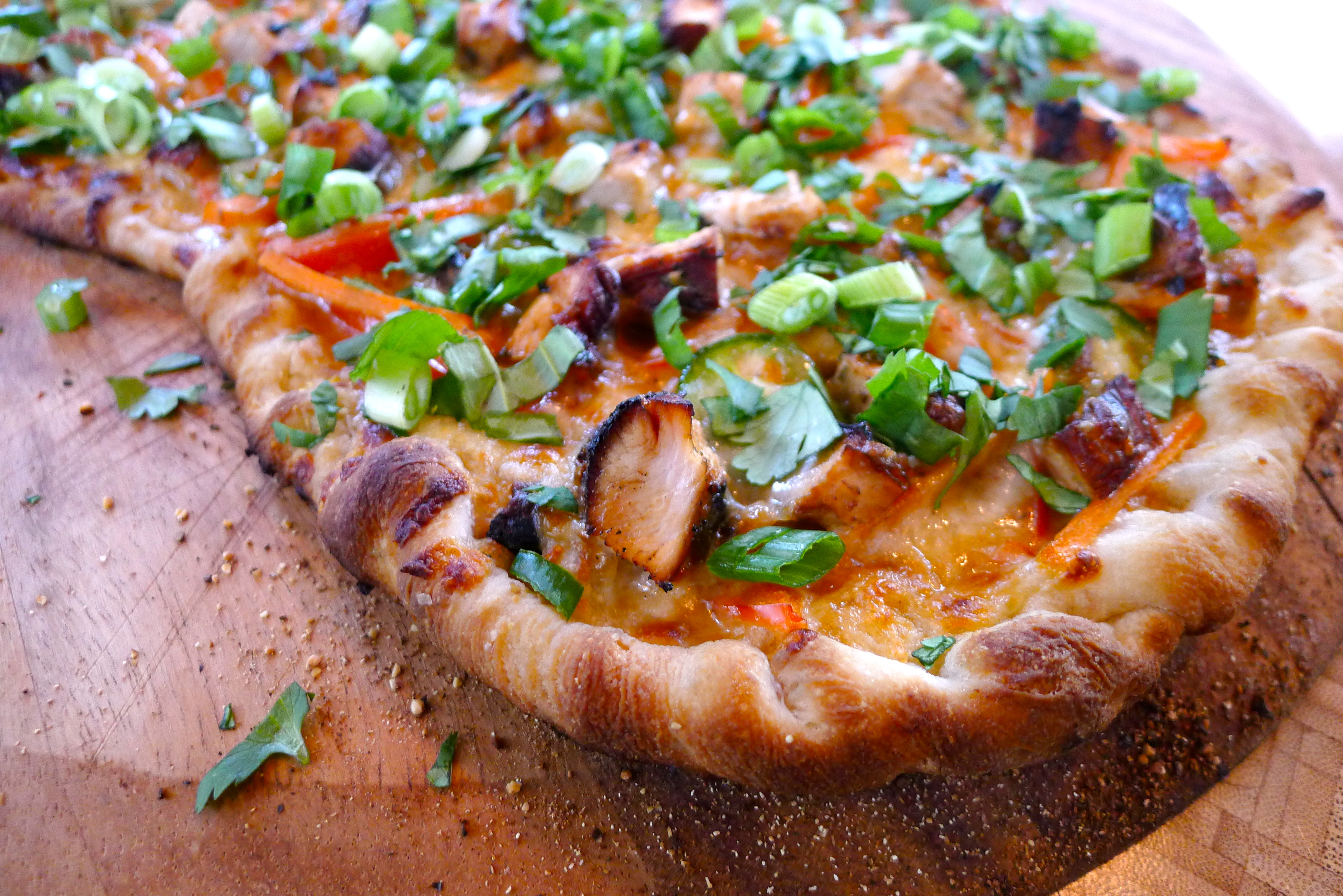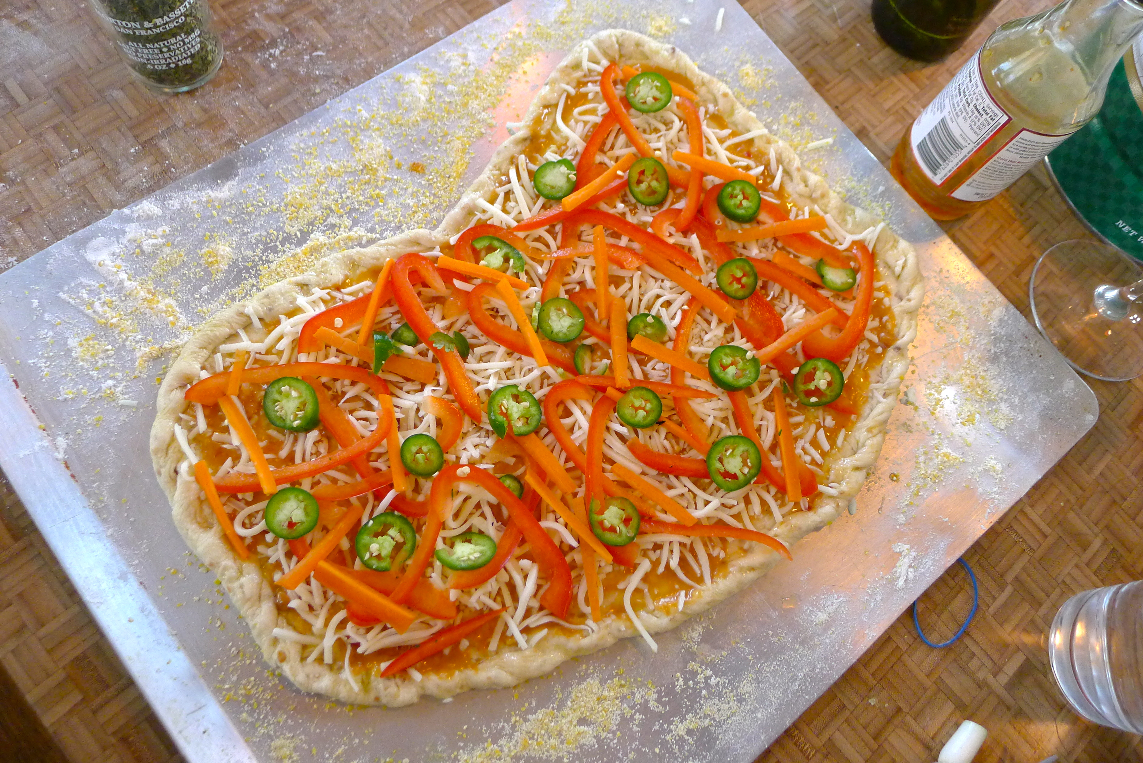 Cut the dough in half. On a well-floured surface, roll out a ball of dough to a ¼ inch thickness. Transfer to a flat baking sheet covered in flour and cornmeal. Roll the edges of the dough and brush the edges with olive oil. Brush the sweet red chili sauce over the crust, followed by an even (thin) layer of the peanut sauce. Sprinkle a sparse layer of mozzarella cheese. Add carrot, bell pepper, and jalapeno. Add chopped chicken and another layer of cheese. Transfer the pizza to the pizza stone and bake for 6-8 minutes, or until the cheese is well-melted and the crust is browned. Repeat with the other half of the dough.