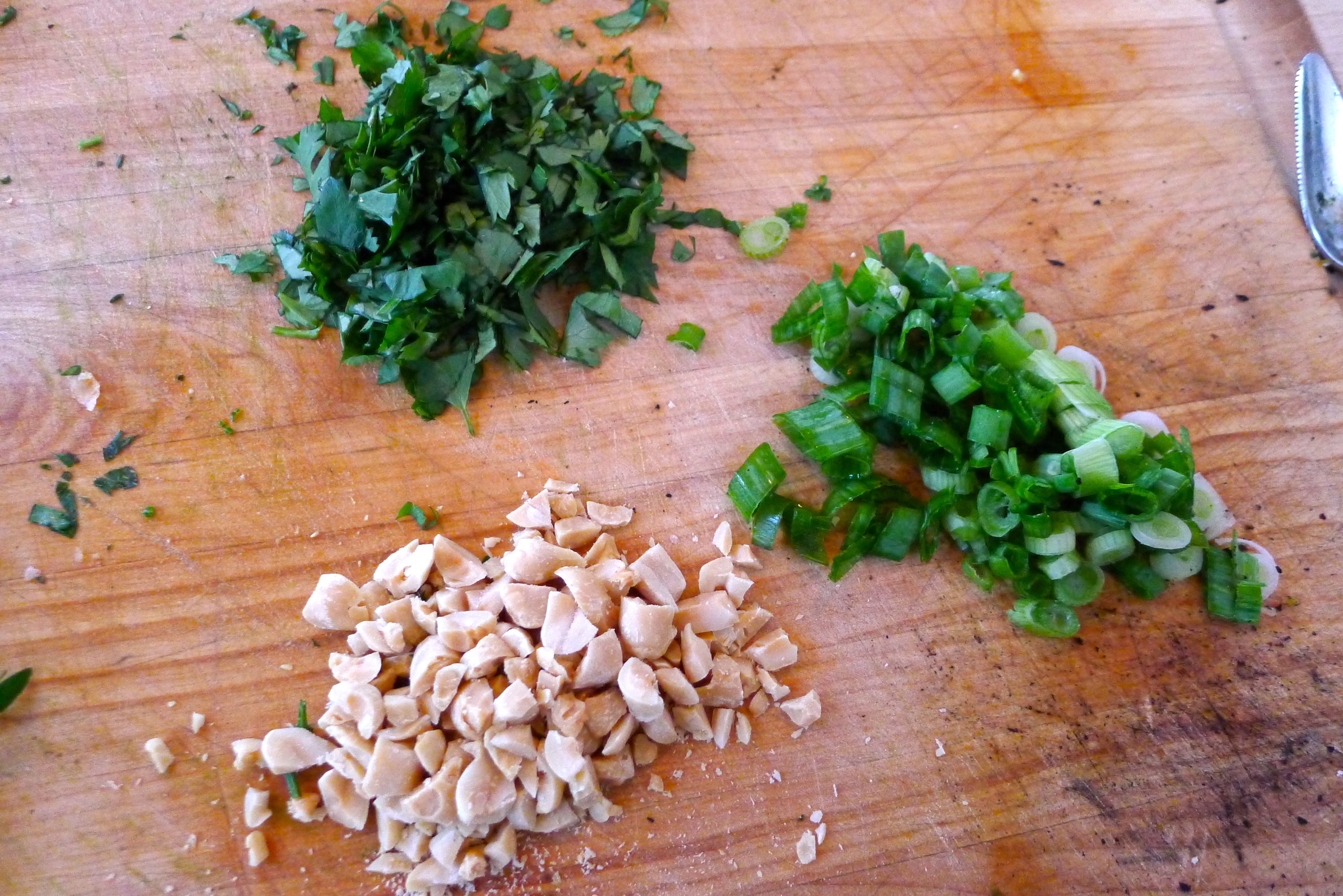 - Toppings: chopped peanuts, green onions, cilantro, more peanut sauce