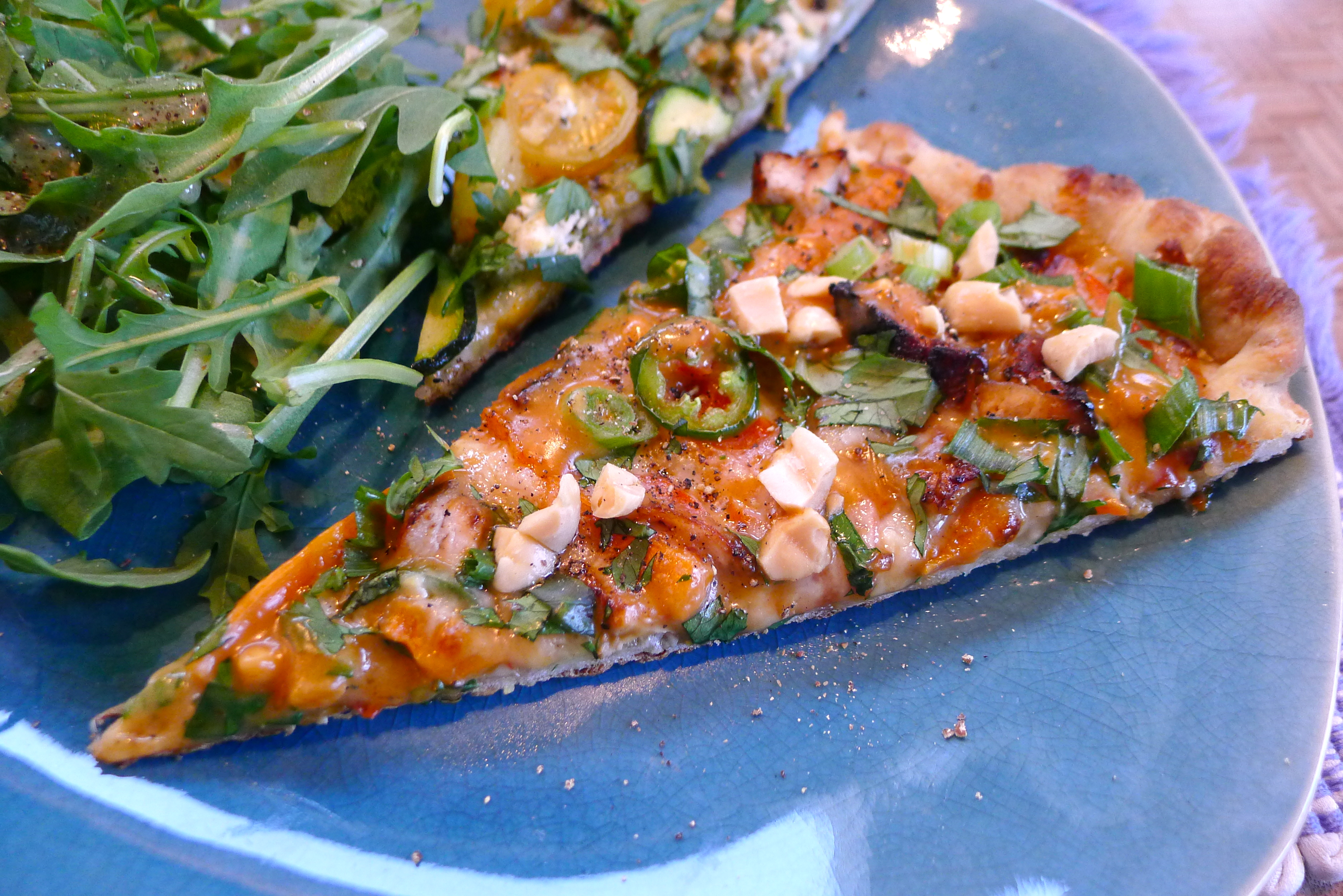 We’ve enjoyed those Thai tacos a few times since June, but the other night, we were in the mood for pizza. Mashing up cuisine types is a culinary pastime in this house (remember the fajita panini and the Mexican pizza?). The results of our experiments have been delicious…so we did it again.