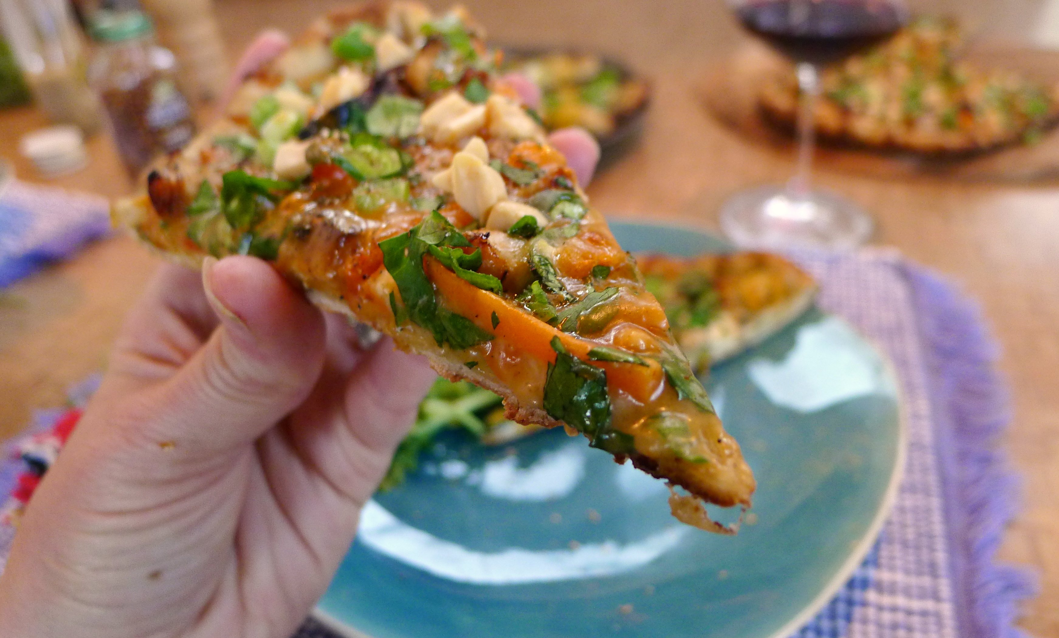 For serving, top the pizza with green onions, cilantro, chopped peanuts, and a drizzle of more peanut sauce. Daydream about when your backyard will look like it did in June and clink a glass to trying new things in the kitchen. YUM.