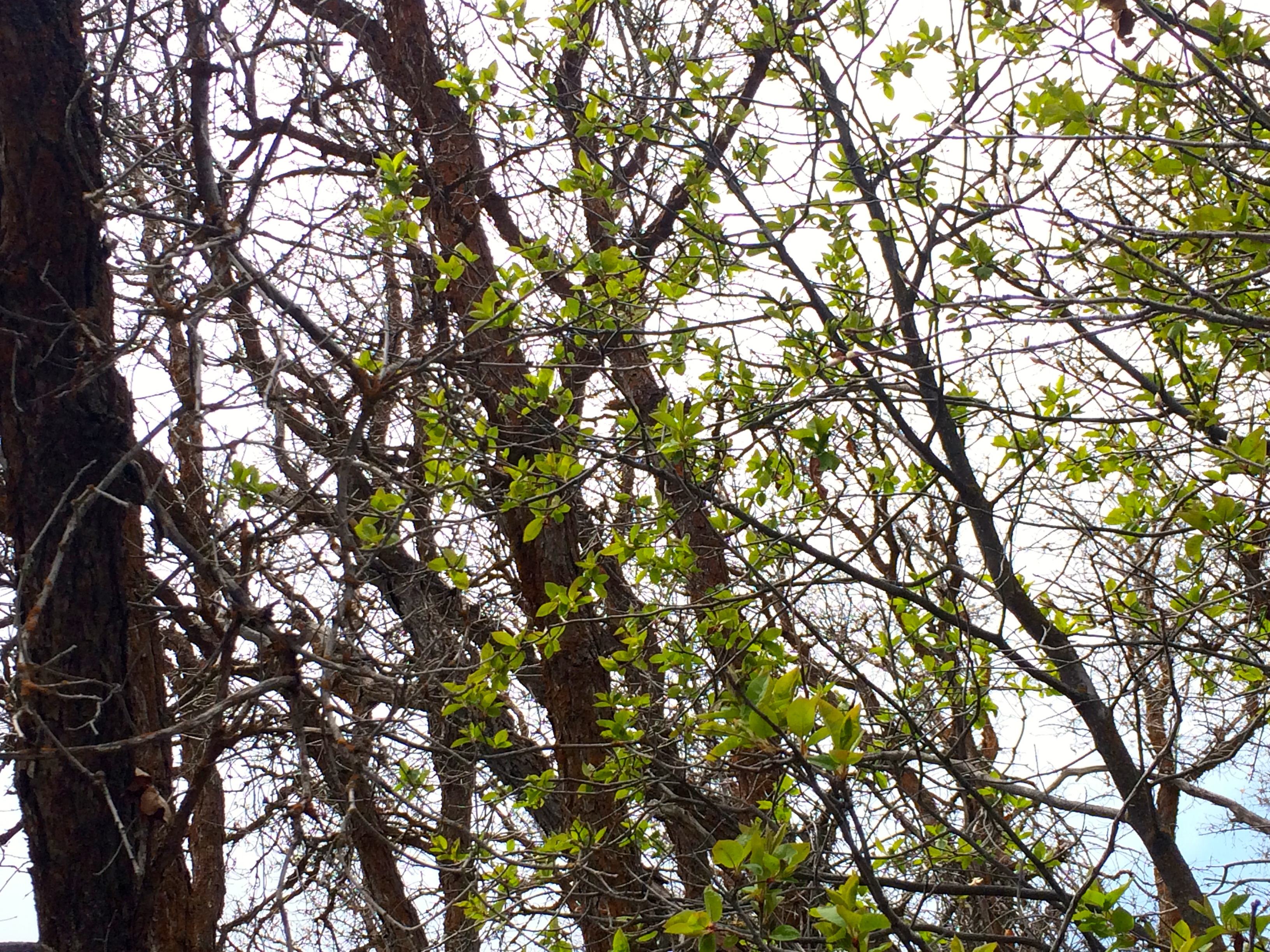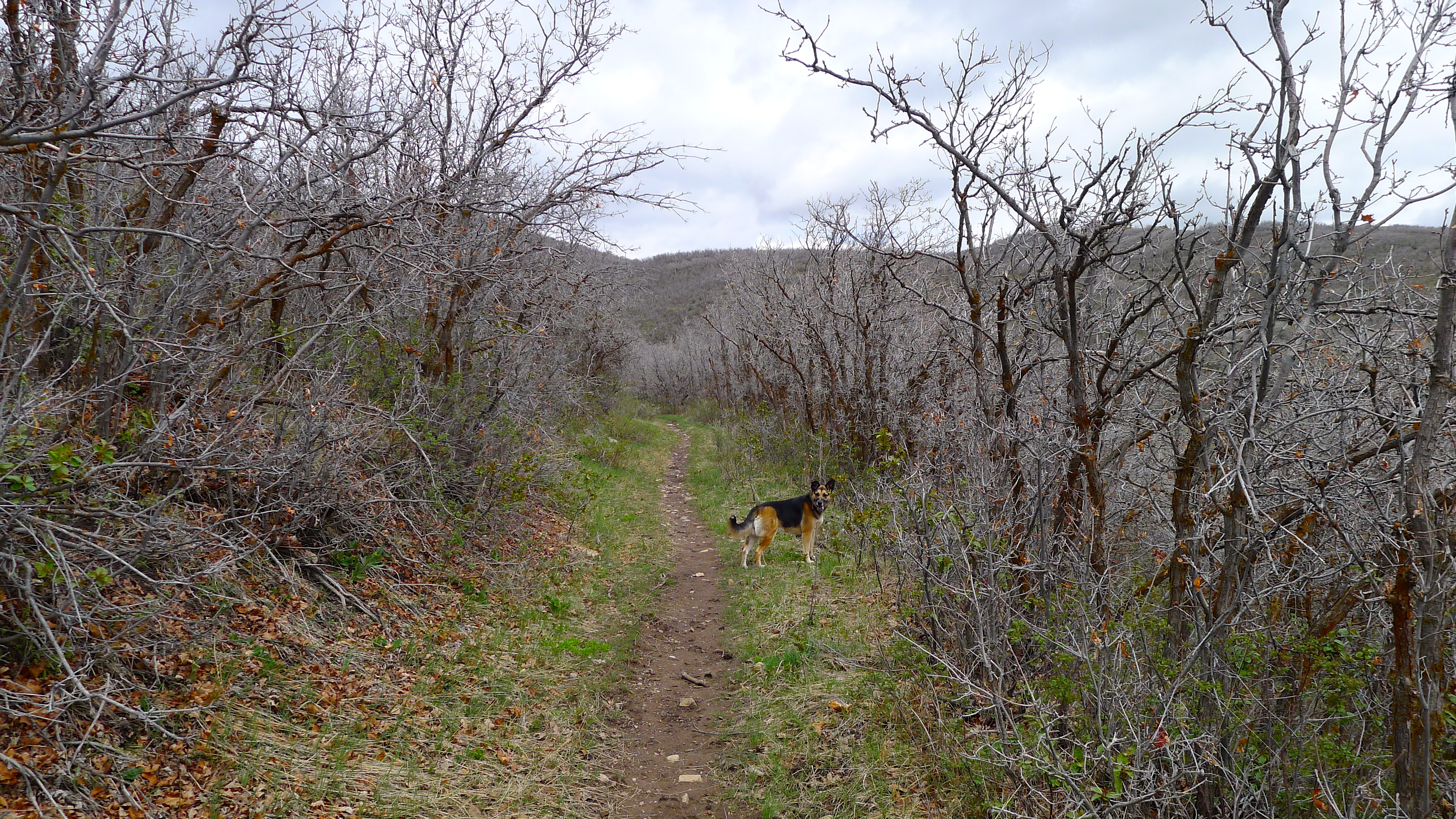 I hadn’t reviewed the info in the book before starting the hike, so I really just wandered along the trails and followed Cholula’s lead. After the pond, we headed left up into the canyon (instead of right, which would lead to the main trailhead). At a point where the trail split, I vaguely remembered that there was a loop section of the trail somewhere, so we headed left again. The rain threatened, but the grasses lining both sides of the trail were green and there were almost-ready buds on all of the trees. My instincts had been correct and the trail led back to the other side of the pond. Did I mention the view?