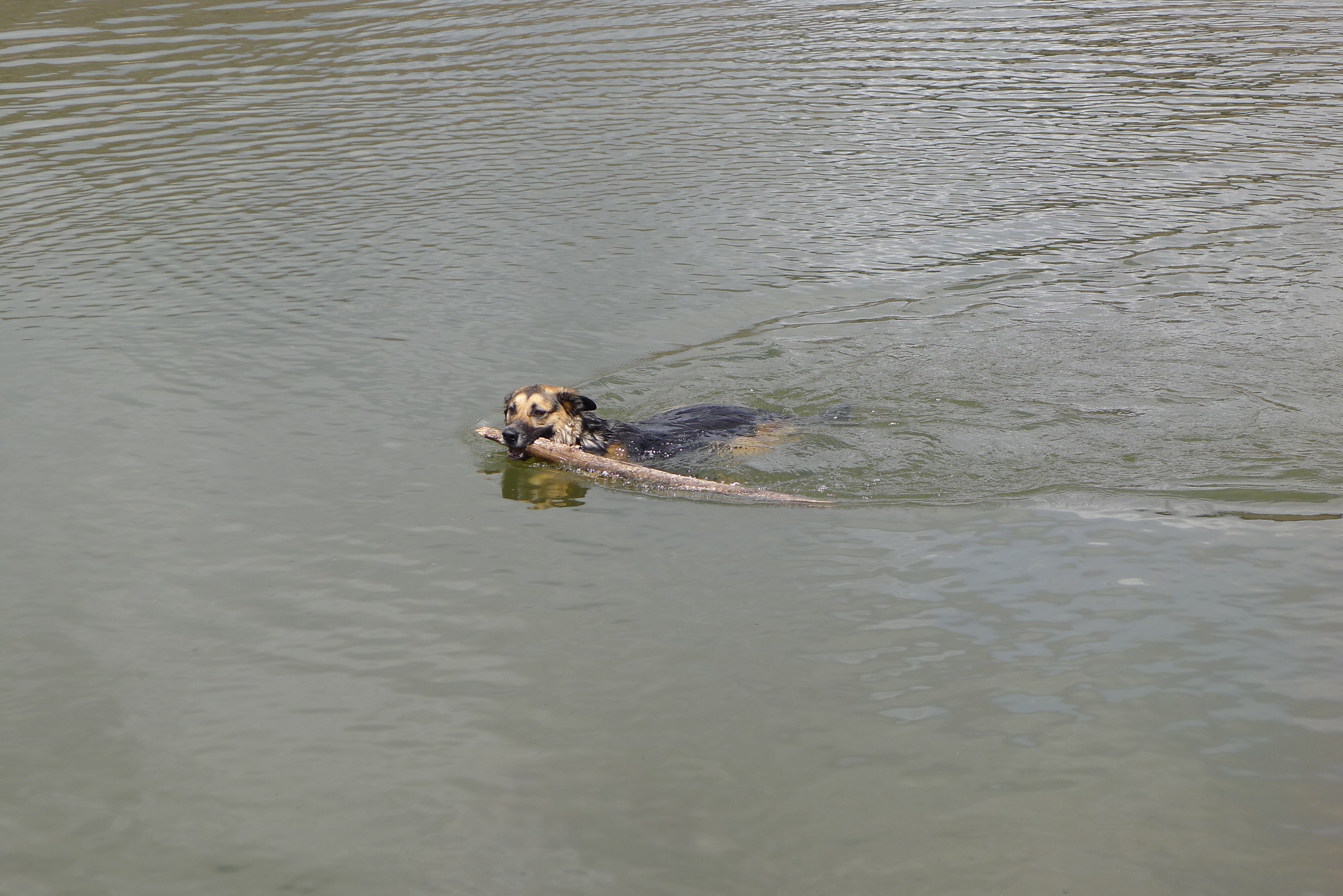 The mallard was probably thinking. “That dog just stole my stick!” But clearly, Cholula enjoyed the heck out of it.