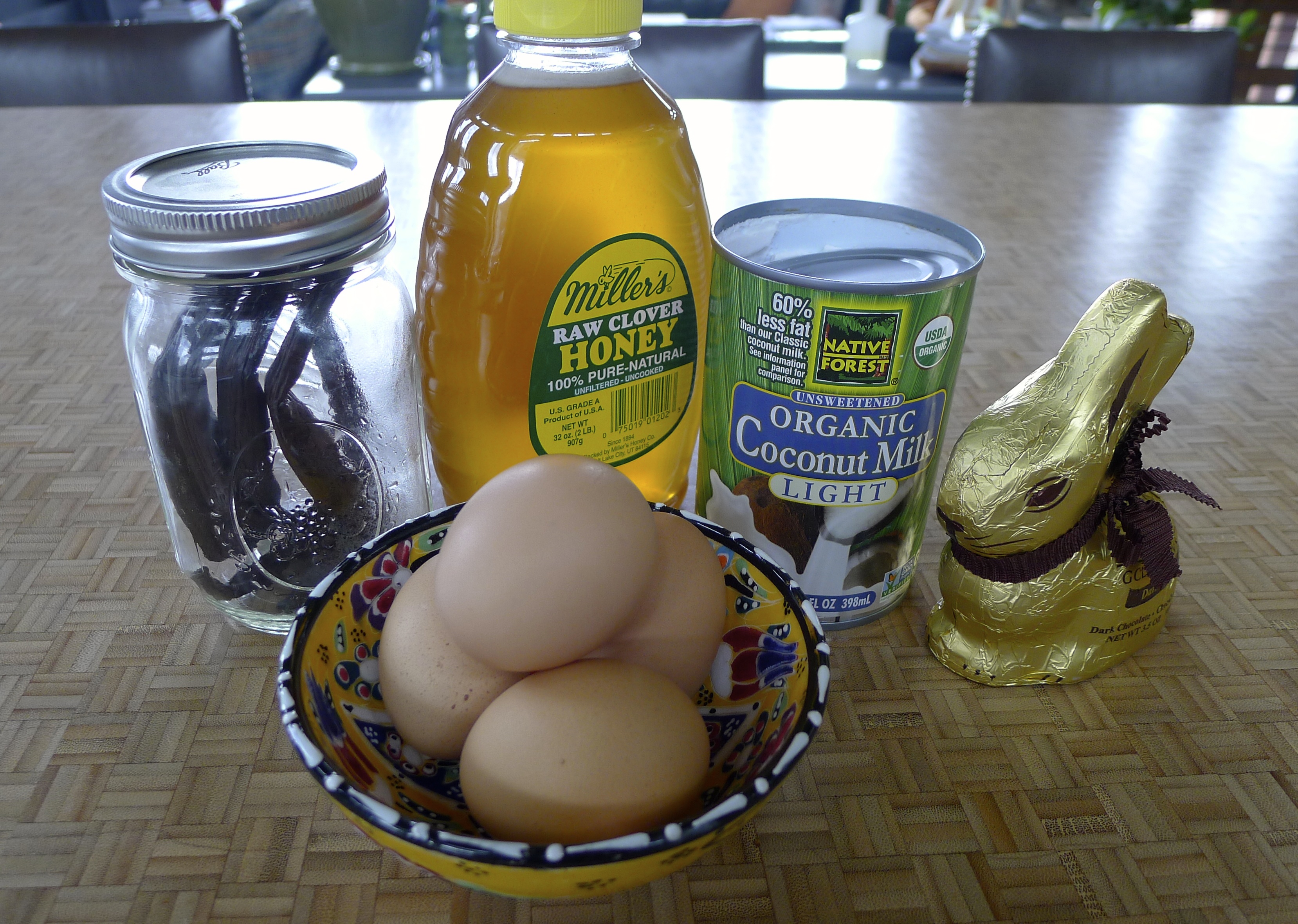 Our fabulous Thai Chicken Pizza uses spicy peanut sauce as the base, which requires a tablespoon or two of coconut milk. That left me with the bulk of the can leftover…what to do with it? Pinterest came to my rescue. While you wouldn’t know it from this weekend’s chilly weather, it’s almost ice cream season- perfect. After a little bit of research, I pulled a handful of ingredients together- eggs, a jar of Tahitian vanilla beans from our honeymoon that I keep meaning to use, some honey, my stand-by container of shredded coconut, and even a dark chocolate bunny left over from Easter.