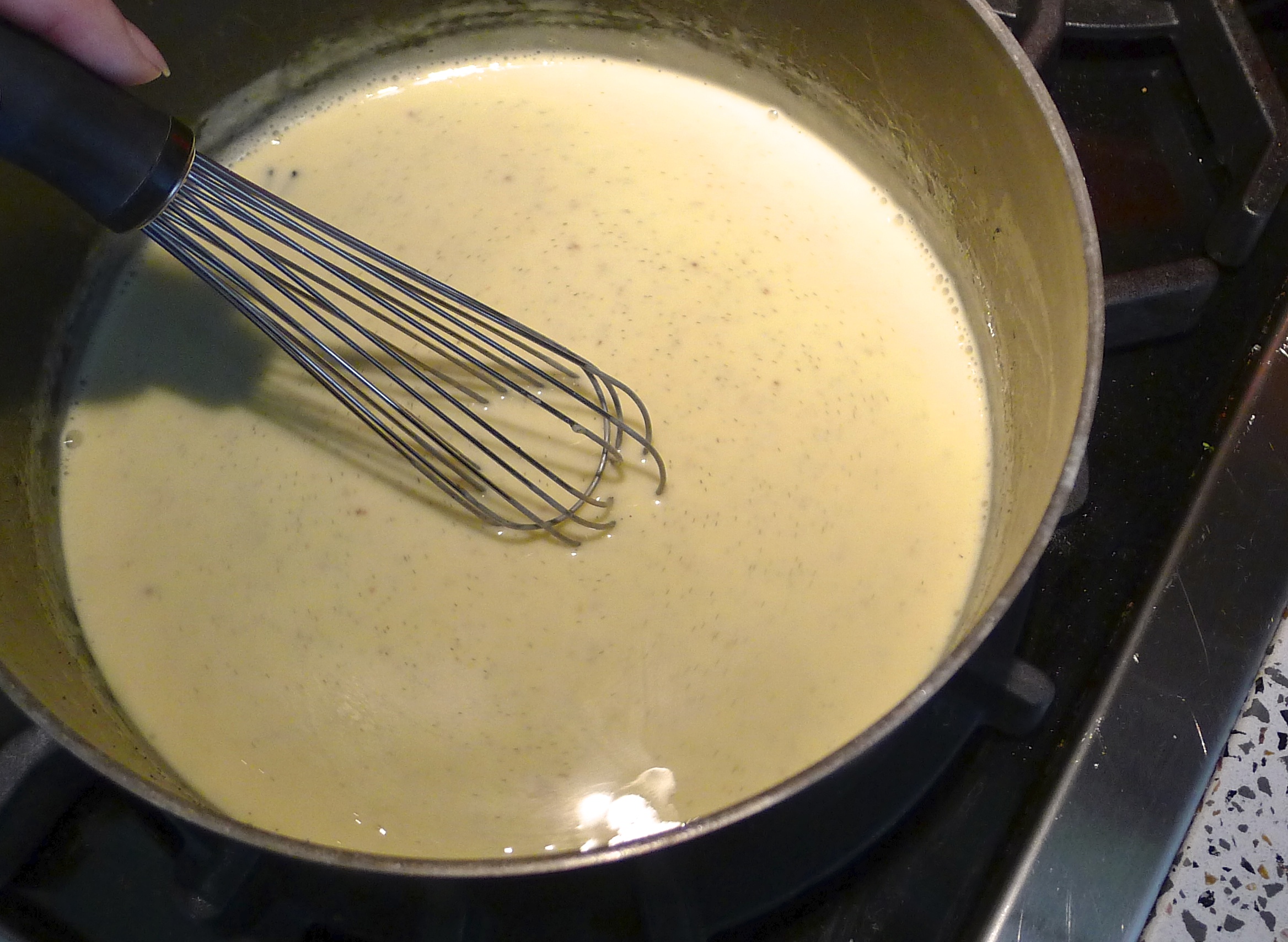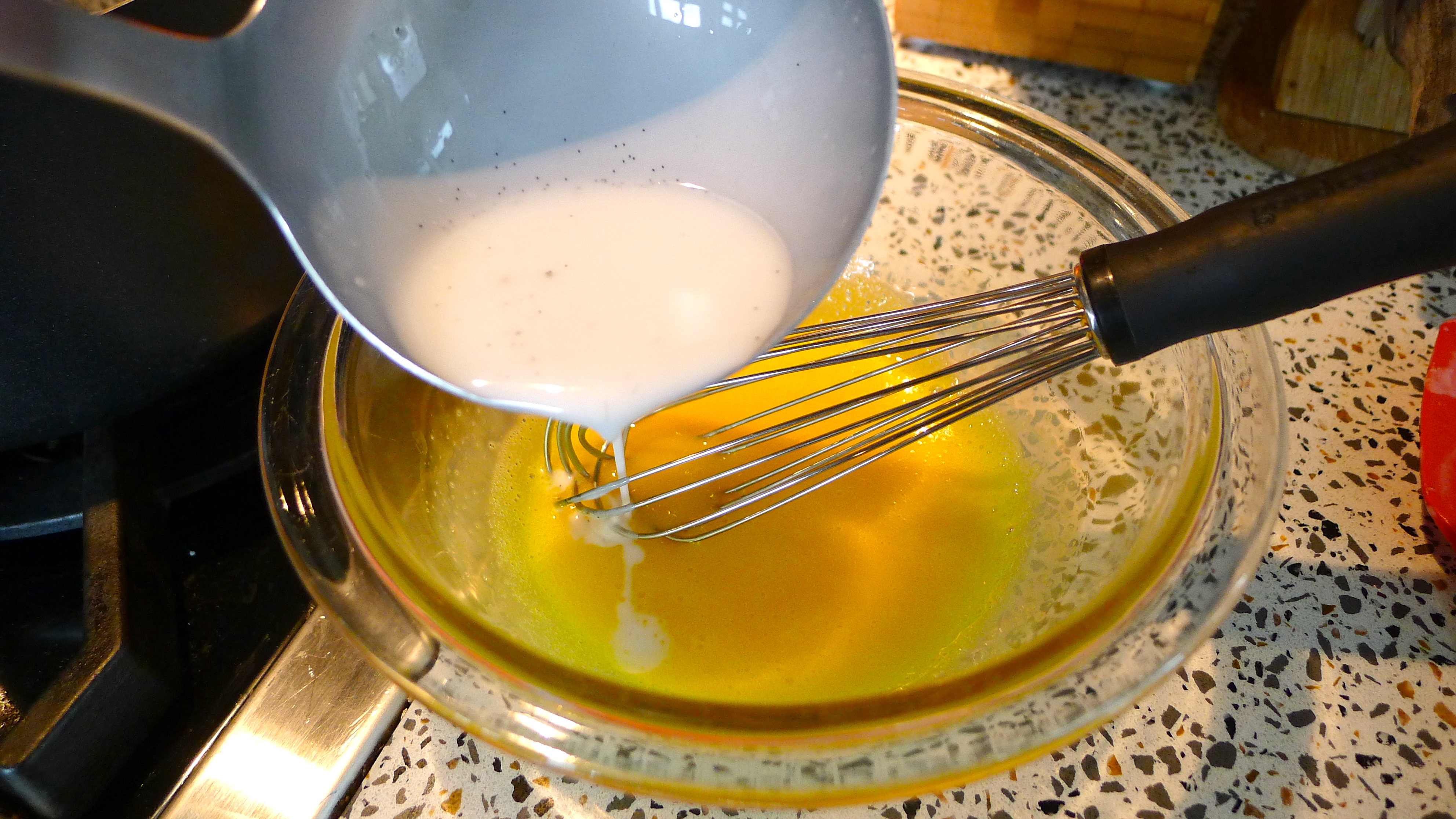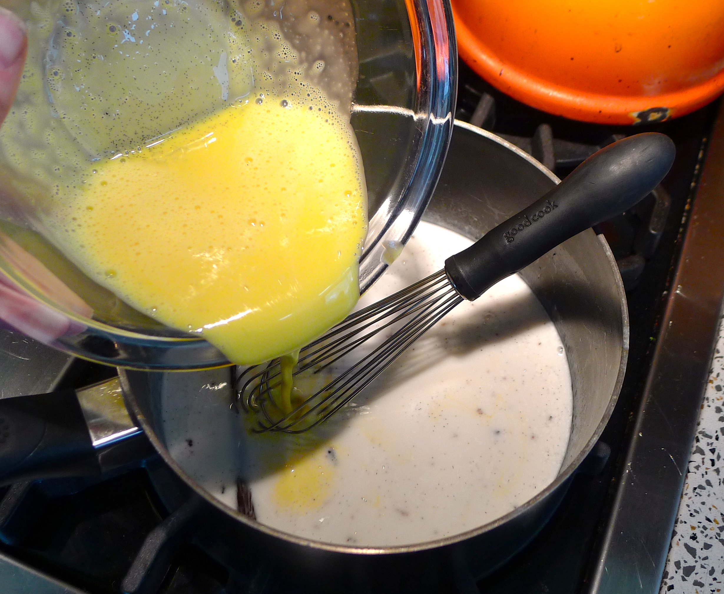 I had no idea you could make ice cream from coconut milk. I’m not lactose-intolerant, but I have friends who are, so the idea of a simple dairy-free ice cream recipe is quite appealing. I started by making a custard of sorts. I sliced open the surprisingly still-plump vanilla bean and scraped the yummy bits into a pan with the coconut milk. While the vanilla-y coconut milk warmed on the stove, I whisked four egg yolks together.