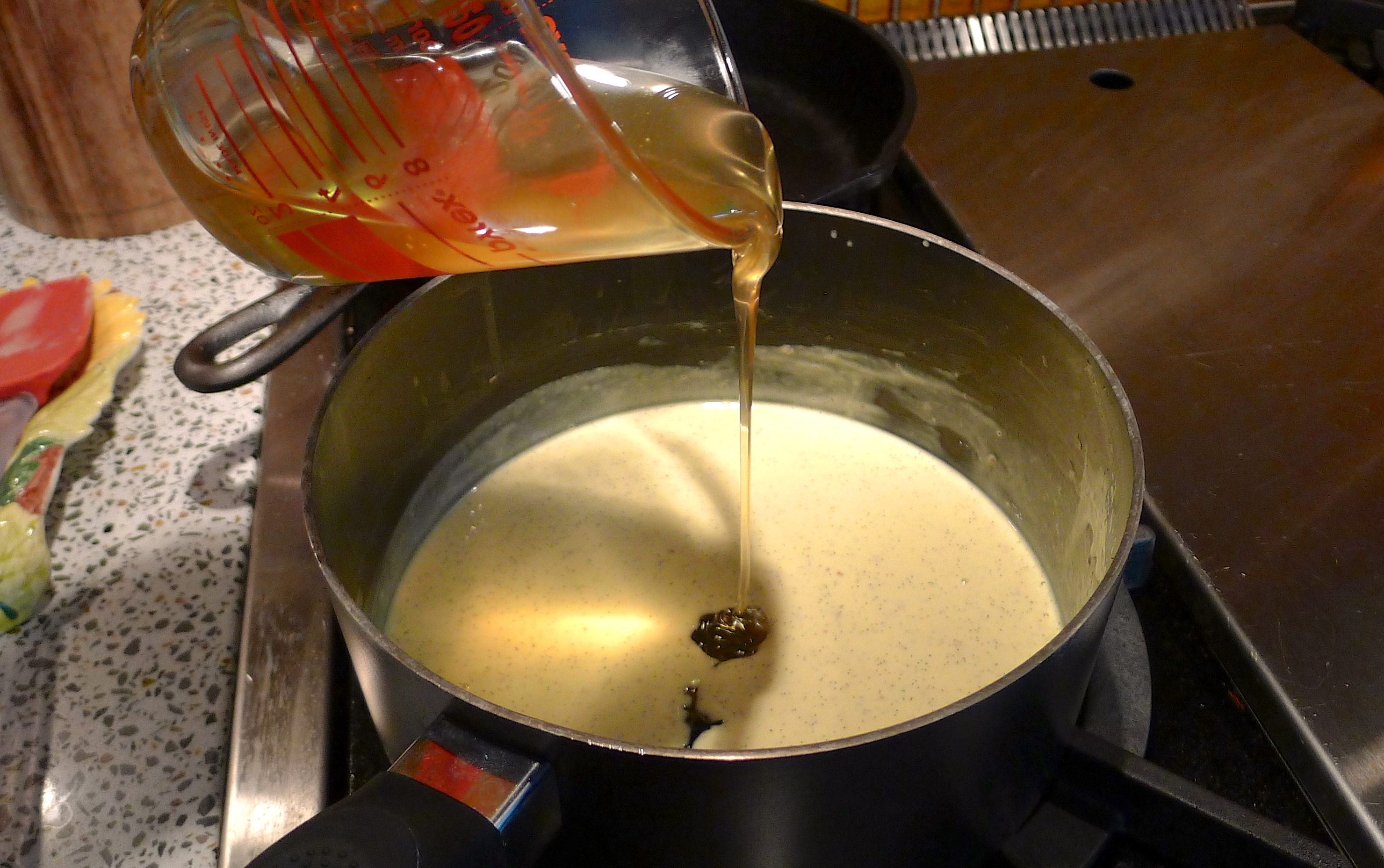 Split the vanilla bean down the middle and scrape the seeds into a small saucepan. Add the bean itself and the entire can of coconut milk. Heat on medium heat to warm the mixture. In the meantime, whisk the four eggs together. Slowly whisk two ladles of the heated coconut milk mixture into the egg yolks, then pour the whole thing into the saucepan. Heat for 15 minutes, whisking constantly, until the mixture begins to thicken (do not let it boil). Remove the pan from the heat, remove the vanilla bean, and stir in the honey. Once slightly cooled, transfer to a container and let it chill in the refrigerator for a few hours or overnight.