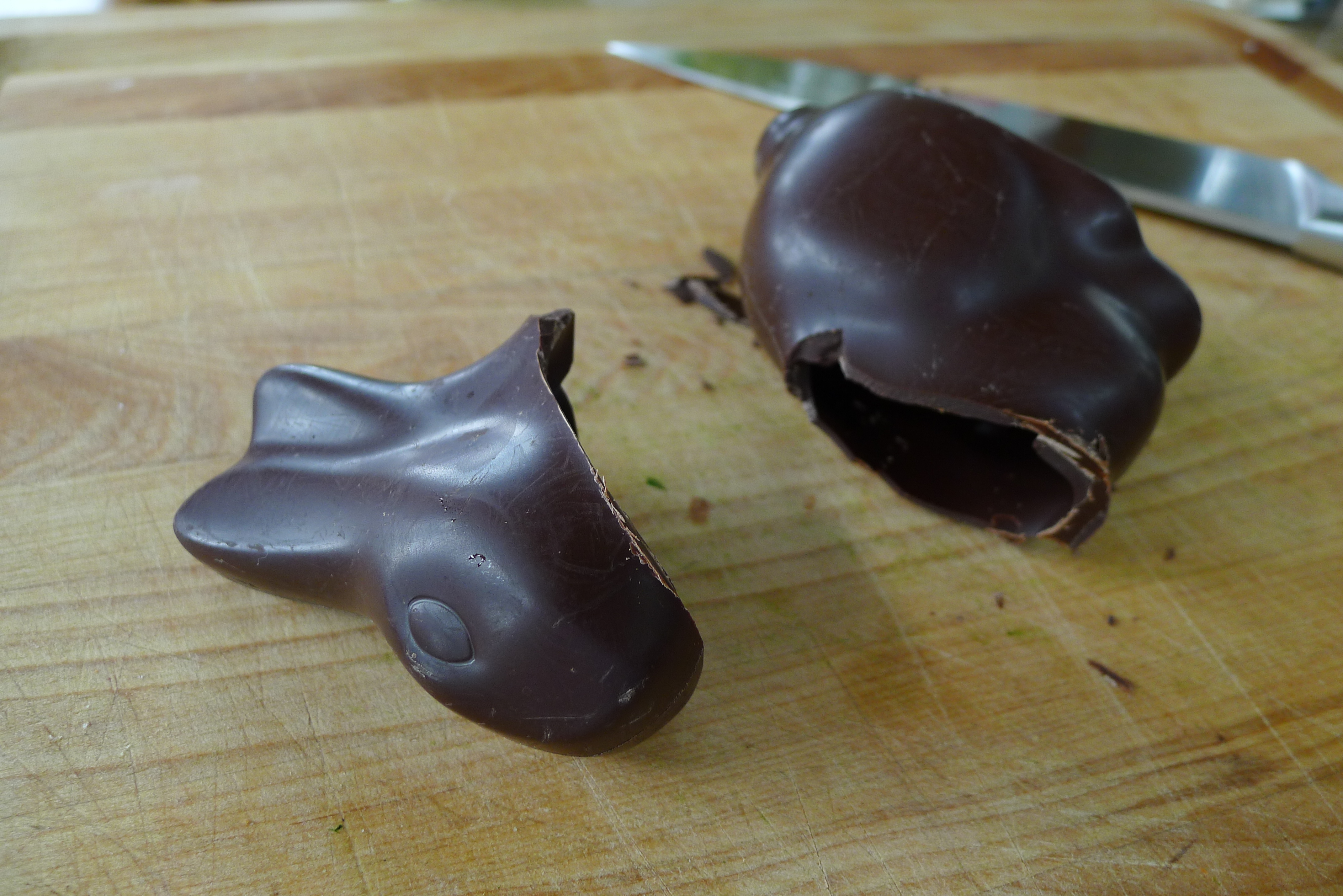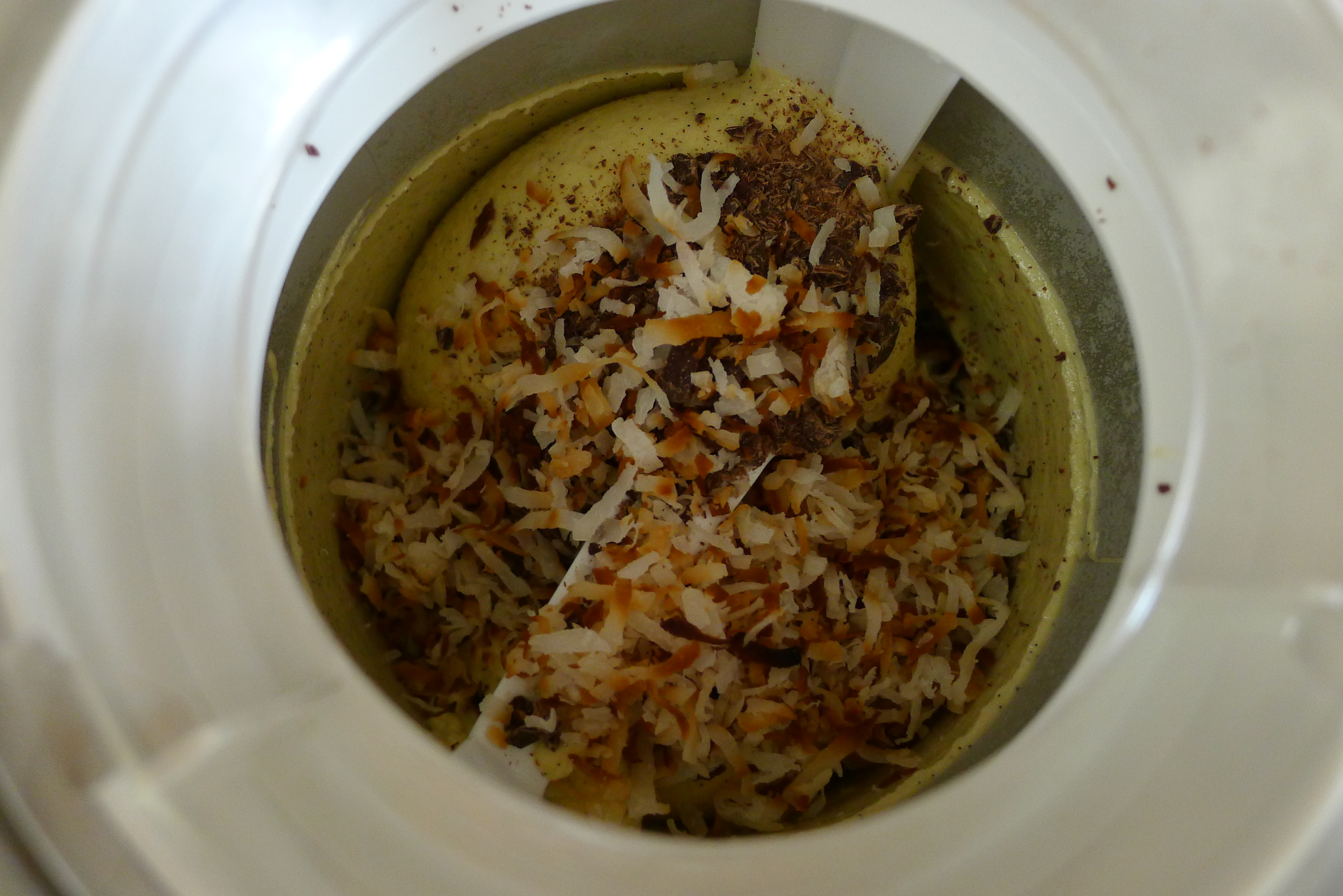The next day morning, still in my robe, I simply poured the chilled coconut mixture into the ice cream maker and let it do its thing for a half an hour. In the meantime, I toasted some shredded coconut. I also beheaded the Easter Bunny (sorry) and chopped the dark chocolate into little bits. When the ice cream started to thicken, I poured the coconut and chocolate into the machine and let it stir it together for me.