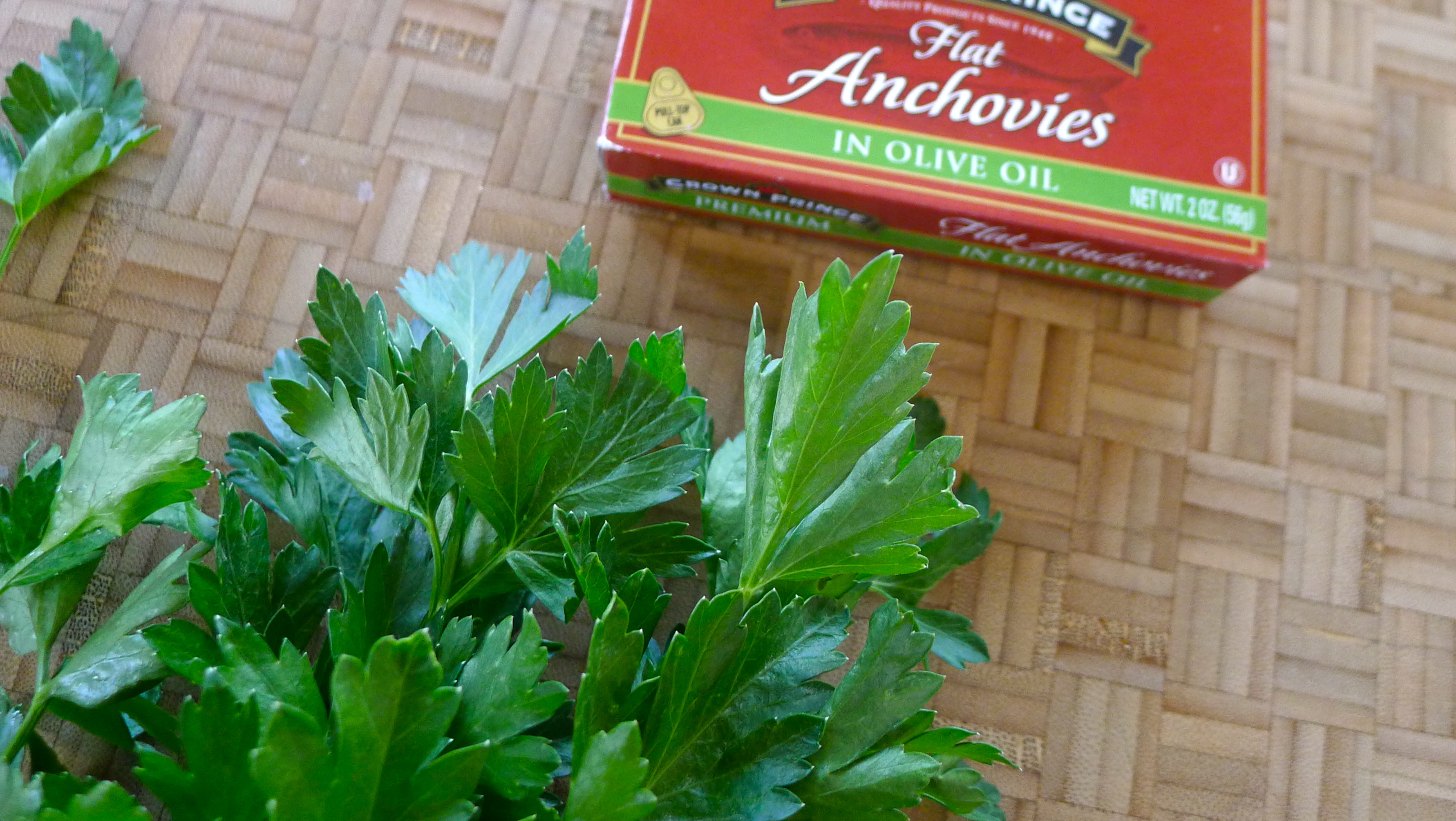 I happened to have tarragon vinegar on hand, which the recipe called for, and remembered some parsley I had in the produce drawer. I also used an ingredient that I’d never cooked with but John loves: anchovies. I popped three of them right into the dressing and blended everything together well. I honestly had no idea what the dressing is supposed to taste like… but whatever I’d just made was fresh, creamy, and delicious!