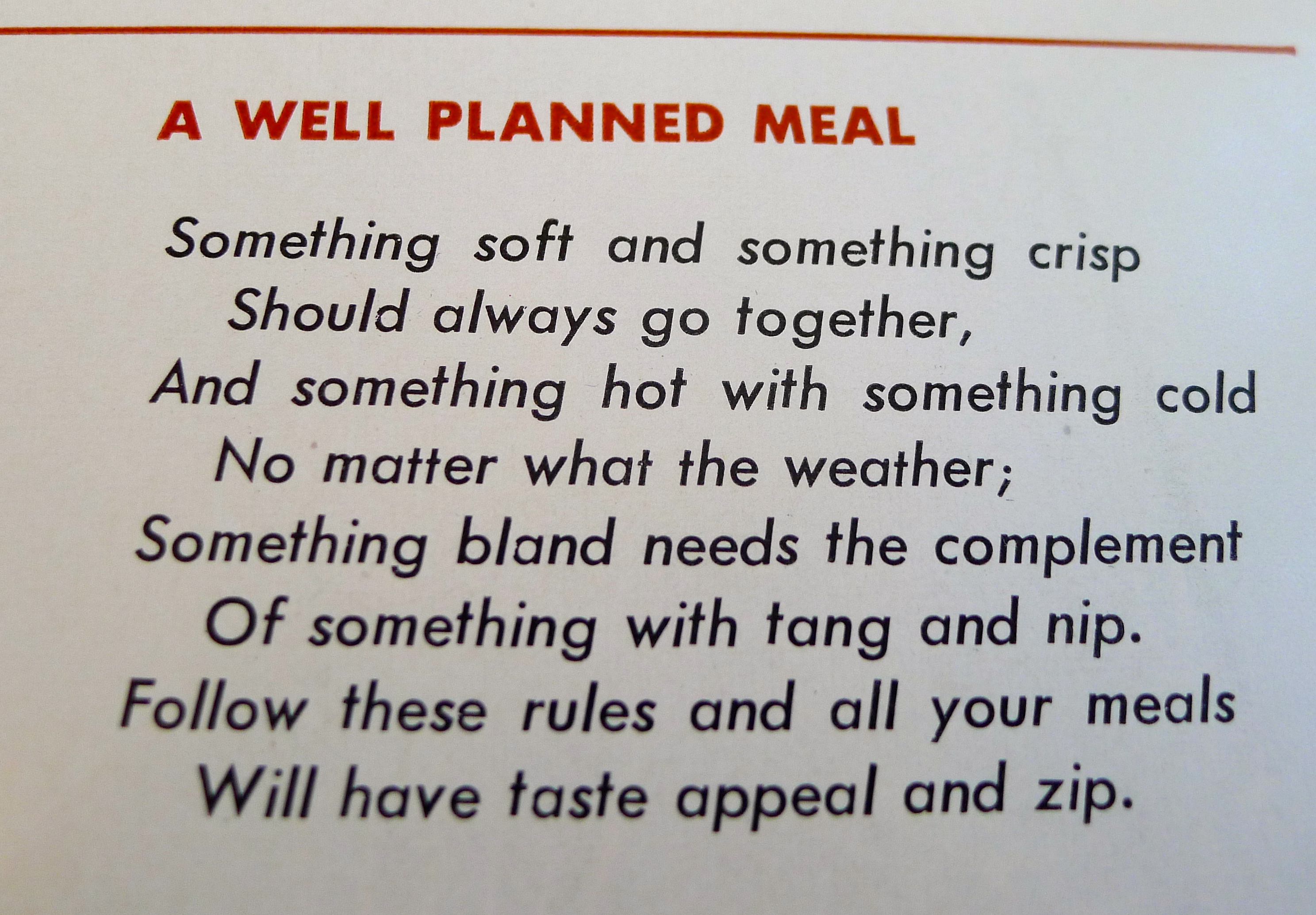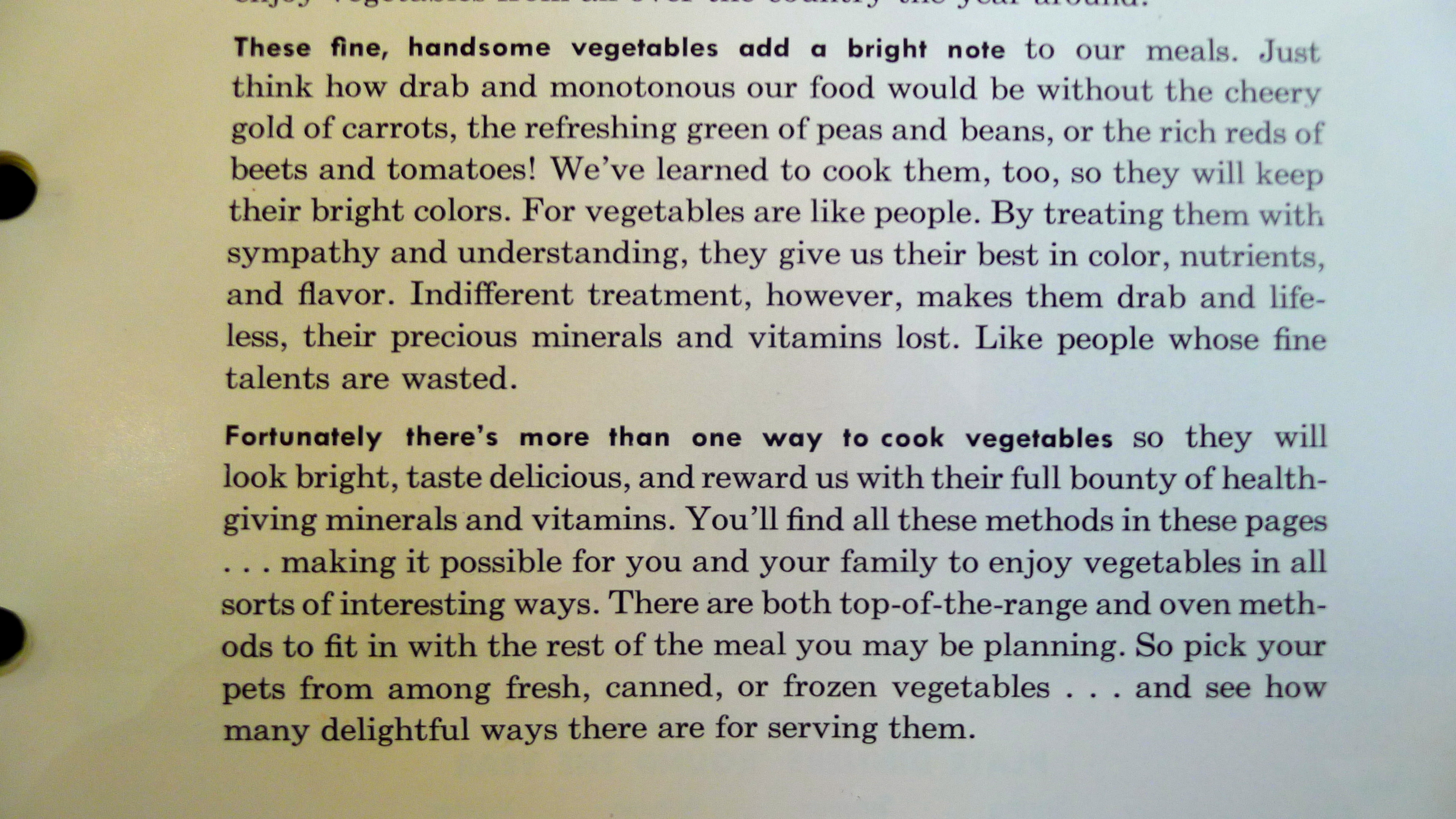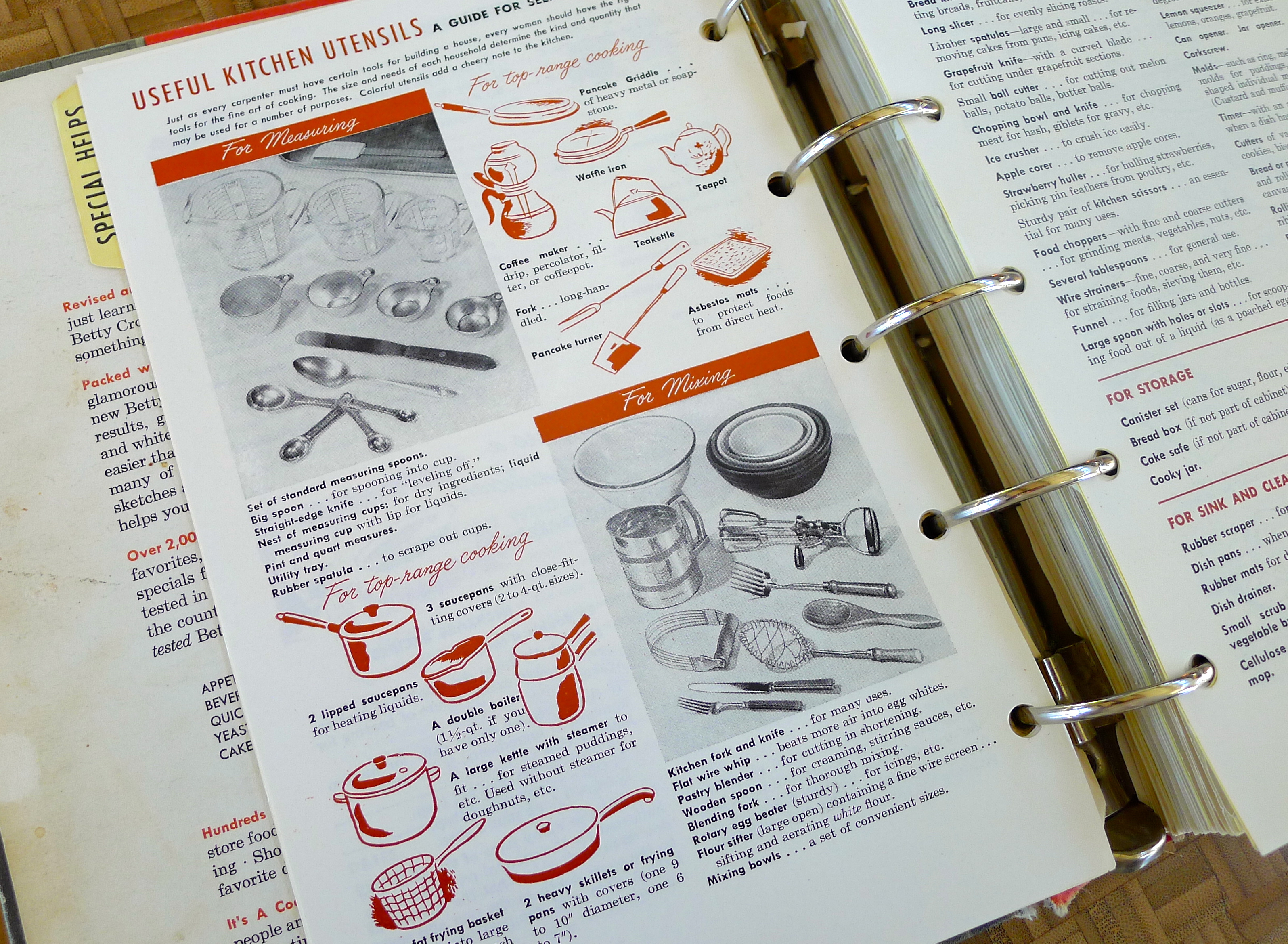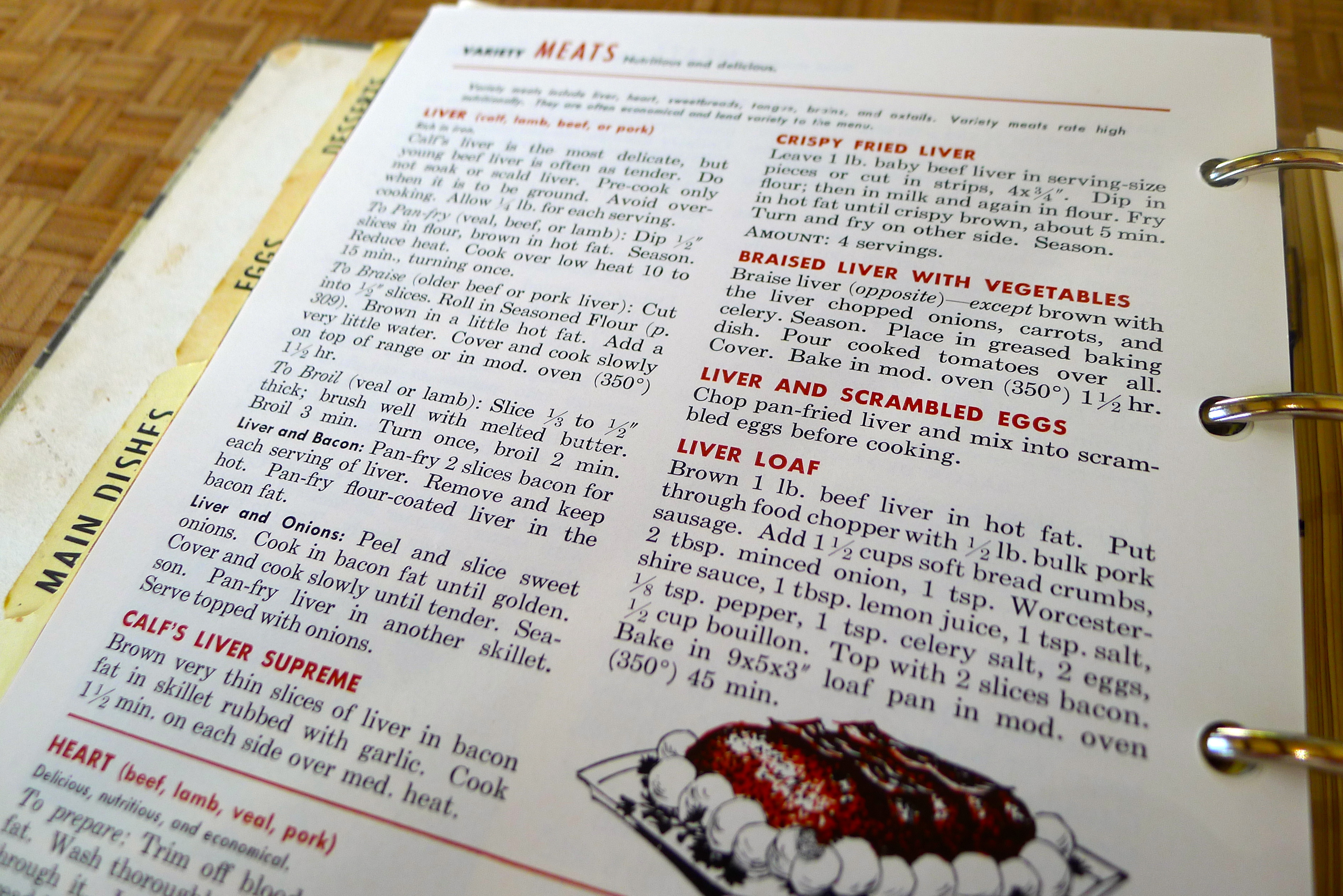 I was interested to note that the editors clearly believed in the value of fresh vegetables and the importance of healthy eating. I giggled at the little rhymes throughout the book. There were signs of food trends gone by, like multiple recipes for liver and proteins most Americans wouldn’t consider (brains or tongue, anyone?). I spotted most of the same utensils in my own kitchen as in the book, reminding me that some things don’t change from generation to generation (or come back into favor because they were smart from the beginning).