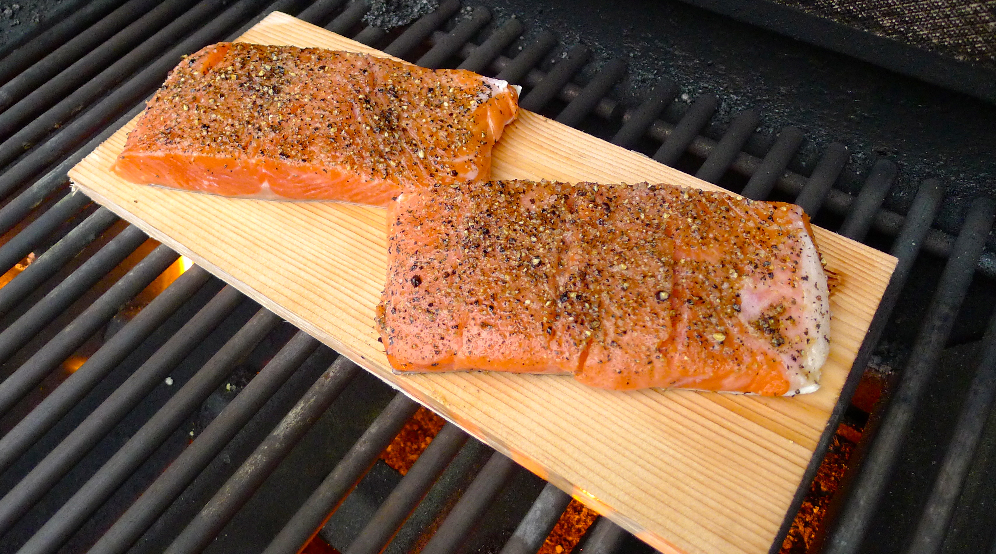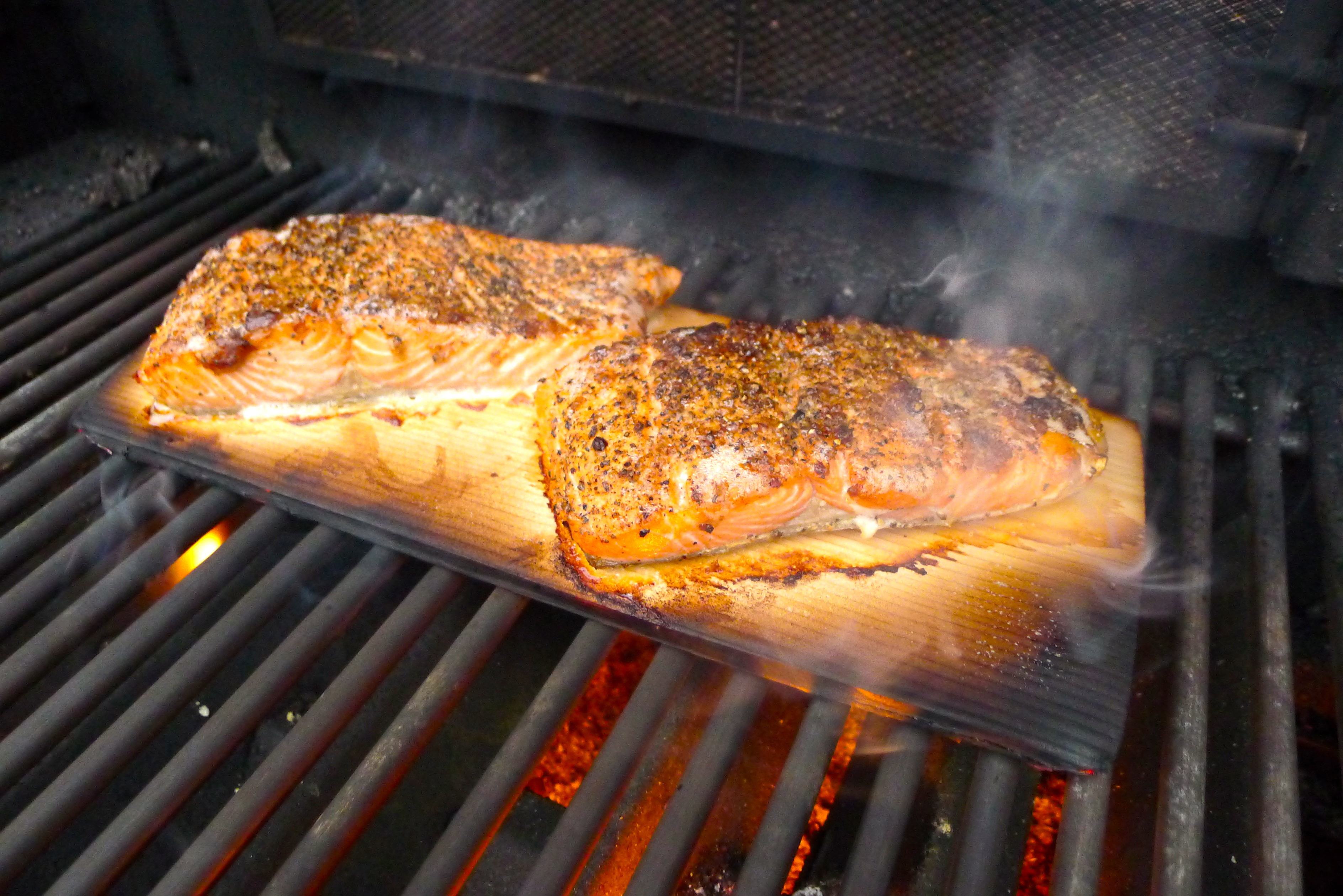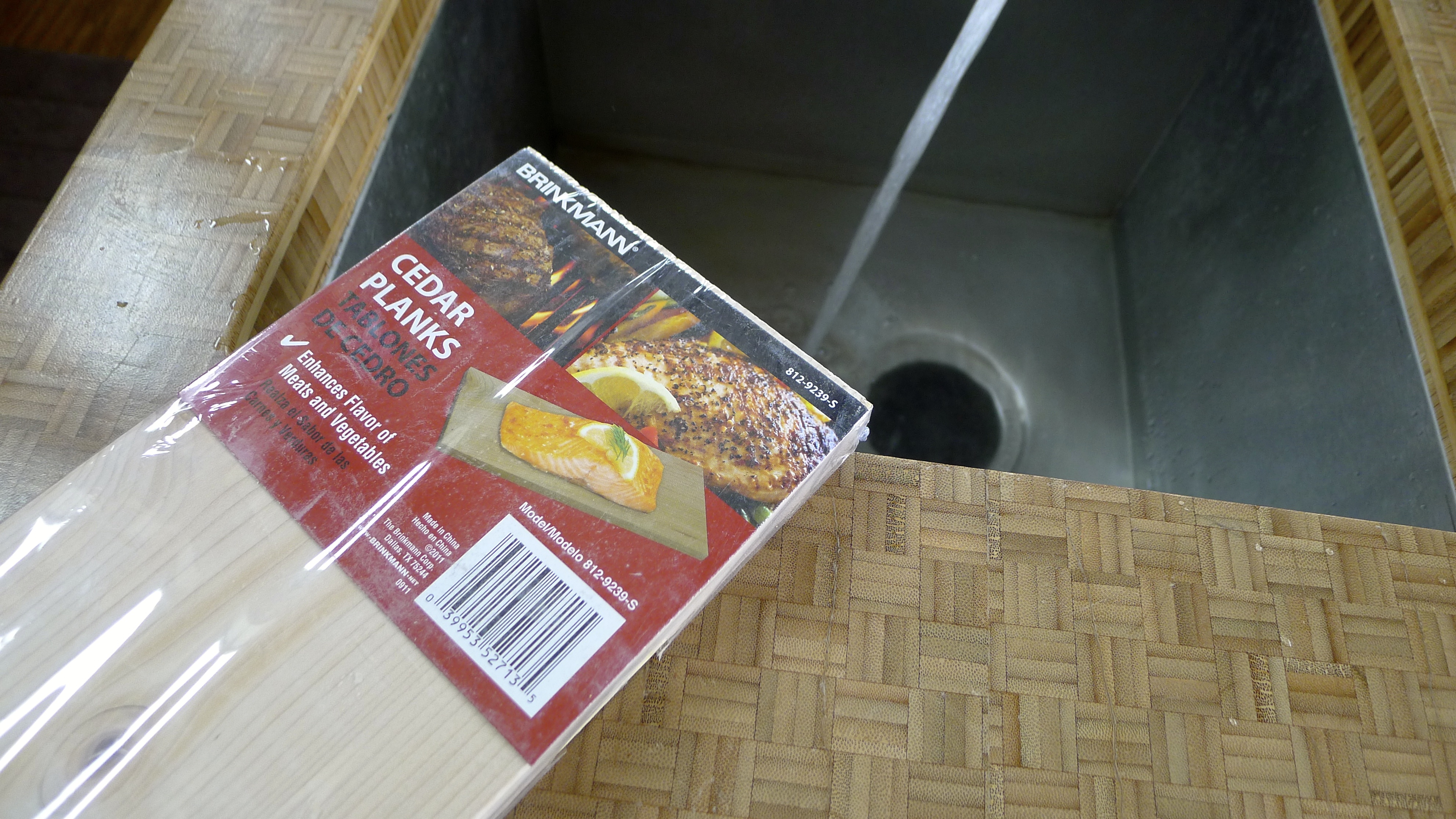 On a recent trip to Home Depot for non-toxic weed killer (newsflash: weeds LOVE rain), I picked up a package of cedar planks in the grill section. The package of two planks sat on the dining room table near the door that leads to the BBQ’s patio for days until finally, we decided that the rain was never, ever going to stop. There are evenings when, despite the downpour and chill in the air, you simply must fire up the grill. John could wear a raincoat.