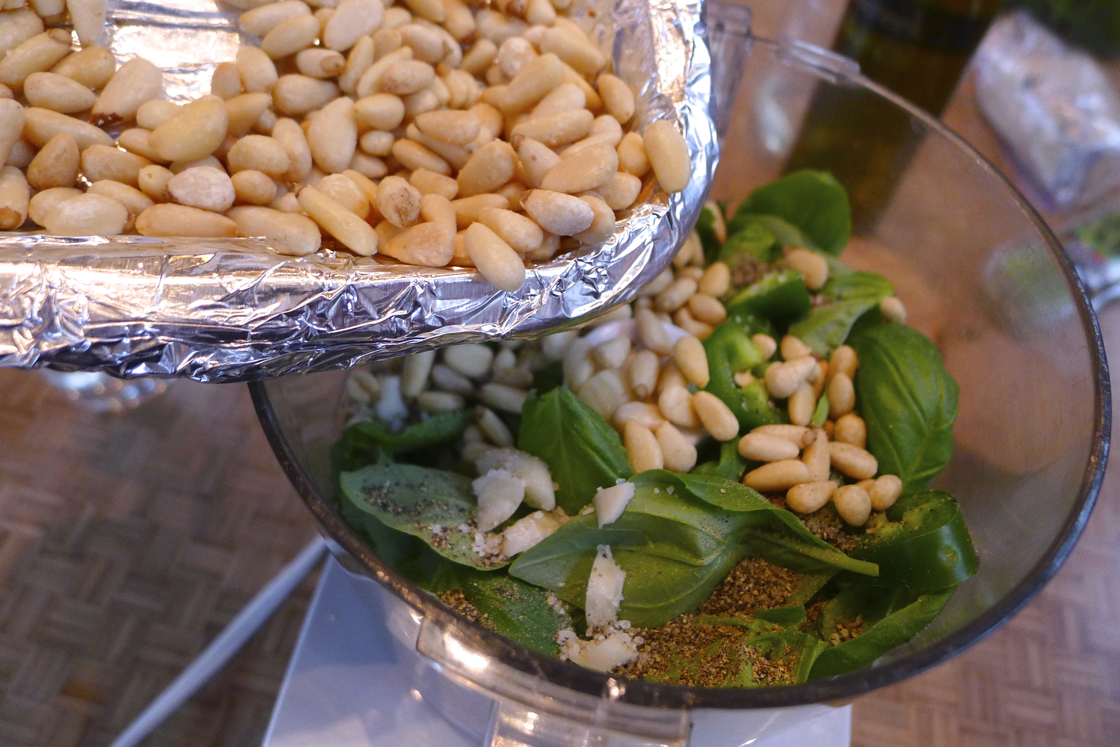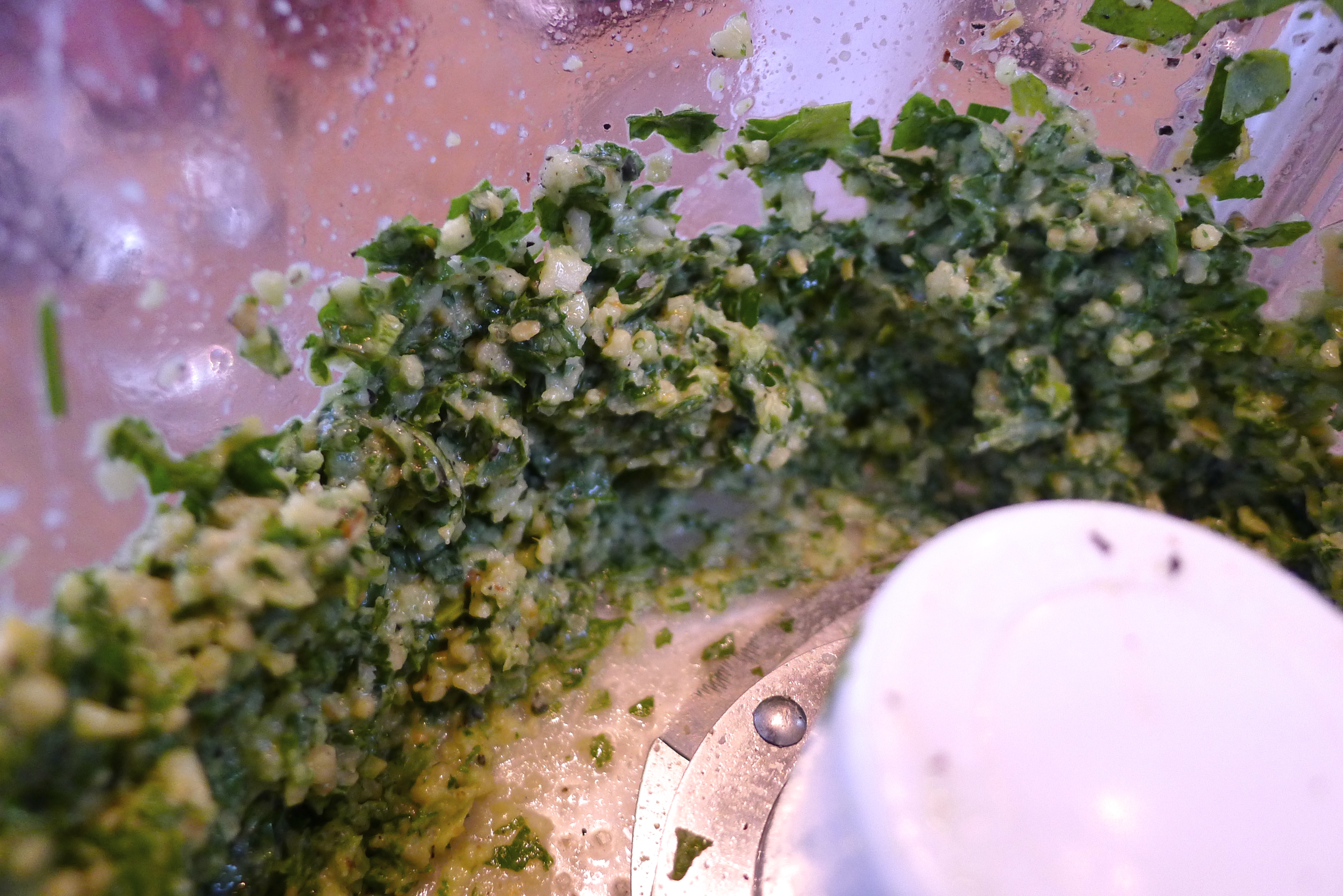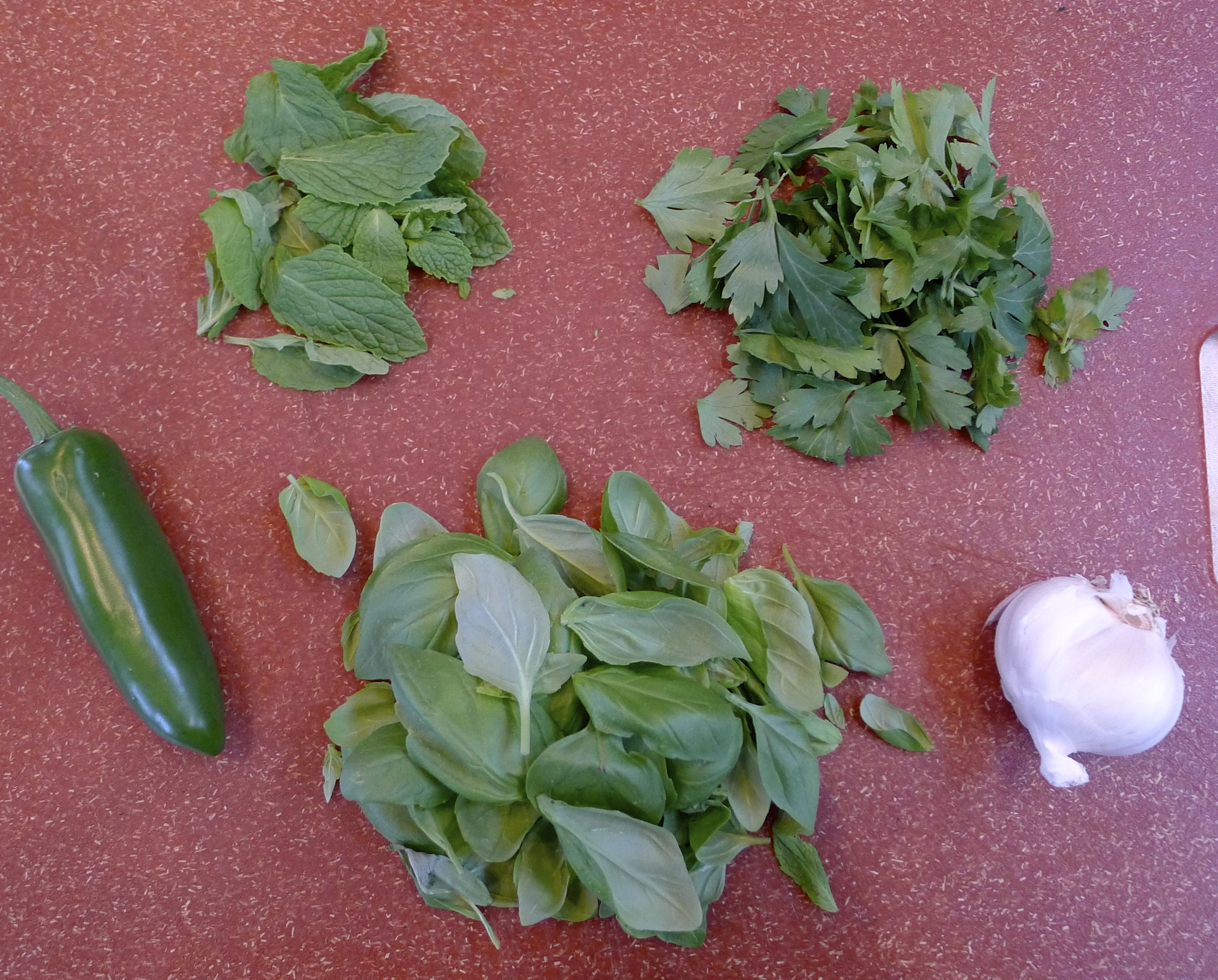 The plank needed to soak for a few hours before grill time. While it took a bath in the sink, I put together a sort of pesto hybrid. A traditional pesto combination is basil, garlic, Parmesan cheese, and toasted pine nuts. I also grabbed mint and parsley, a lemon, and a jalapeño. We like it hot!