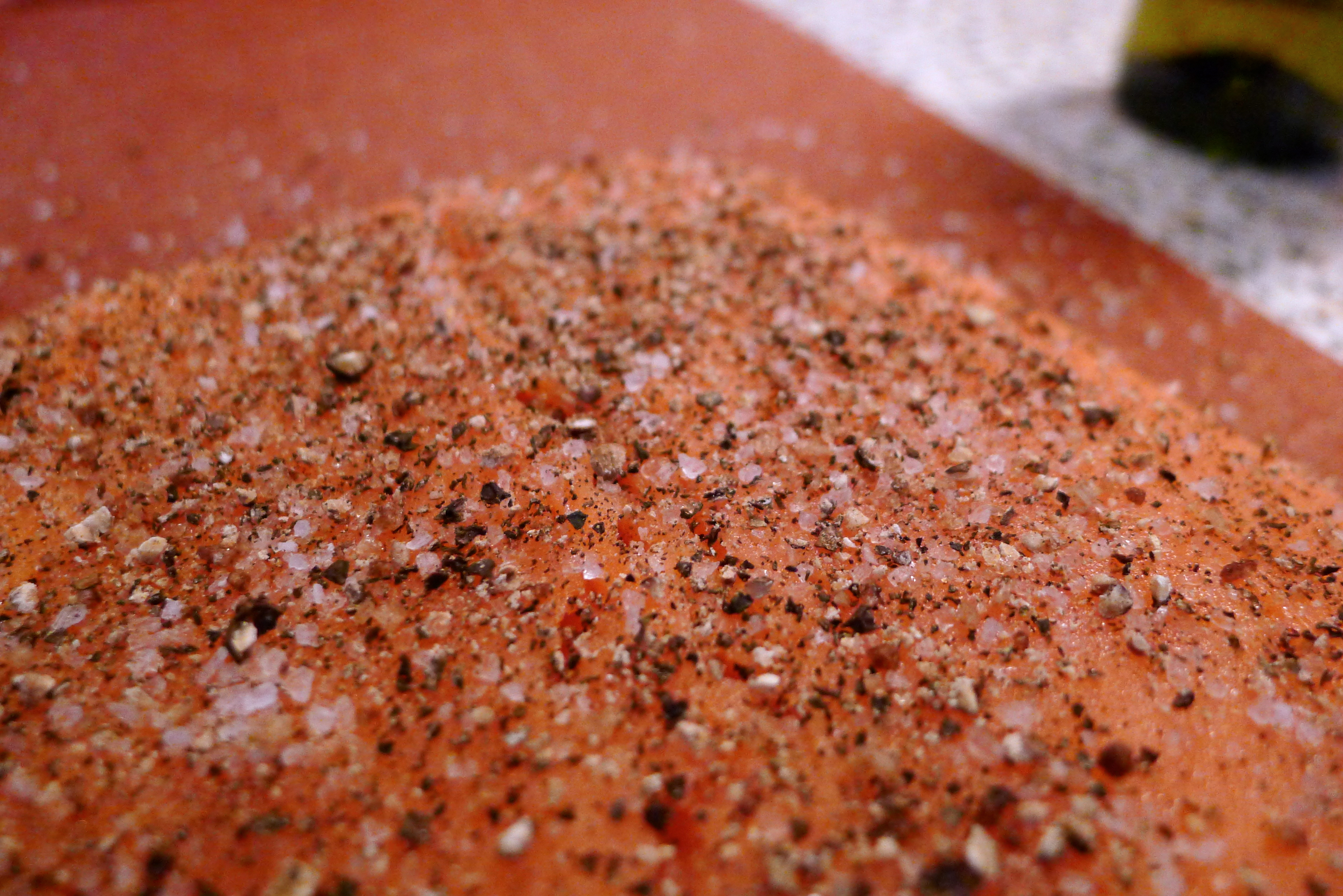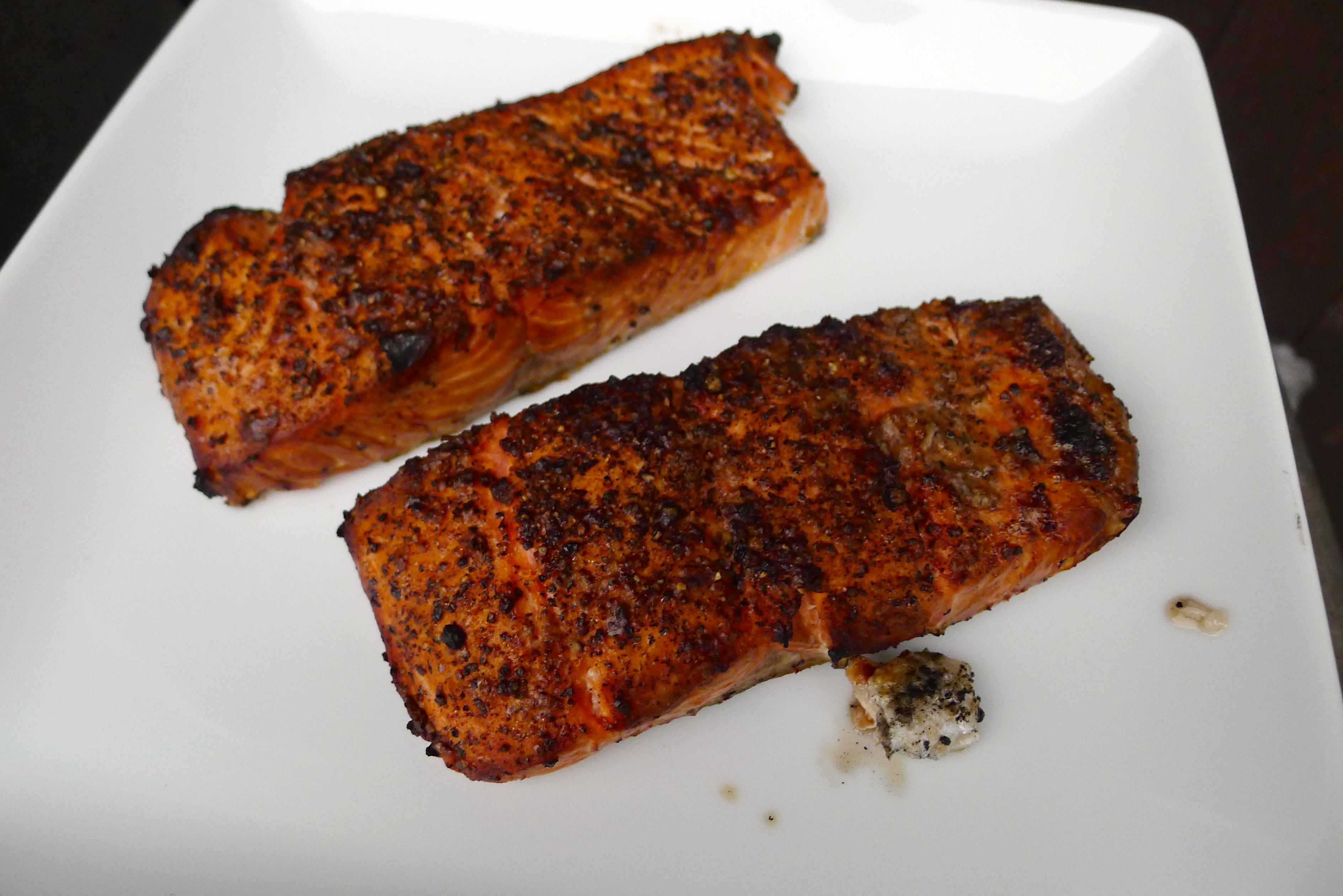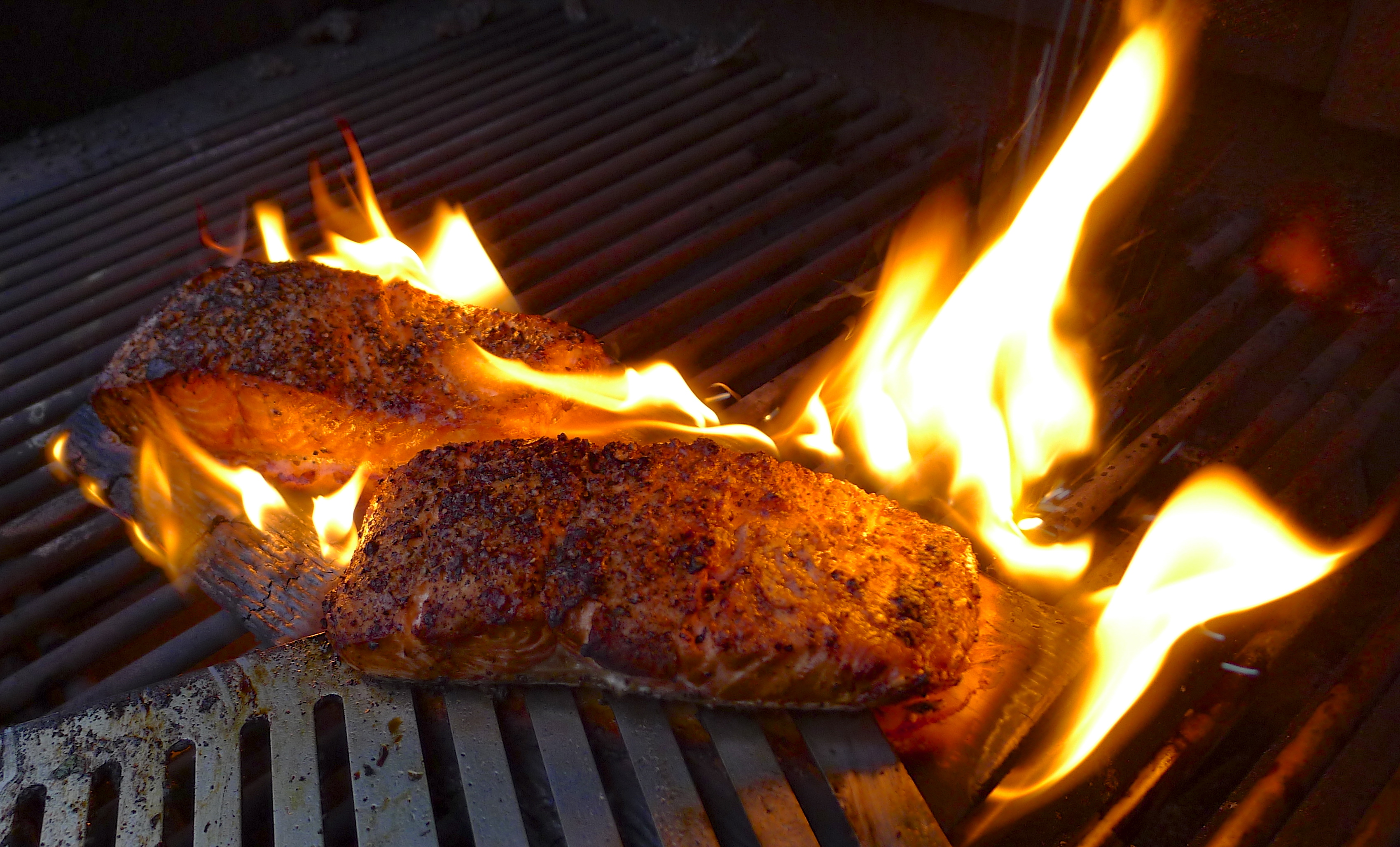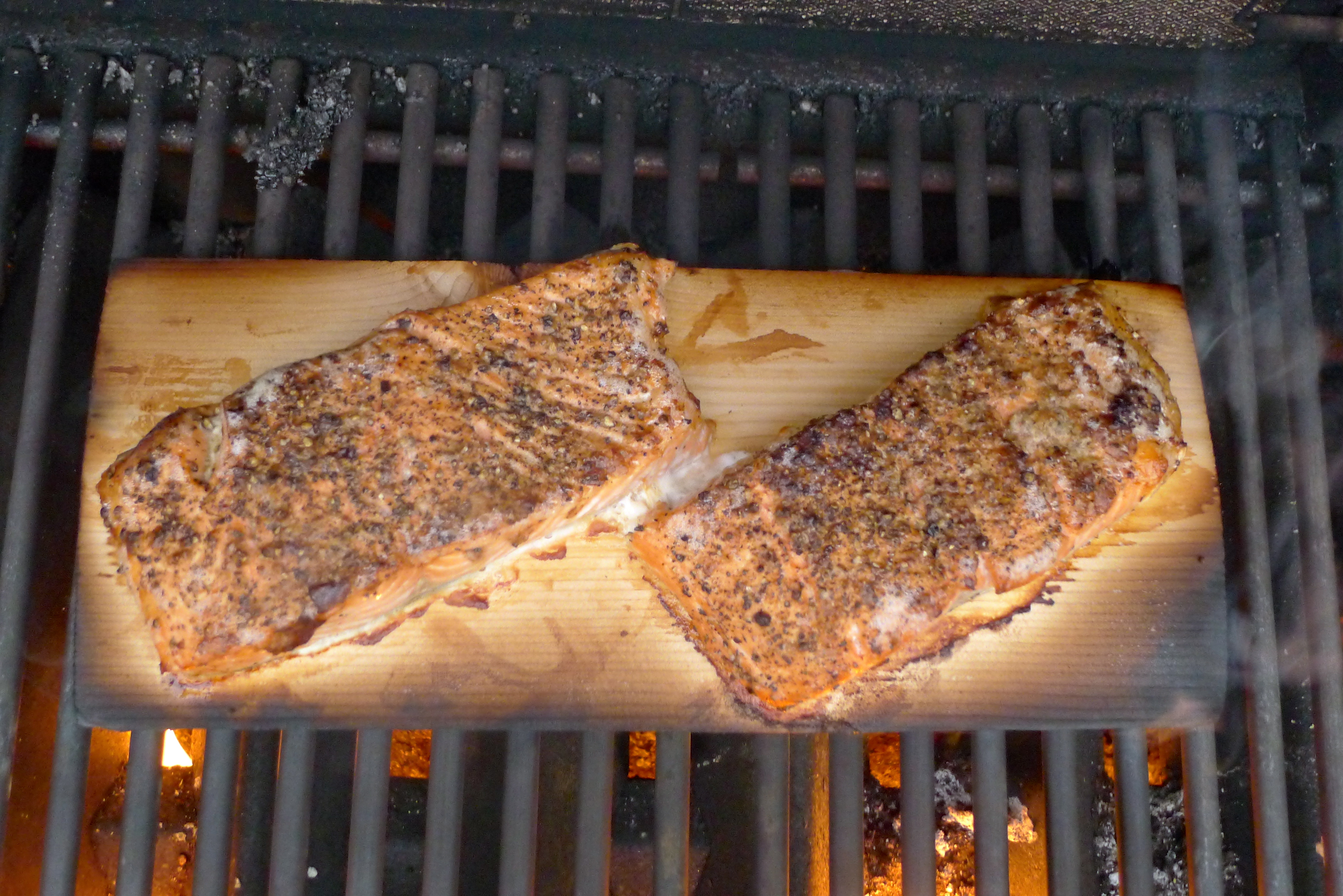 It was our first experience grilling on a cedar plank. We oiled it and placed the well-seasoned salmon filets on it, skin side down. Things were looking fabulous…until the plank caught on fire. Perhaps we didn’t soak it long enough. Perhaps the grill was too hot. But the salmon was ready, and a little char never hurt anyone. The rain conveniently put out our fire.