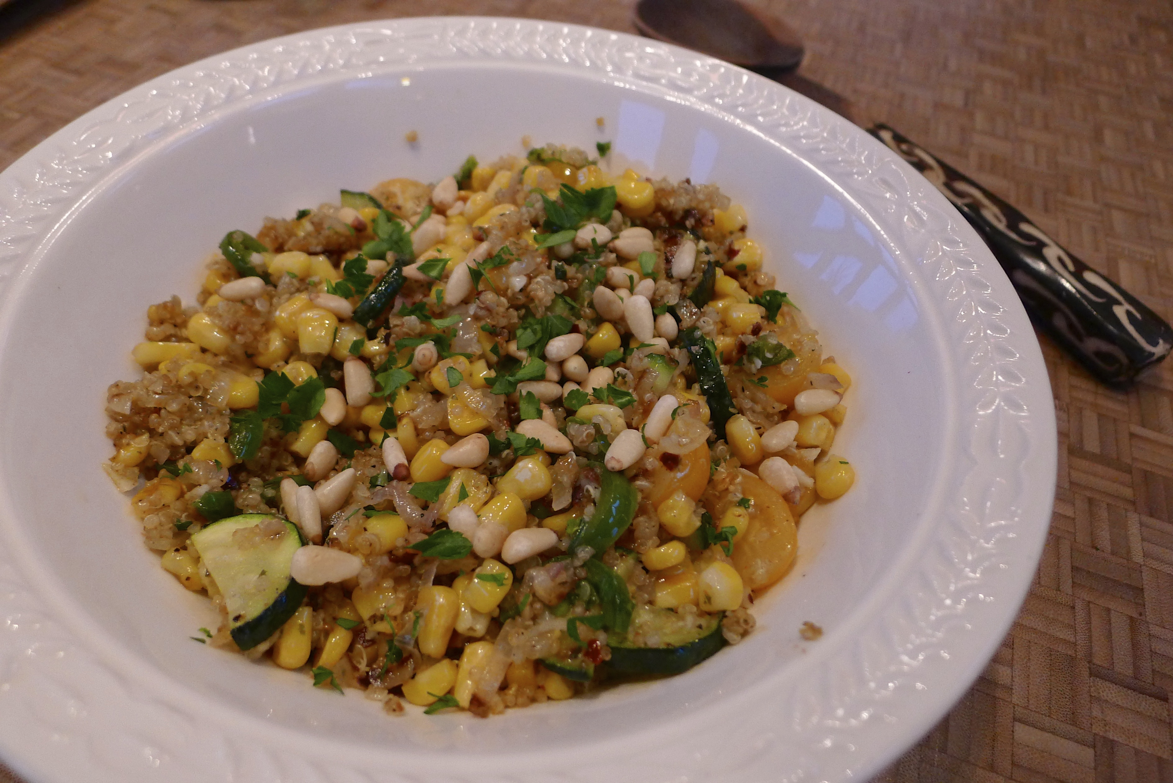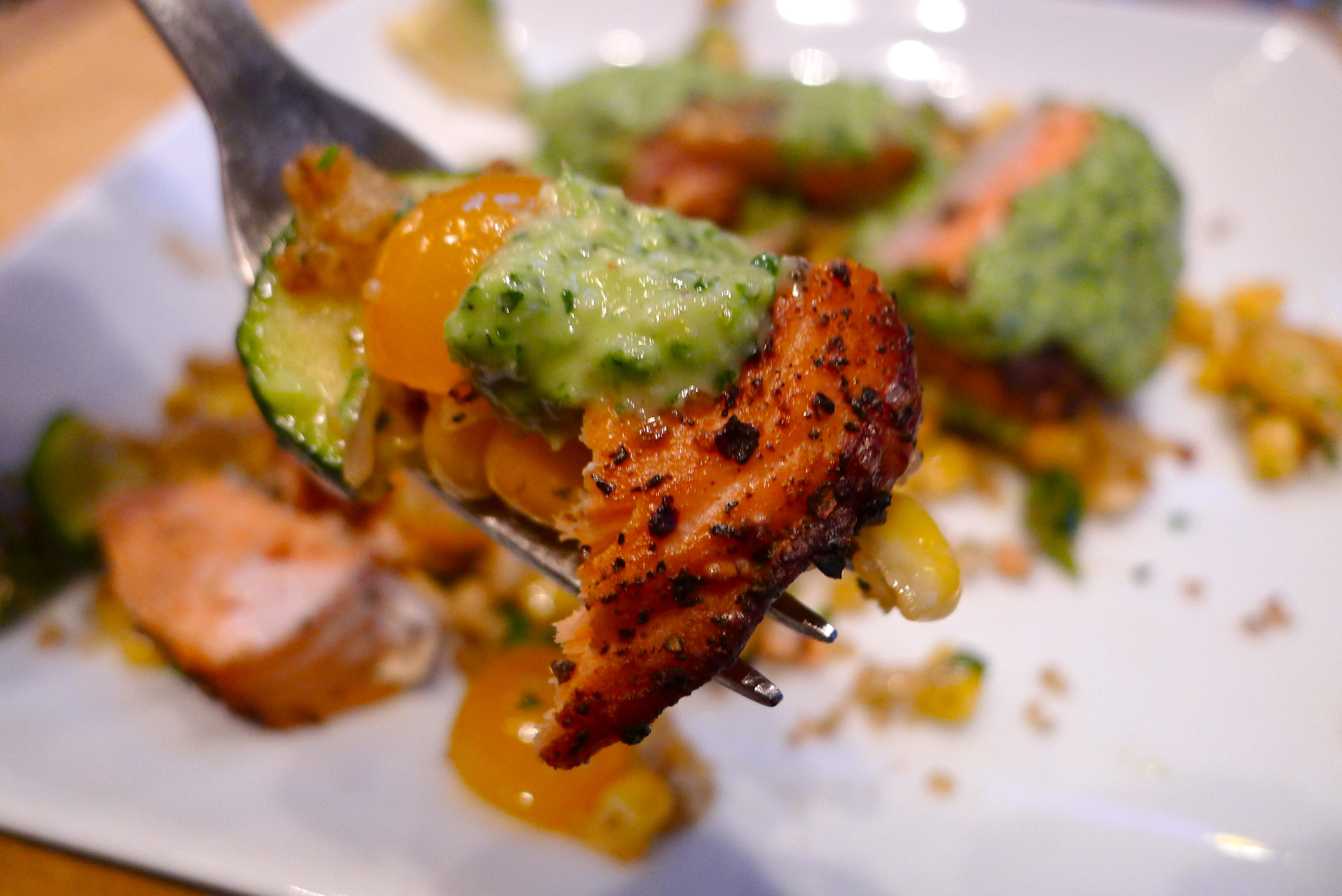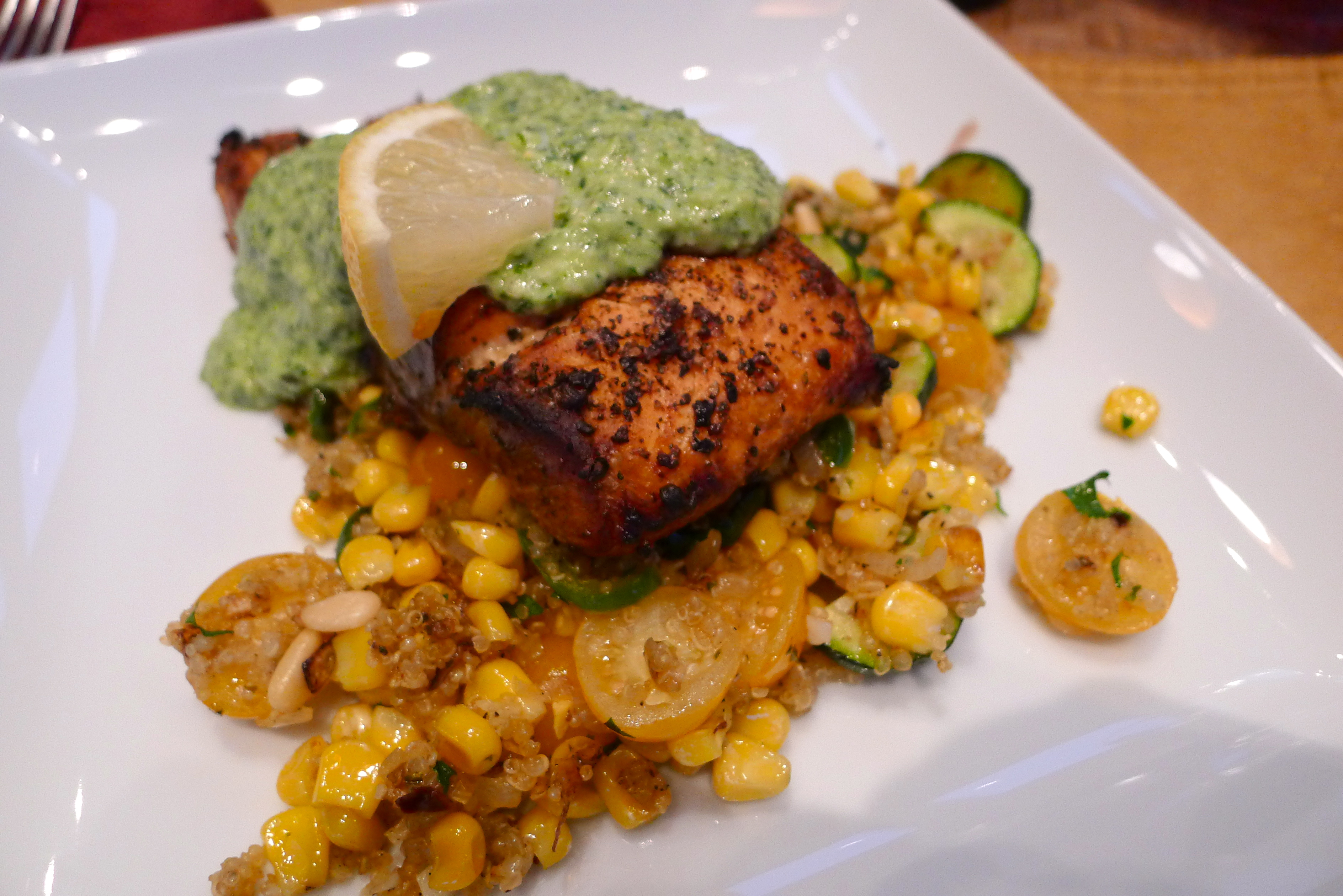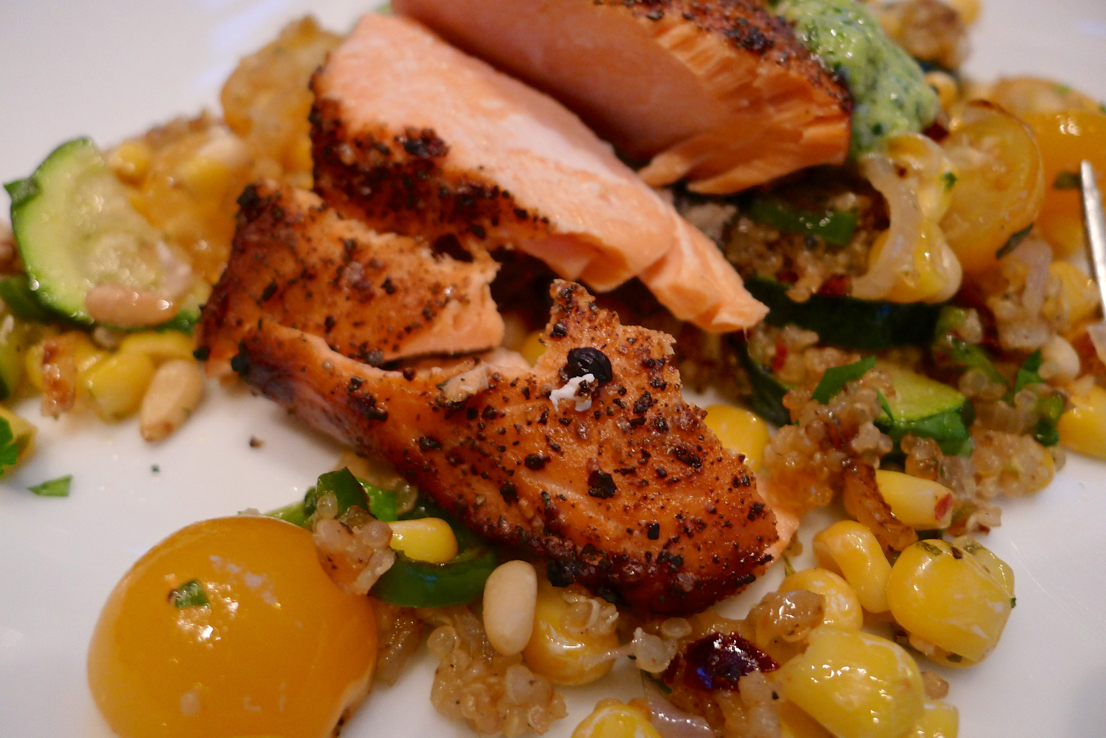 I served the salmon over a pile of quinoa-veggie hash with a big dollop of the spicy herb pesto on top. We squeezed a bit more lemon juice over the whole plate before diving in. The salmon was scrumptious- flaky, still moist, charred the perfect amount with just a hint of cedar.