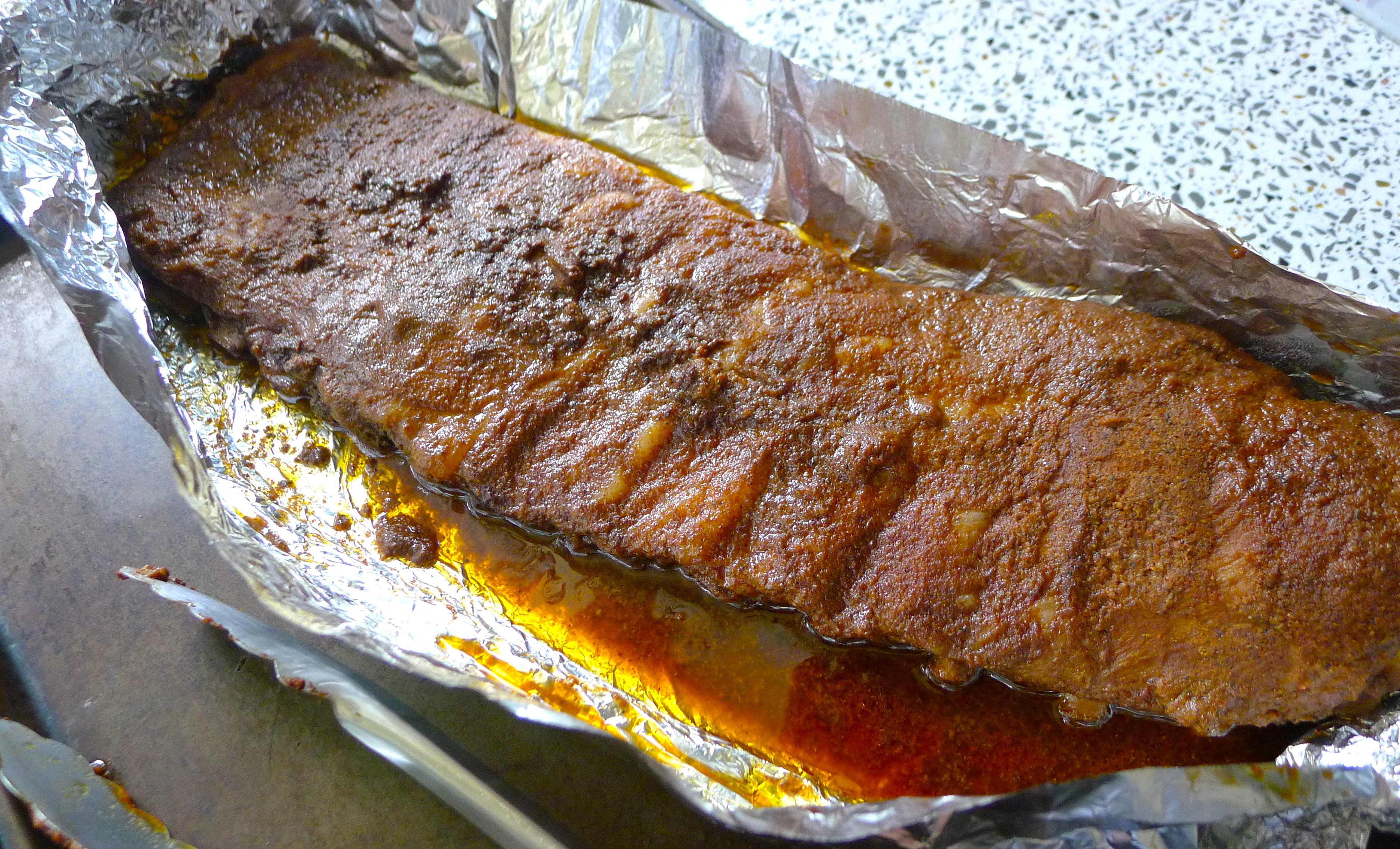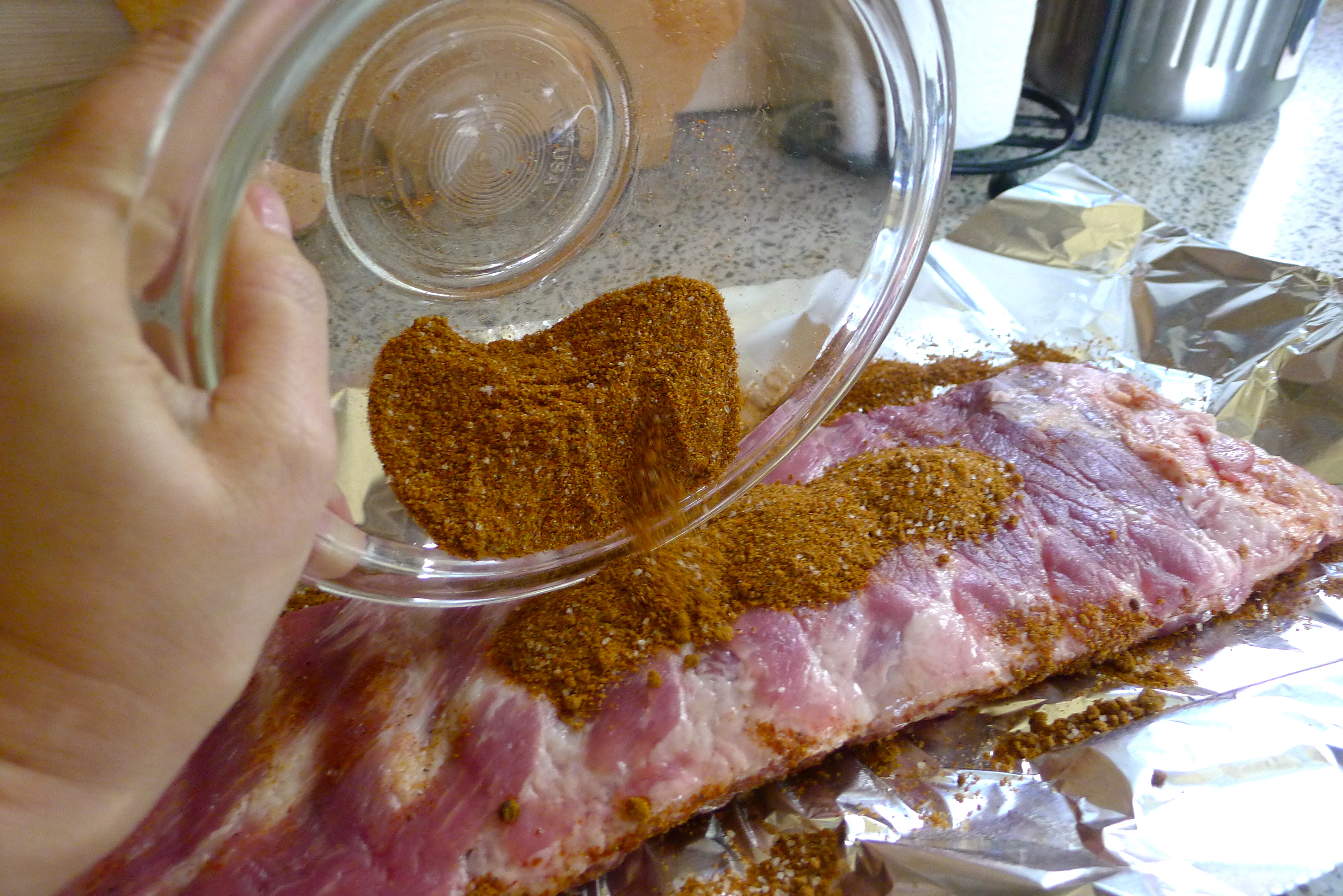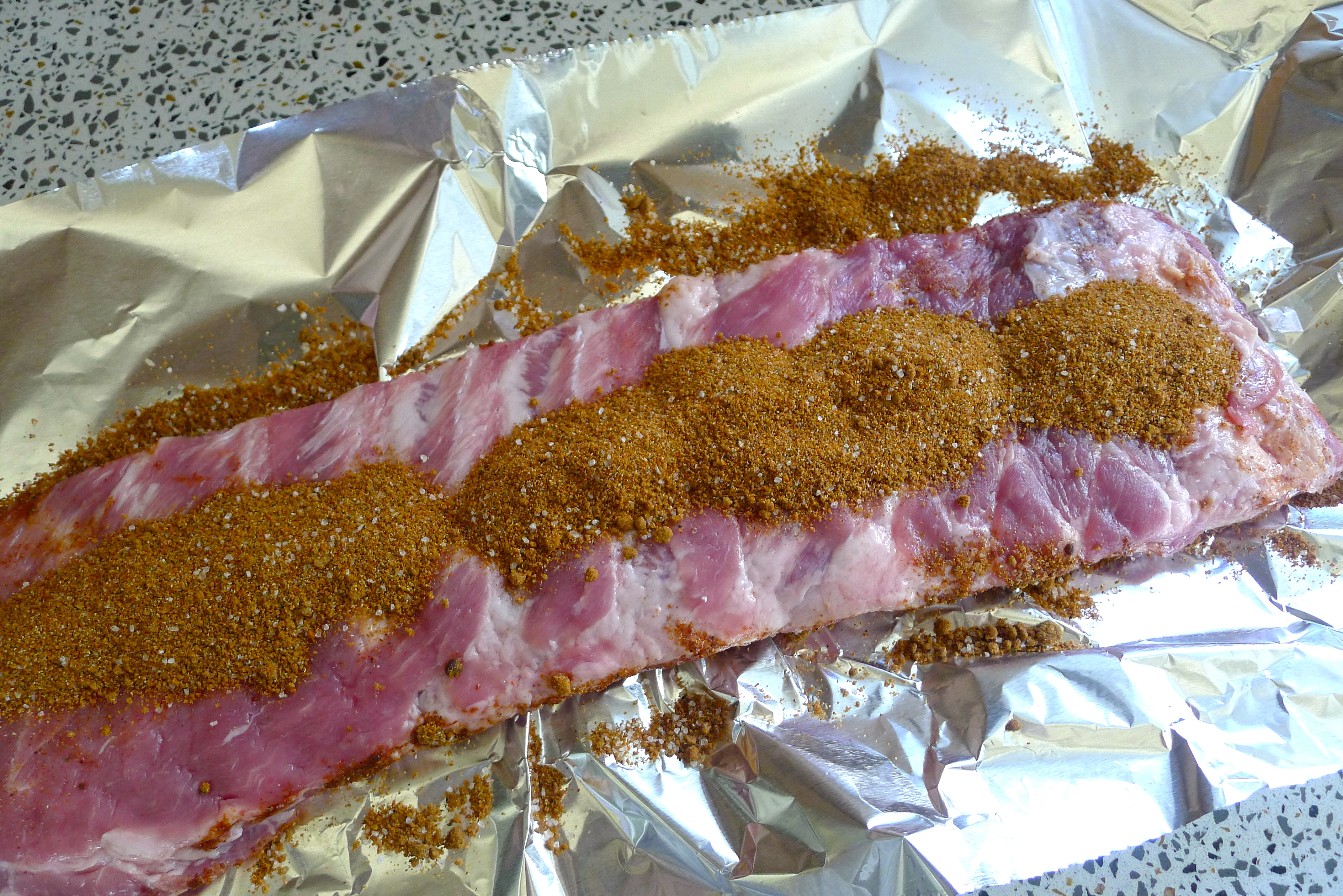 After rinsing and patting my spare ribs dry with a paper towel, I laid out some aluminum foil and placed the rack on it. I poured half of the rub onto the ribs and, well, rubbed it into the meat. I did the same on the other side with the rest of the rub, making sure to cover every last section. Then I wrapped the foil tightly and let my spicy-sweet rub do its thing overnight in the fridge.