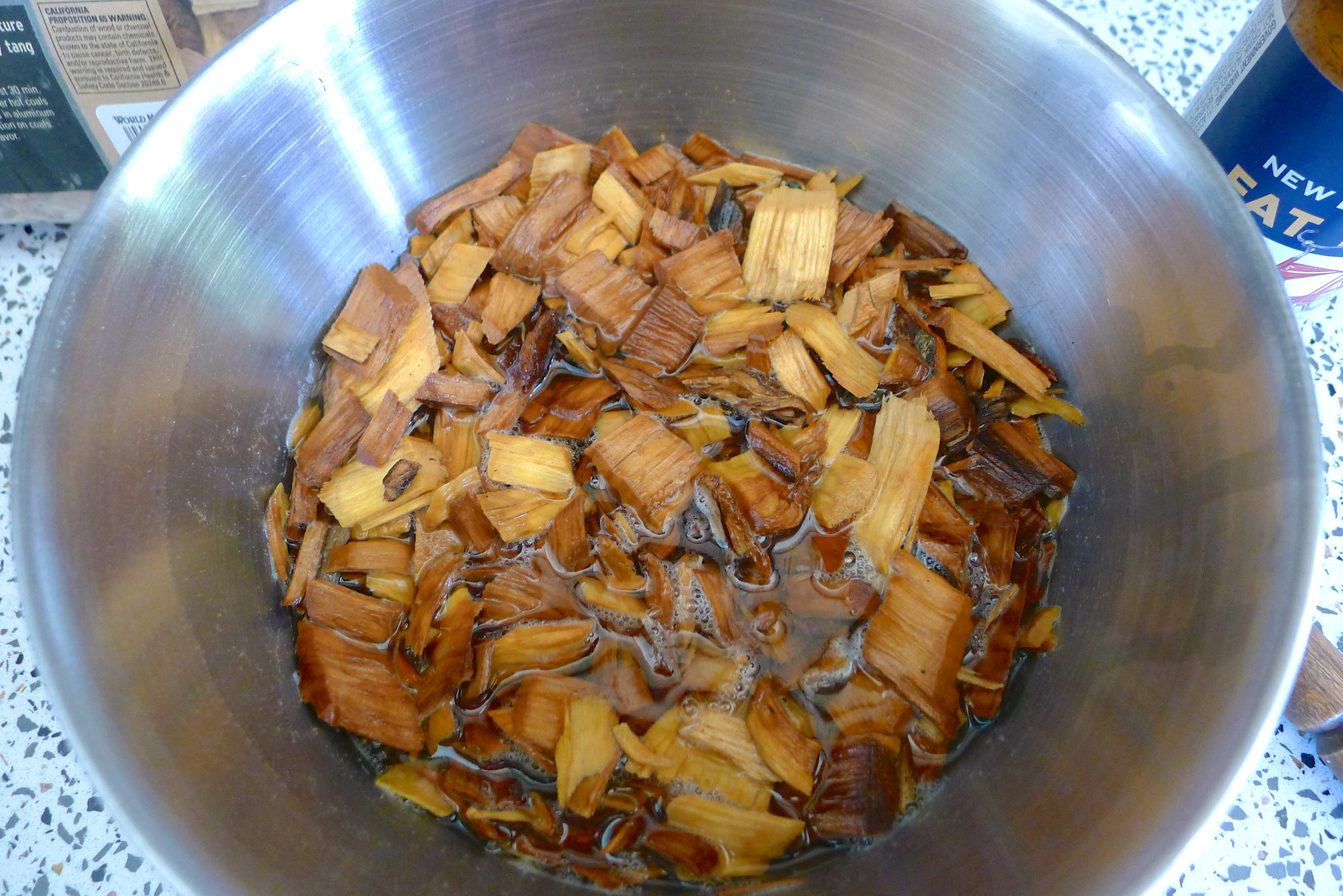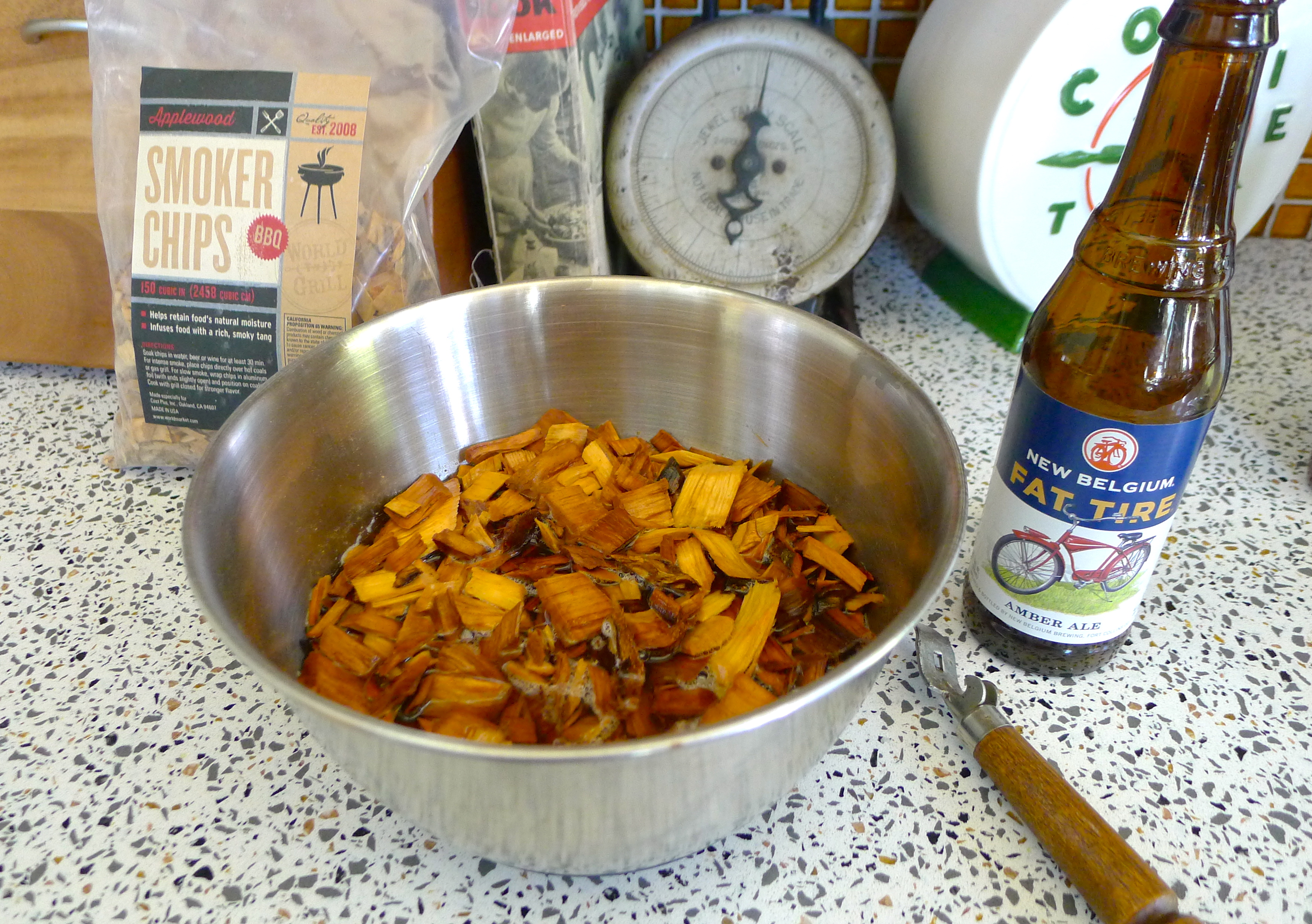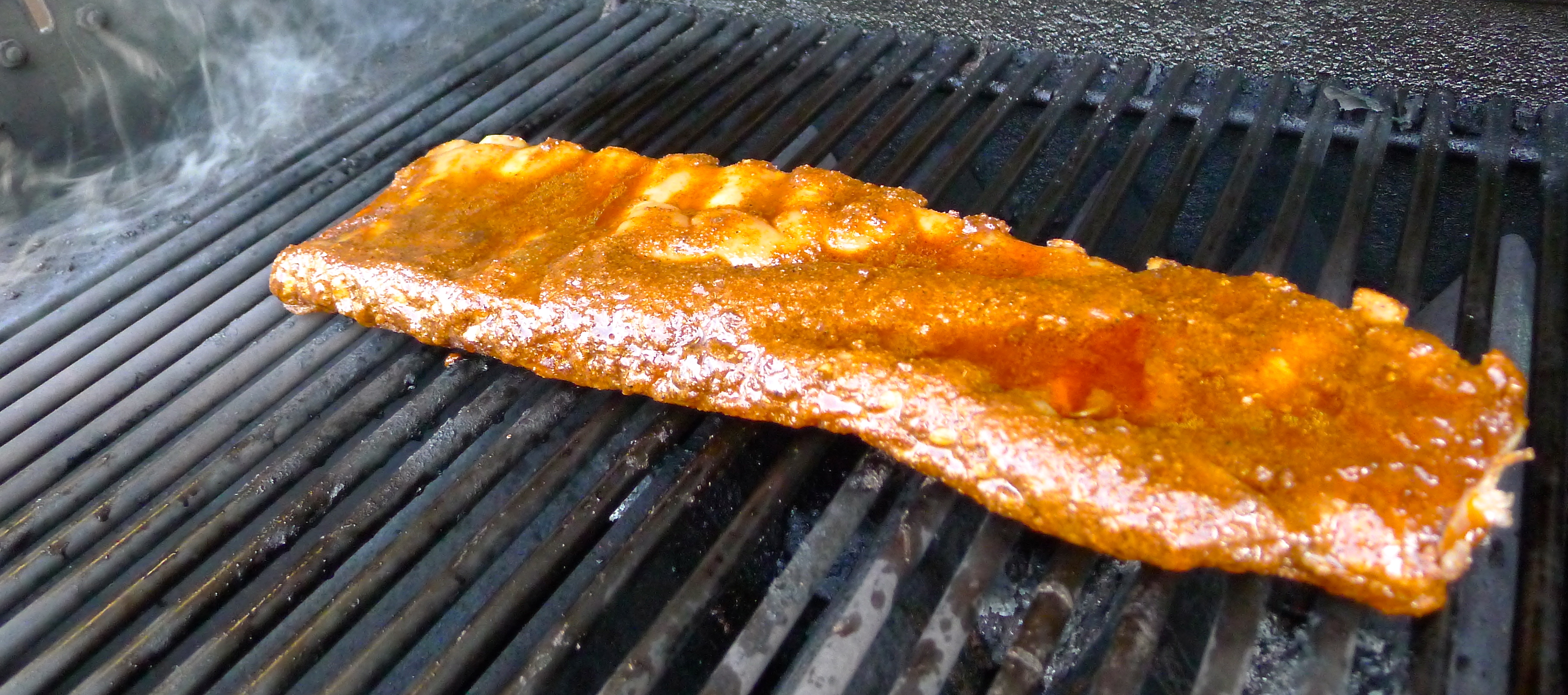 Not only had I not made ribs before, but I’d never smoked anything on the grill, either. I’d picked up a bag of smoker chips at some point, which John soaked in some beer for half of Sunday. A couple of hours before dinnertime, I pulled the foil-wrapped rack of ribs out of the fridge and set it on a baking sheet. I popped it in the oven at 300 degrees for an hour and a half- we’d finish them up on the grill. Don’t they already look fabulous?