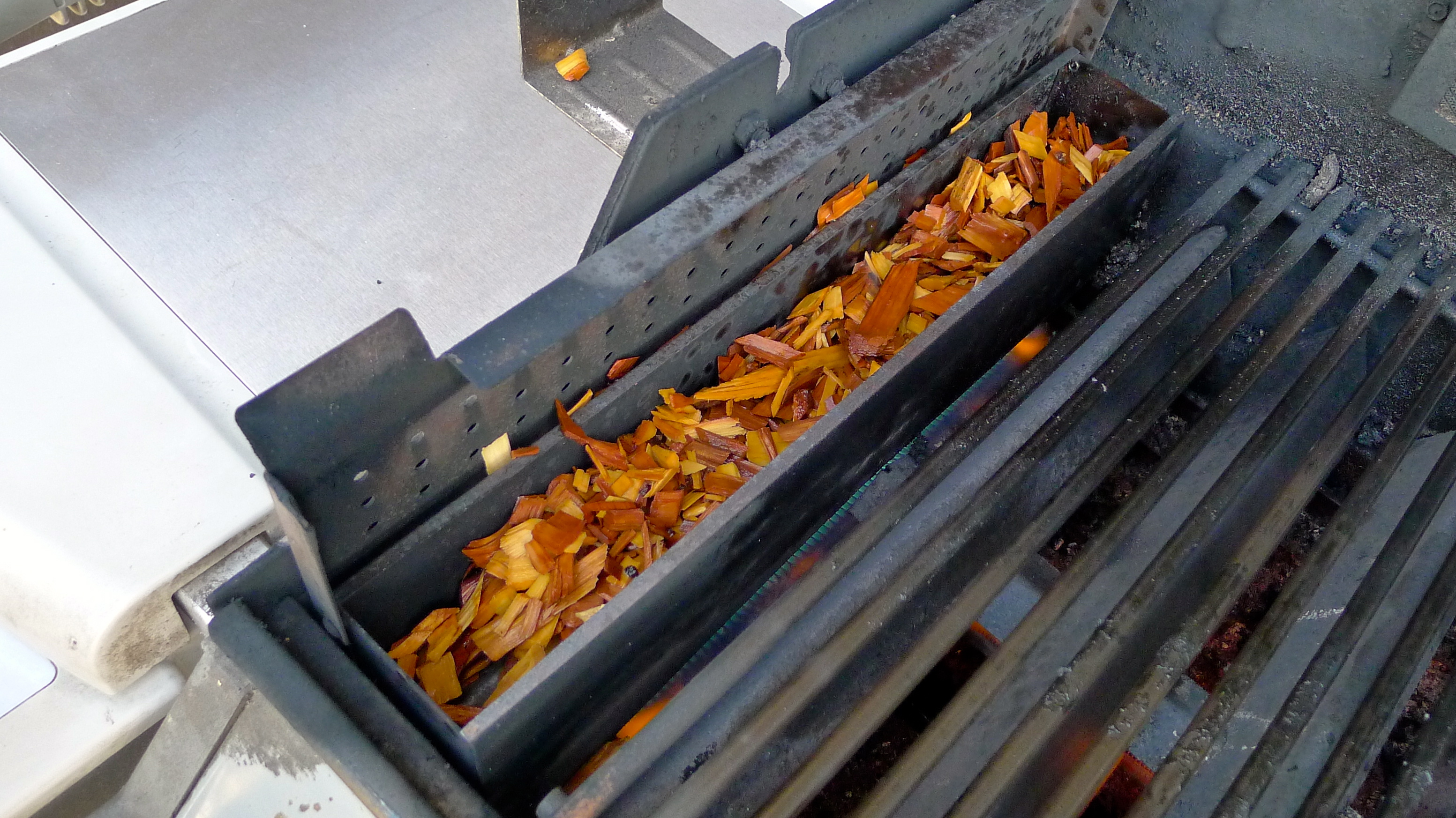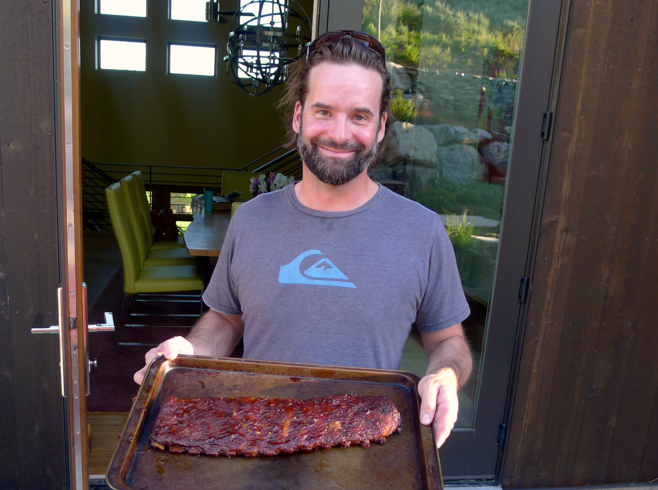 John’s grill has a little compartment specifically for smoking chips, so in they went. (You could also just put them on a little bed of foil on the grill itself.) He kept the grill at relatively low heat and we waited until we could see the smoke coming from the smoker chips to put the ribs on. John tended the ribs, occasionally flipping the rack and basting it with a jazzed-up store-bought BBQ sauce. In between basting time, we enjoyed the beautiful evening and watched the smoke billowing up toward the rooftop. Ahhhh… the smell of summer.