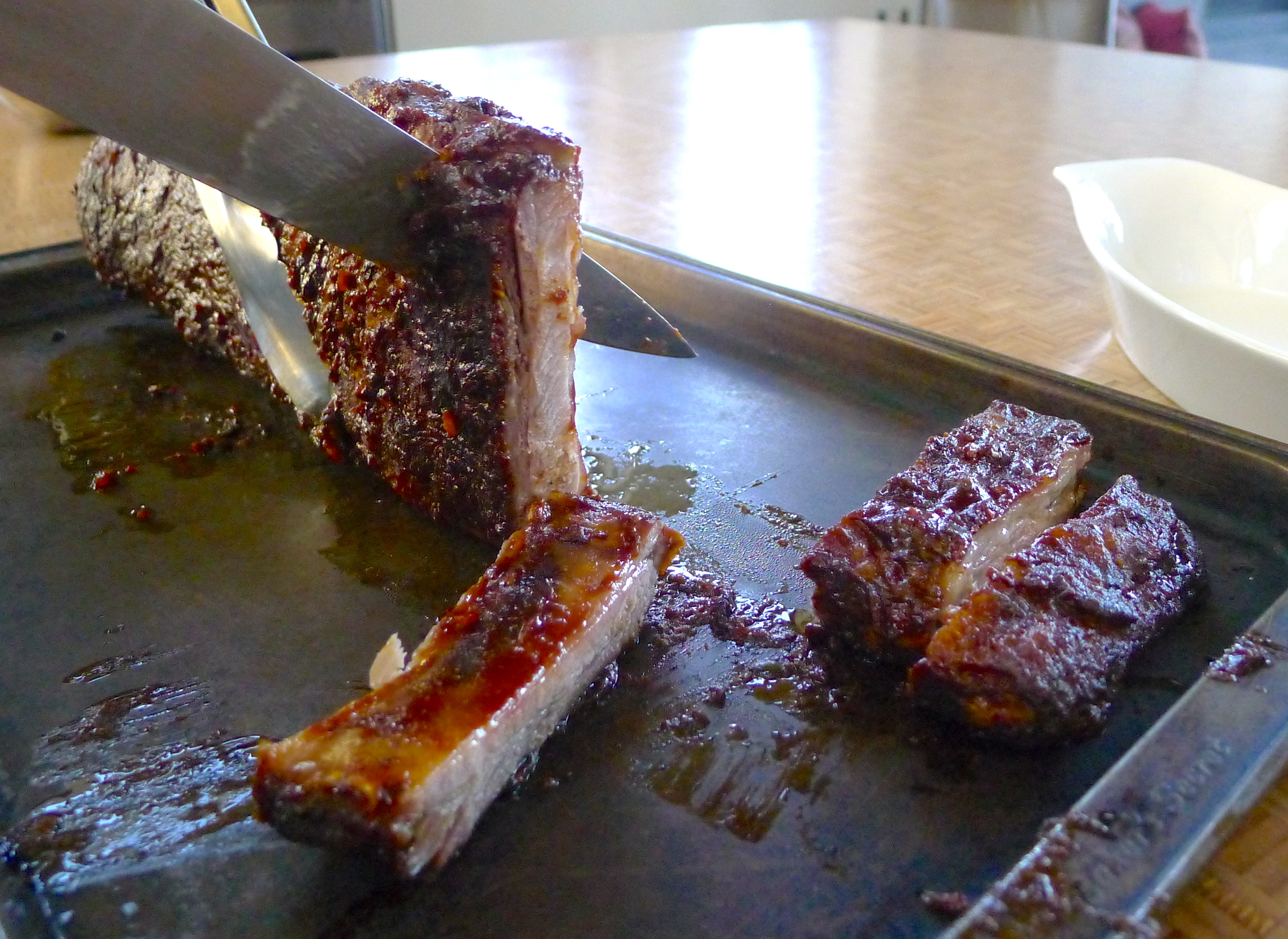 Oh, and the ribs? They were fantastic! The spare ribs were meaty and tender, with just a hint of smoky flavor. The dry rub worked some magic- a combination of sweet and spicy with the unexpected cinnamon notes. Truthfully, I don’t think the ribs needed the BBQ sauce at all, and next time, I’ll skip the basting on the grill and just serve the sauce on the side. The ribs were flavorful enough without the sauce, but it’s not really RIBS unless you get stuff all over your face while you eat, right? Once we started eating, the photo-taking ceased: these ribs are truly finger-licking good.