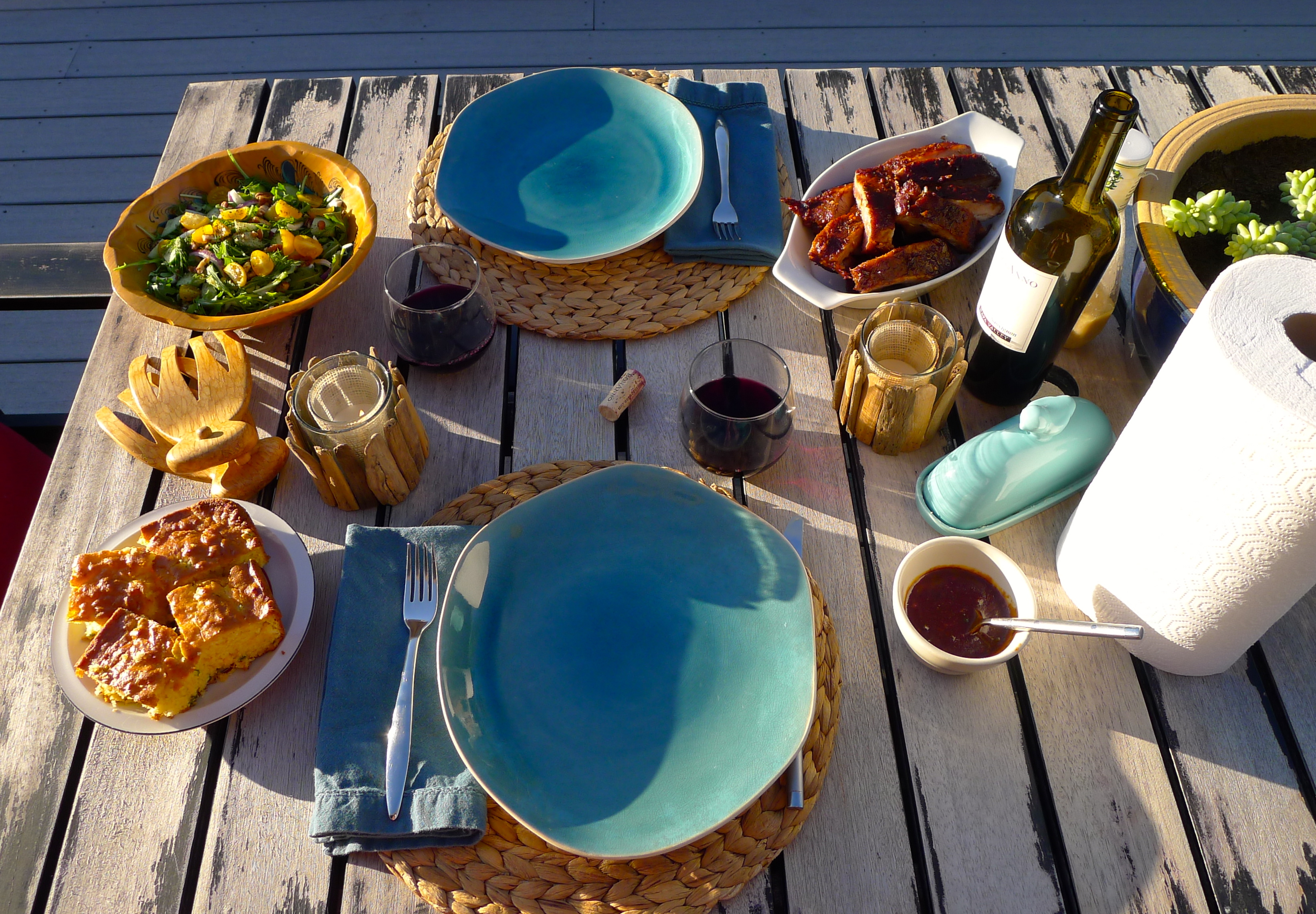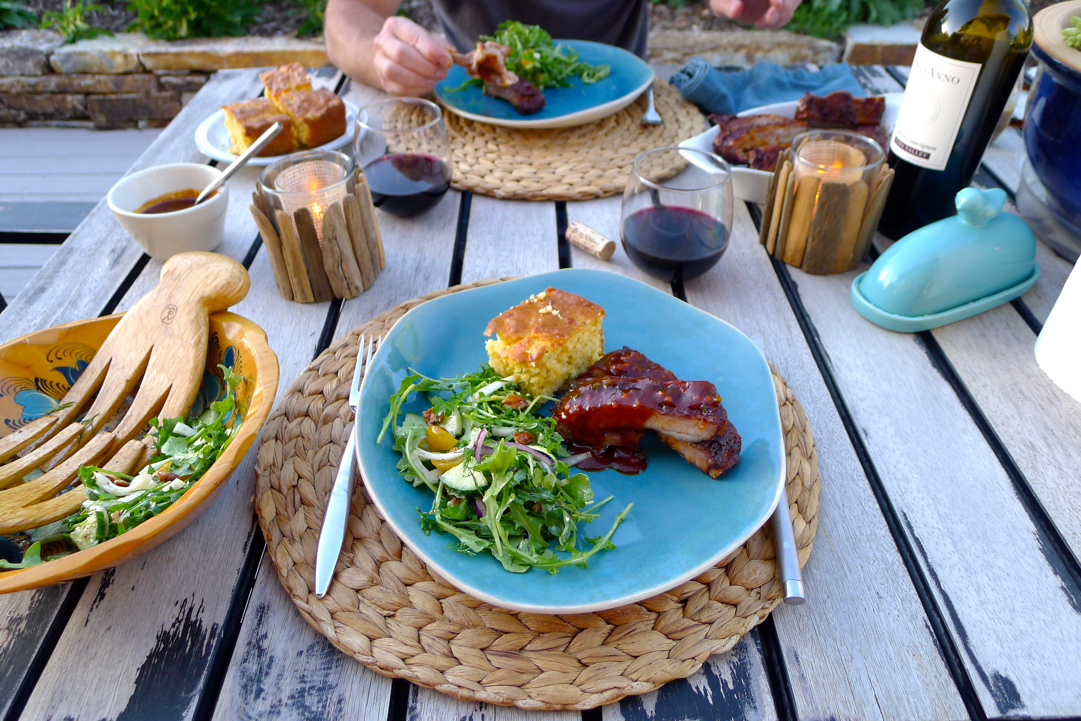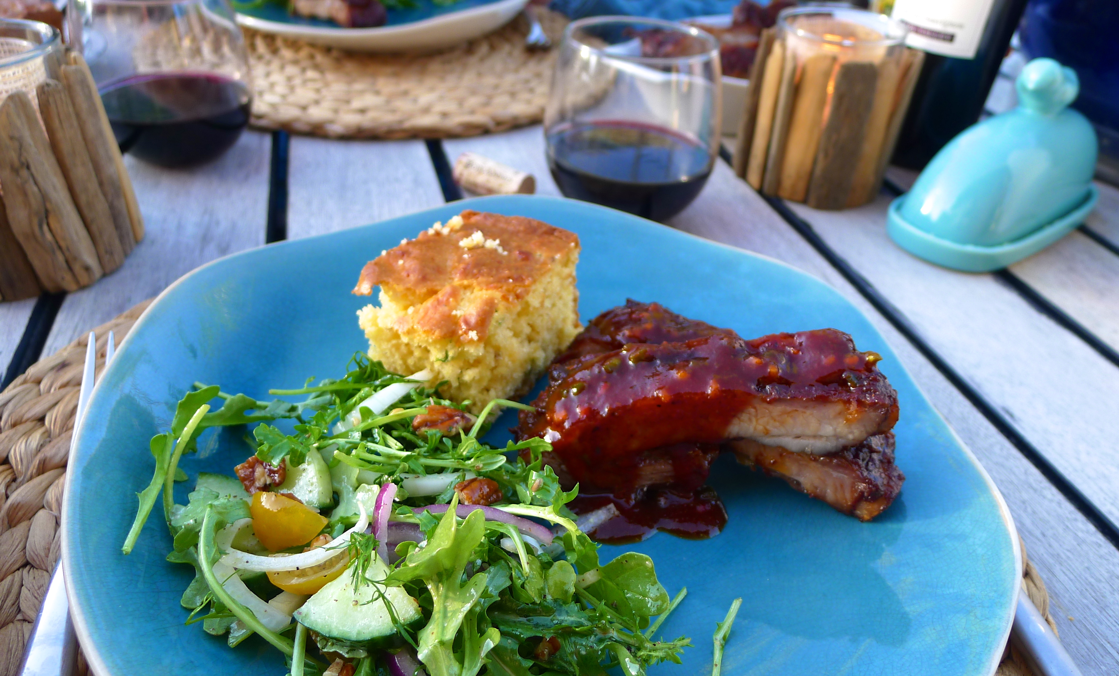 While John cut the ribs, I set the dining table outside. I served jalapeno-cheddar cornbread and a beautiful fresh salad with our smoked BBQ ribs. I set an extra roll of paper towels right next to the sticky sauce, just in case. We poured some good wine and dug into our al fresco feast, and Cholula alternated between chasing chipmunks and giving me the “pretty please drop something” eyes. I can’t imagine a more pleasant Sunday meal.