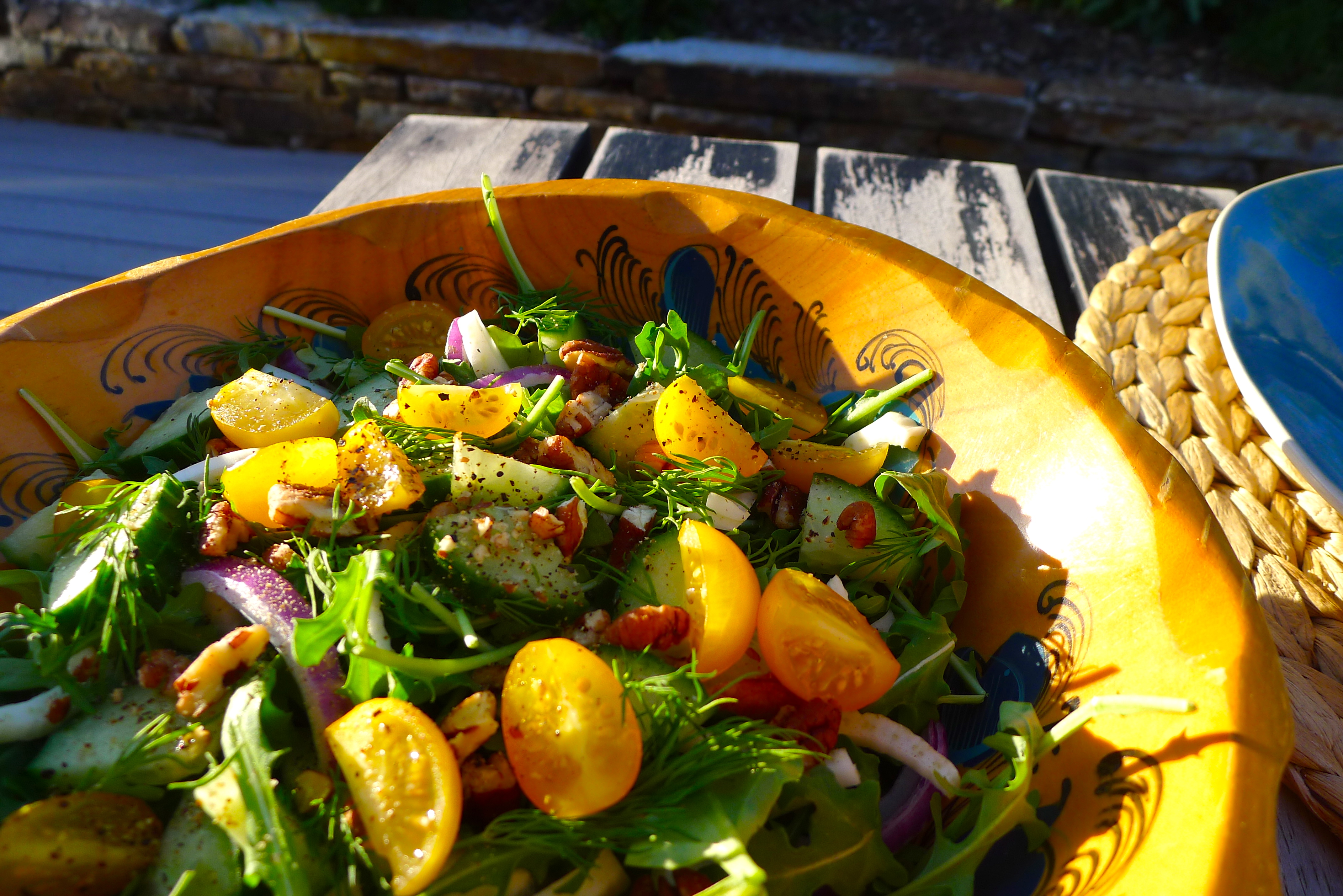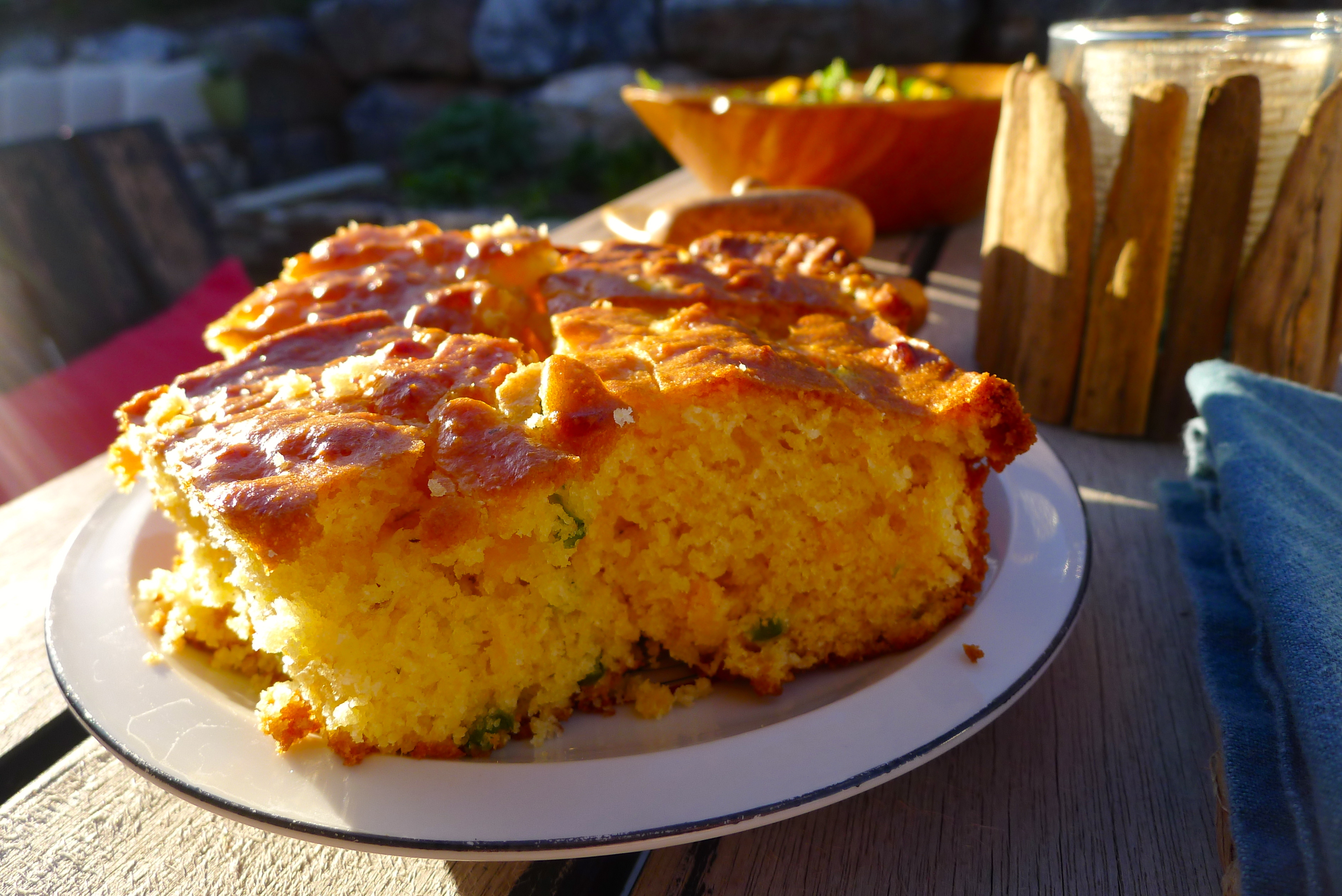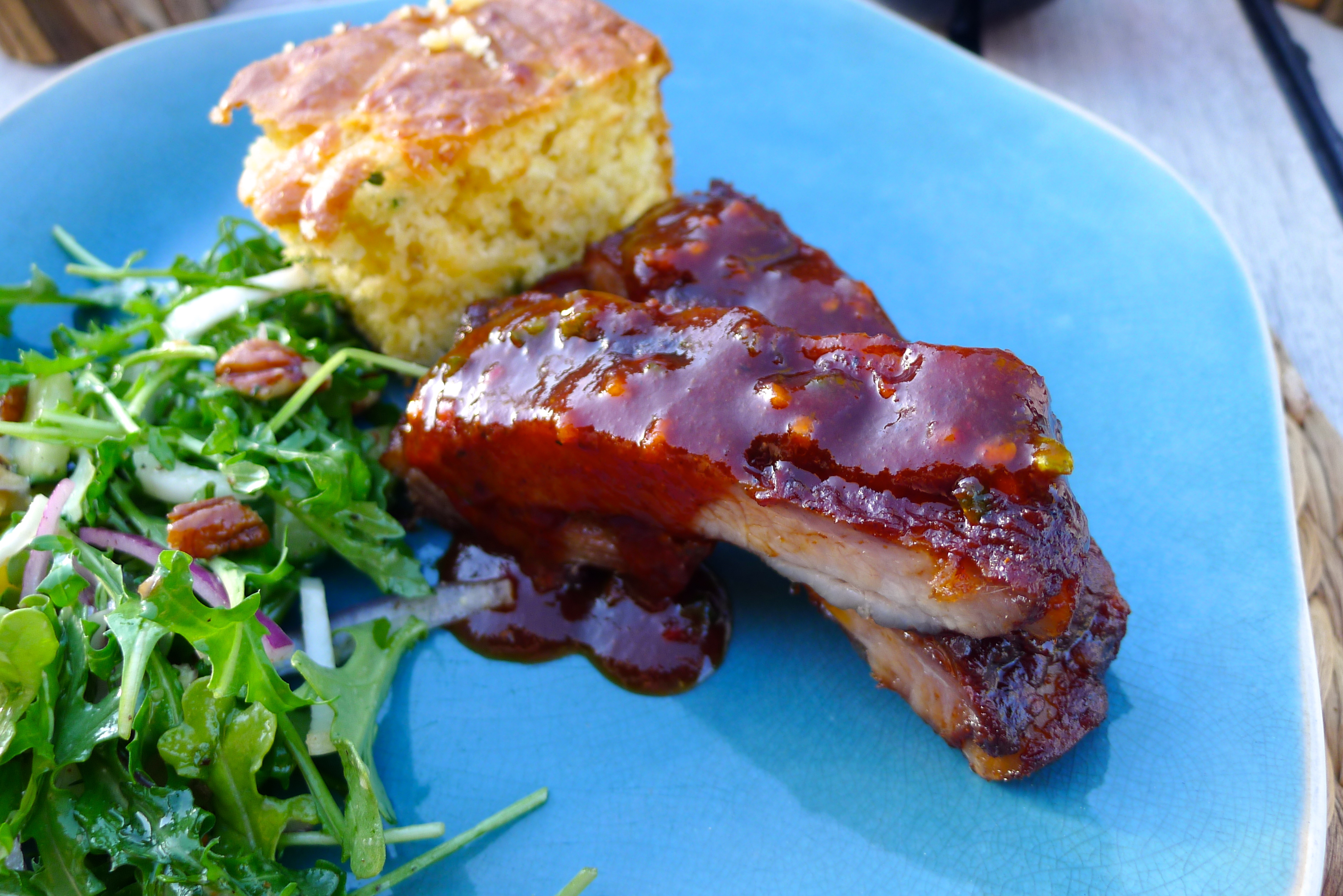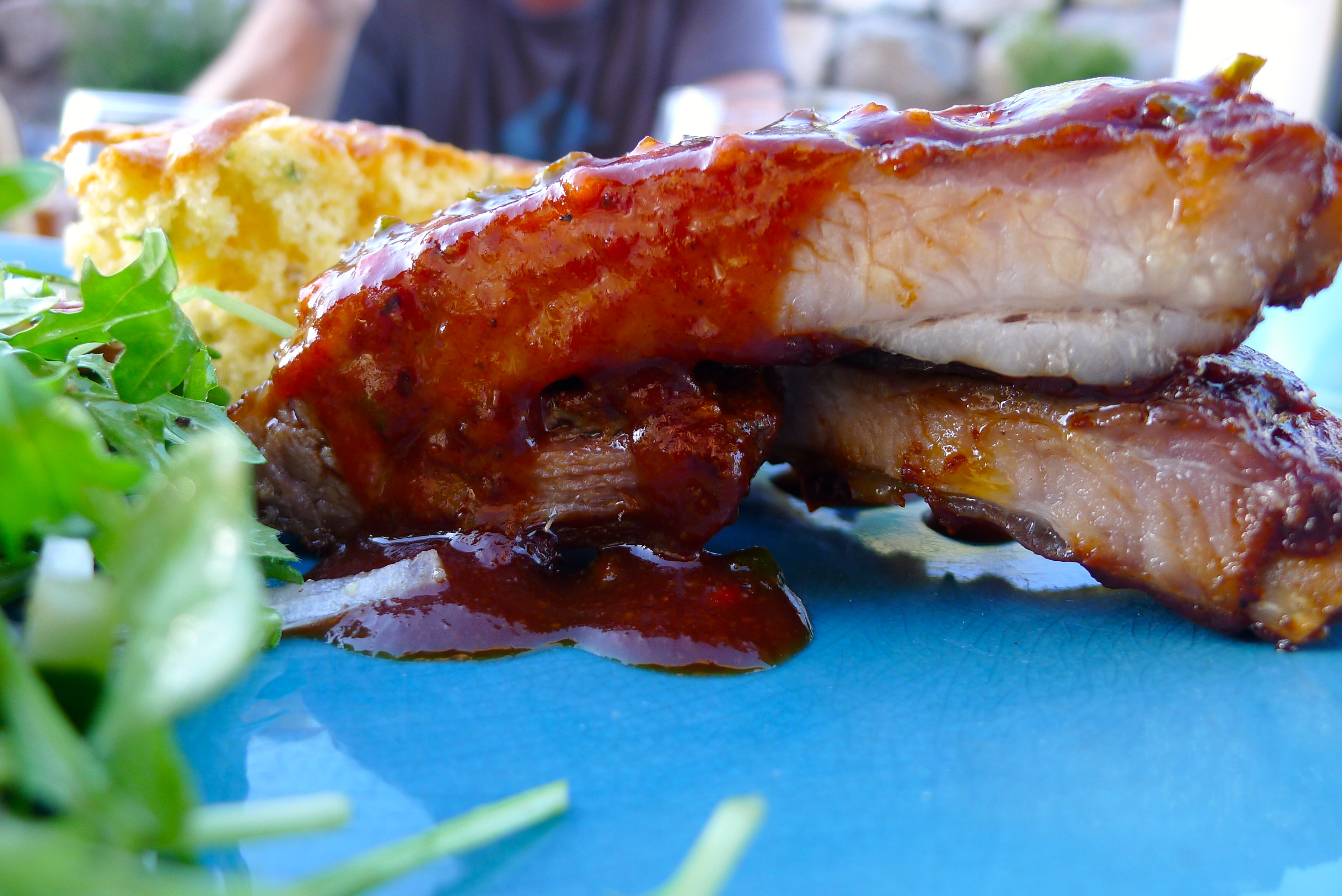 While John cut the ribs, I set the dining table outside. I served jalapeno-cheddar cornbread and a beautiful fresh salad with our smoked BBQ ribs. I set an extra roll of paper towels right next to the sticky sauce, just in case. We poured some good wine and dug into our al fresco feast, and Cholula alternated between chasing chipmunks and giving me the “pretty please drop something” eyes. I can’t imagine a more pleasant Sunday meal.