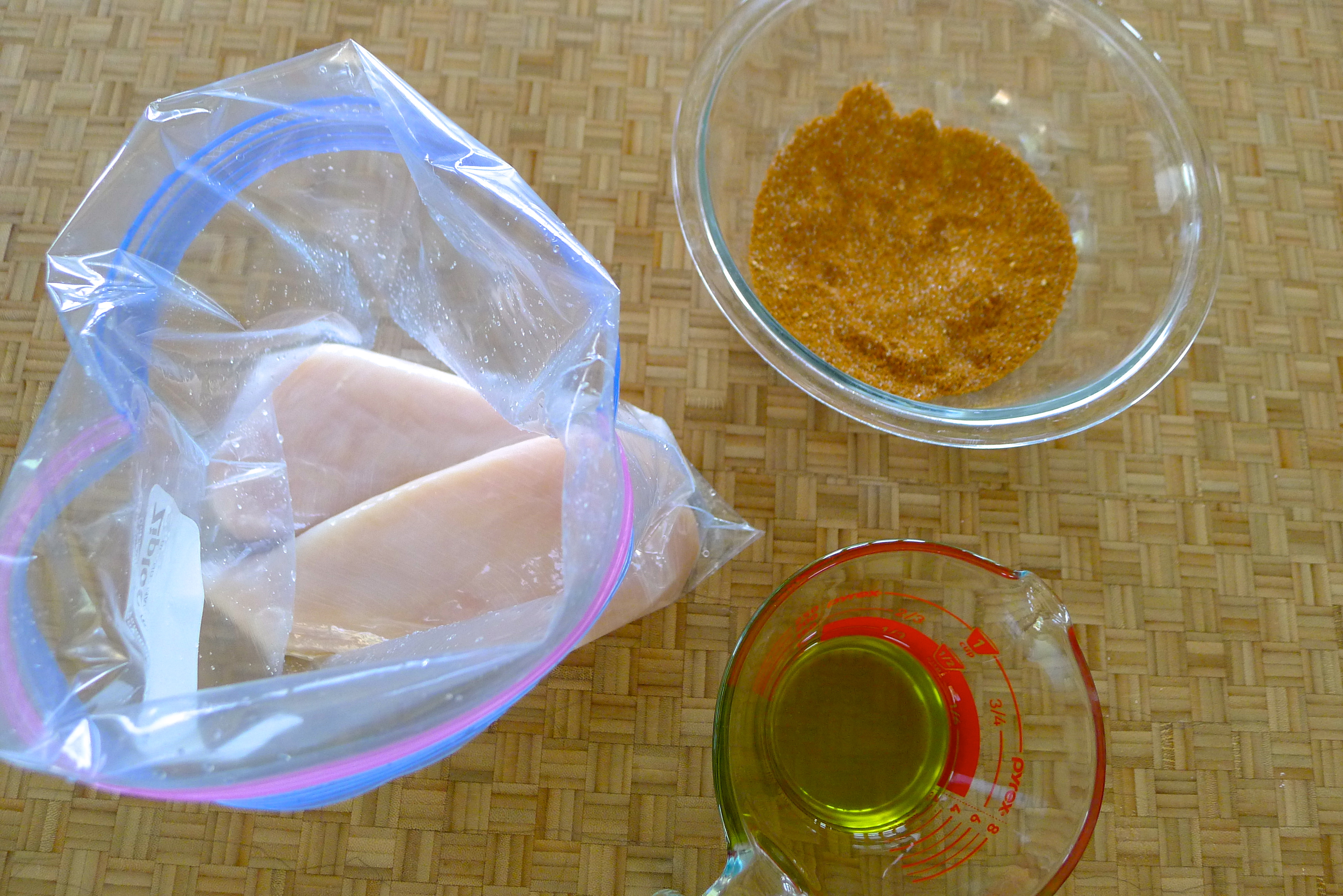 In a bowl, combine all of the spices. Place chicken breasts in a large plastic bag. Add oil, garlic cloves, and spice mixture. Rub well to coat all sides of the chicken. Allow to marinate in the refrigerator for at least an hour (more is better).