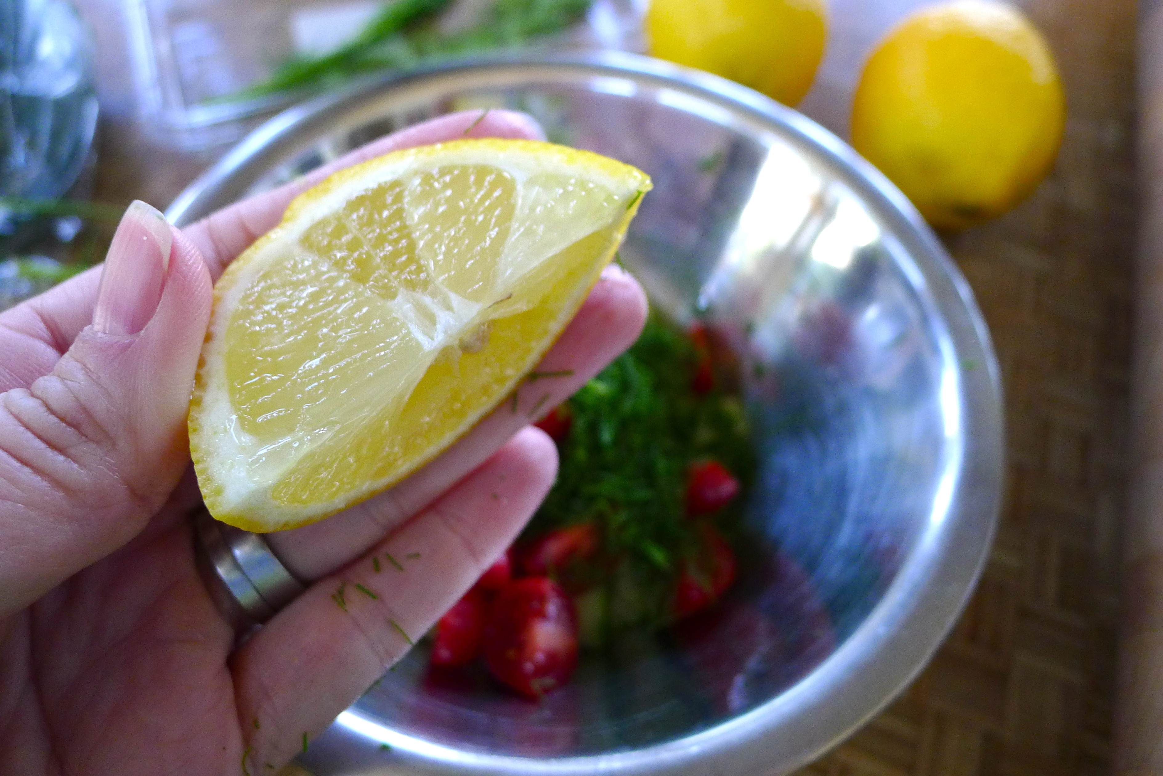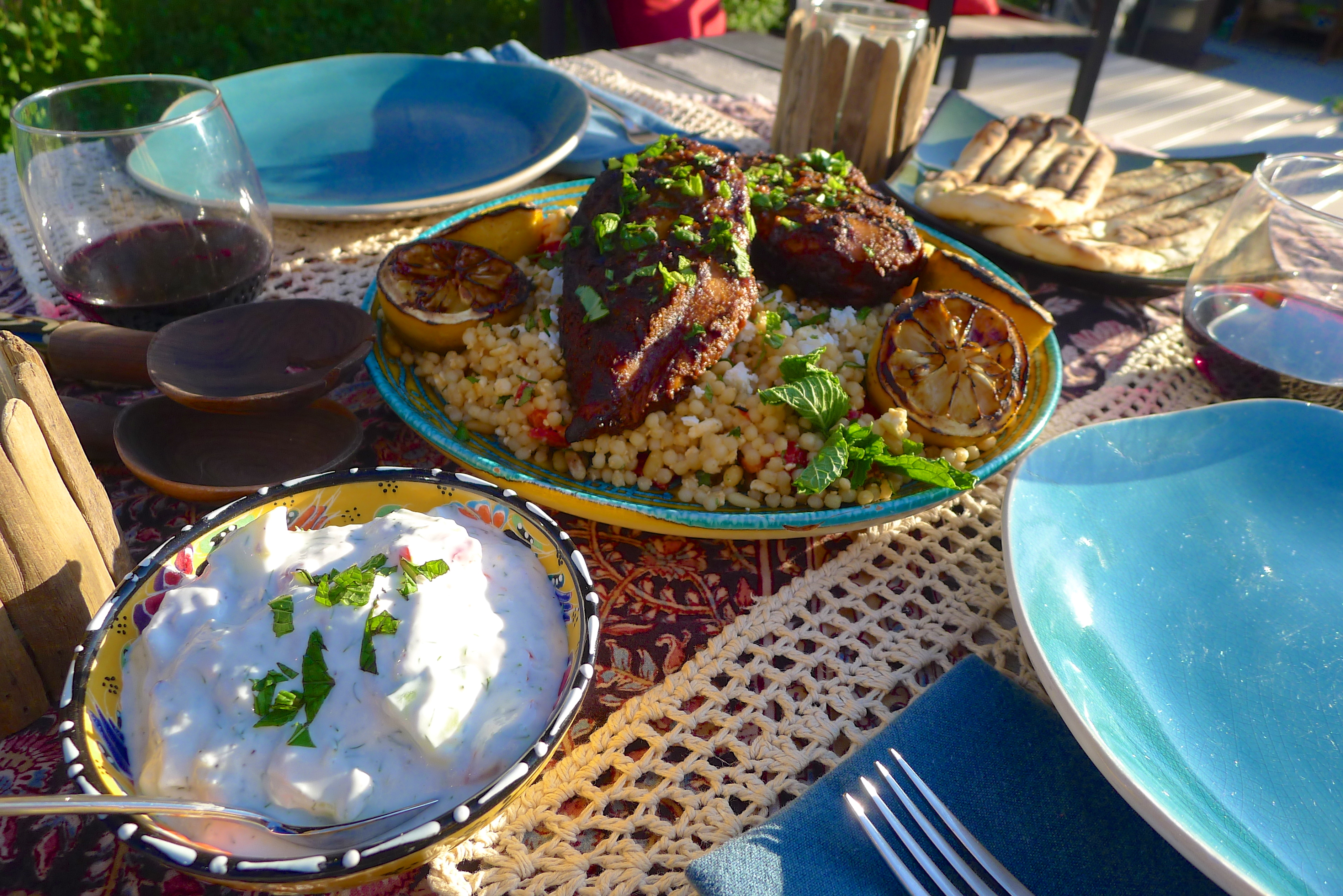 Grill the chicken breasts on high heat, basting often with the leftover marinade. When the chicken is almost grilled through, place the lemons on the grill, juicy side down, until they get a nice char. Serve with herbed couscous salad, cucumber-dill sauce, and warm naan. Cheers to warm summer days that make you forget how long winter is. YUM.